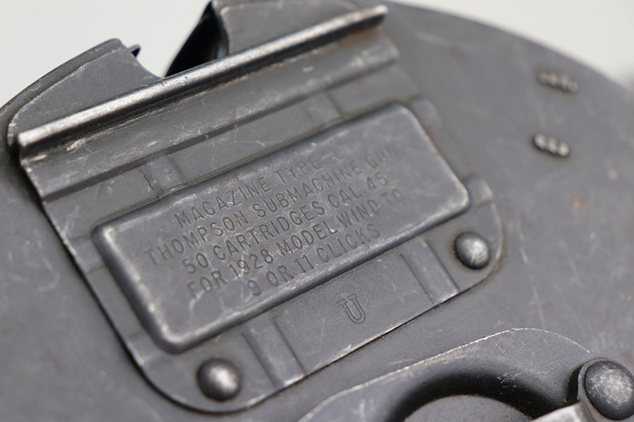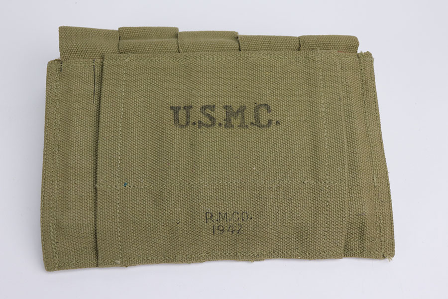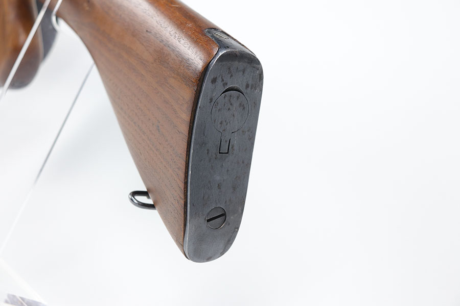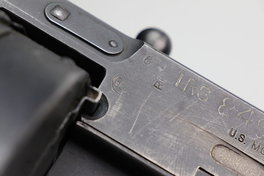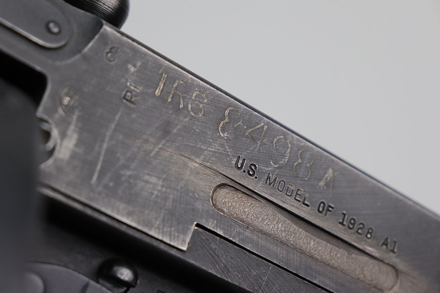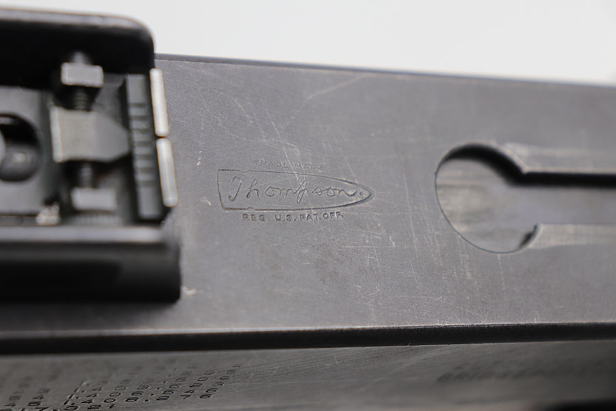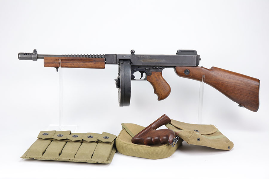 1/14/21 – This is an interesting Thompson SMG US Model 1928 A1, manufactured by Auto-Ordnance. Original serial was milled from receiver & it currently bears the reissued number with the IRS prefix. Terminated w/ Cutts compensator marked w/ Thompson bullet logo “Auto-Ordnance Corporation” & patent dates. Horizontal wood forearm. Sights are front blade integral w/ compensator & rear is adj. Lyman graduated sight. Hardwood, rear stock includes trapdoor w/ metallic oil can. Slotted top mounted cocking knob. Excellent parkerized finish on metal parts. Comes with one 50 round drum mag, and five 20rd stick mags. Terrific bore. Wood parts in excellent condition with no cracks or chips. UNATTACHED ACCESSORIES: 1 wood vertical pistol grip w/ hardware, brass cleaning rod, spare Blish lock & sling mounting hardware. / 1 Faded green canvas L drum pouch. / 2 Green canvas U.S.M.C., 1944 dated, 30 rd. pouches, 3 mag. capacity each. / 1 Canvas pouch that holds 100 rds. in 5 mags., marked “U.S.M.C” dated 1942. / Additional pouch, possibly WWI era shotgun ammo pouch. NATIONAL FIREARMS ACT SMG REQUIRING BATF TRANSFER BEFORE TAKING POSSESSION. FULLY TRANSFERABLE.