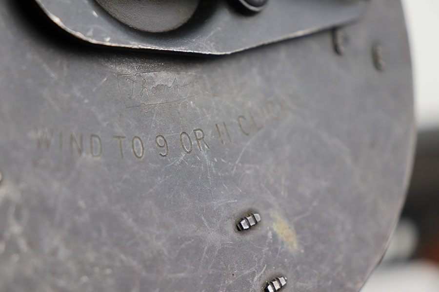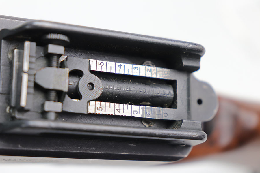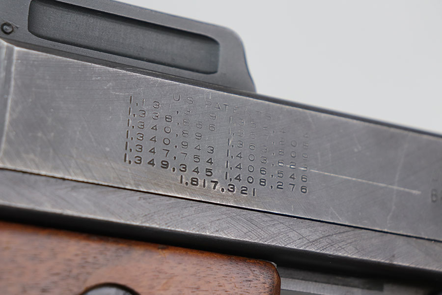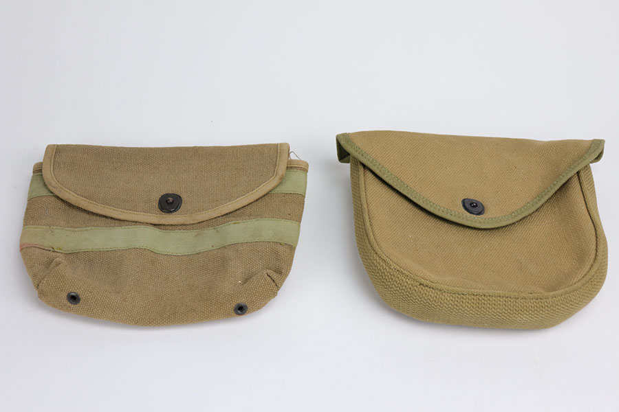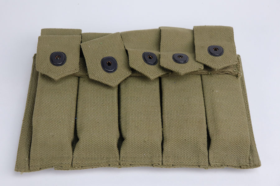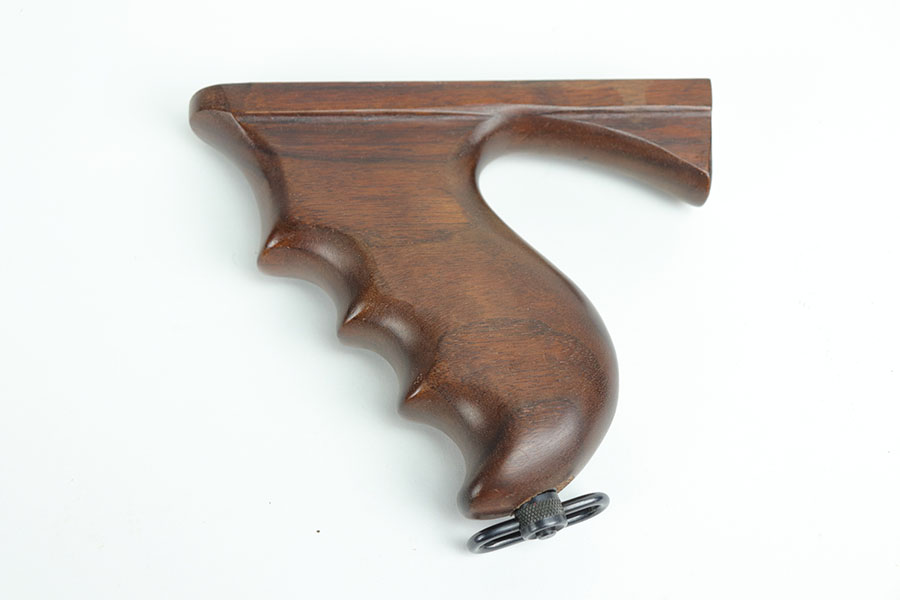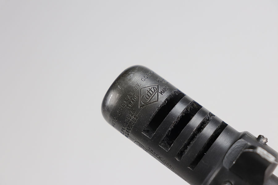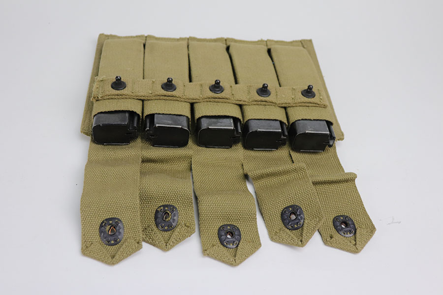1/14/21 – This is an interesting Thompson SMG US Model 1928 A1, manufactured by Auto-Ordnance. Original serial was milled from receiver & it currently bears the reissued number with the IRS prefix. Terminated w/ Cutts compensator marked w/ Thompson bullet logo “Auto-Ordnance Corporation” & patent dates. Horizontal wood forearm. Sights are front blade integral w/ compensator & rear is adj. Lyman graduated sight. Hardwood, rear stock includes trapdoor w/ metallic oil can. Slotted top mounted cocking knob. Excellent parkerized finish on metal parts. Comes with one 50 round drum mag, and five 20rd stick mags. Terrific bore. Wood parts in excellent condition with no cracks or chips. UNATTACHED ACCESSORIES: 1 wood vertical pistol grip w/ hardware, brass cleaning rod, spare Blish lock & sling mounting hardware. / 1 Faded green canvas L drum pouch. / 2 Green canvas U.S.M.C., 1944 dated, 30 rd. pouches, 3 mag. capacity each. / 1 Canvas pouch that holds 100 rds. in 5 mags., marked “U.S.M.C” dated 1942. / Additional pouch, possibly WWI era shotgun ammo pouch. NATIONAL FIREARMS ACT SMG REQUIRING BATF TRANSFER BEFORE TAKING POSSESSION. FULLY TRANSFERABLE.