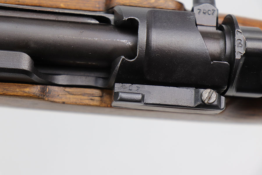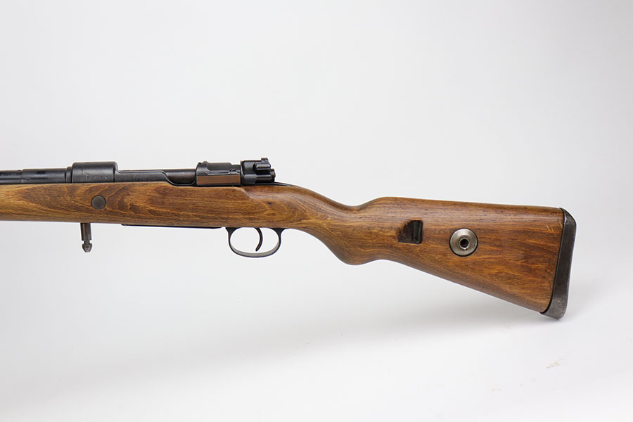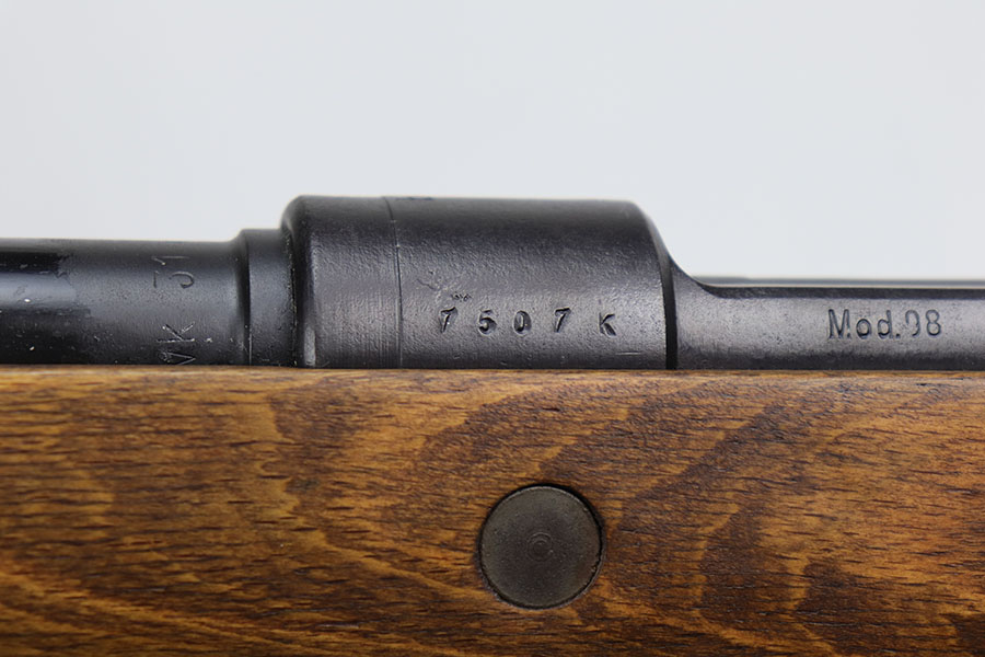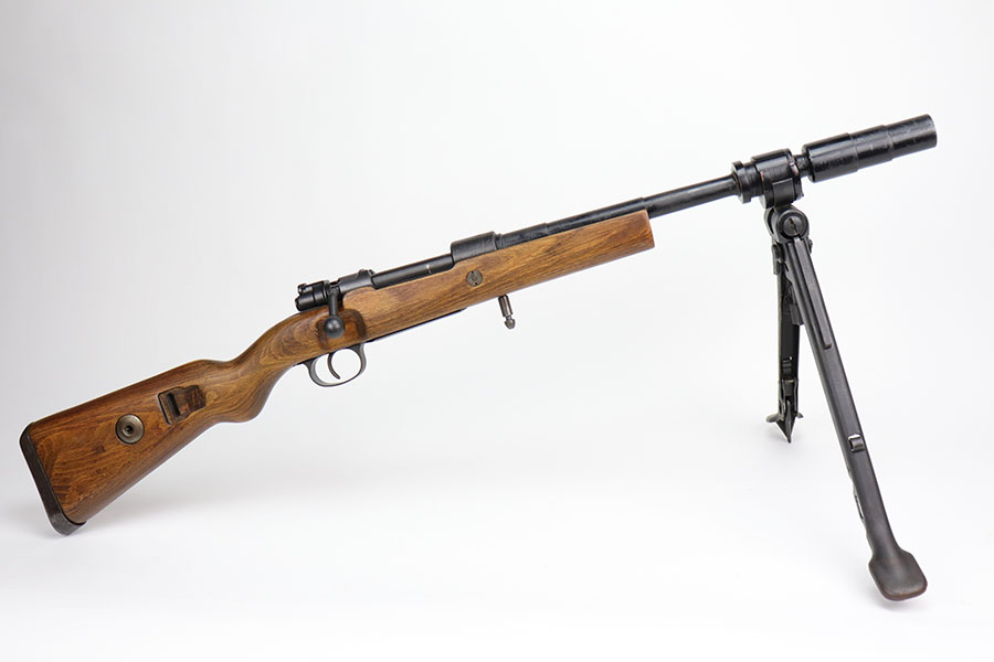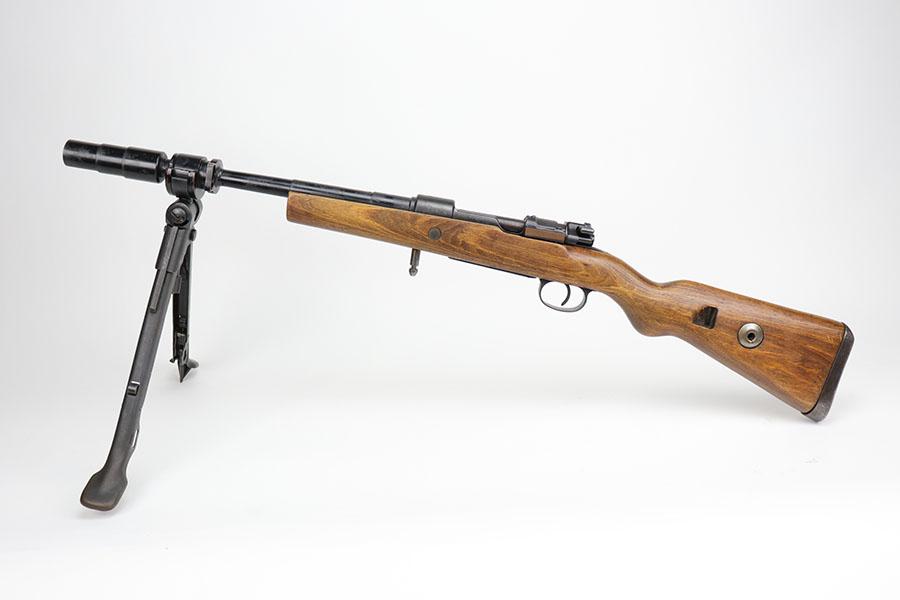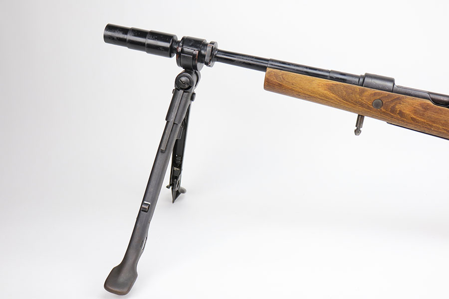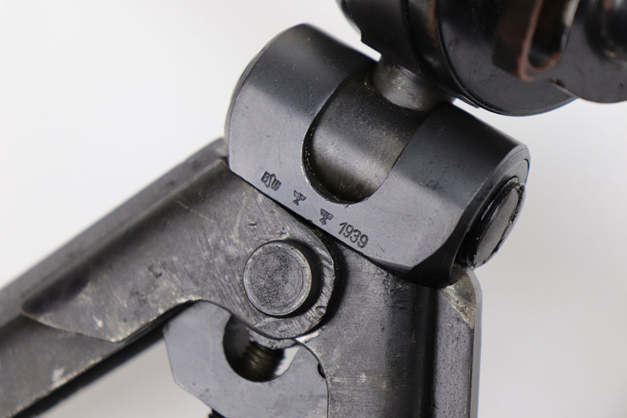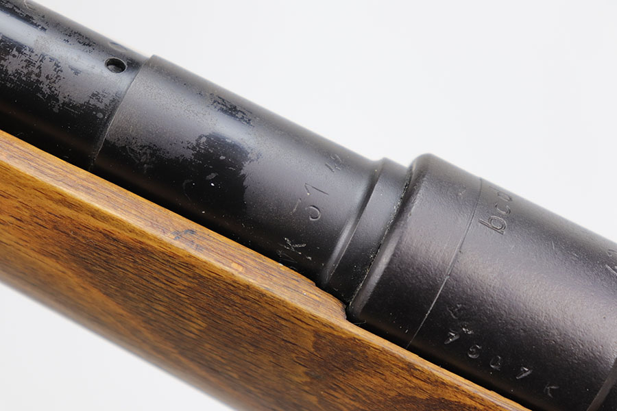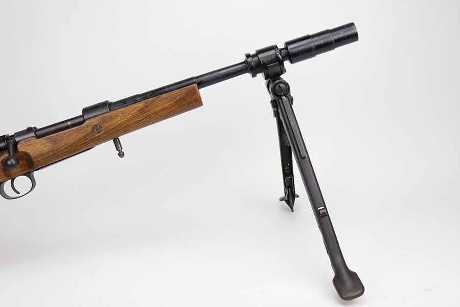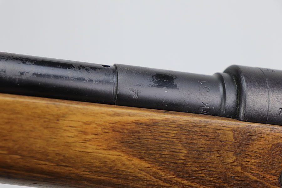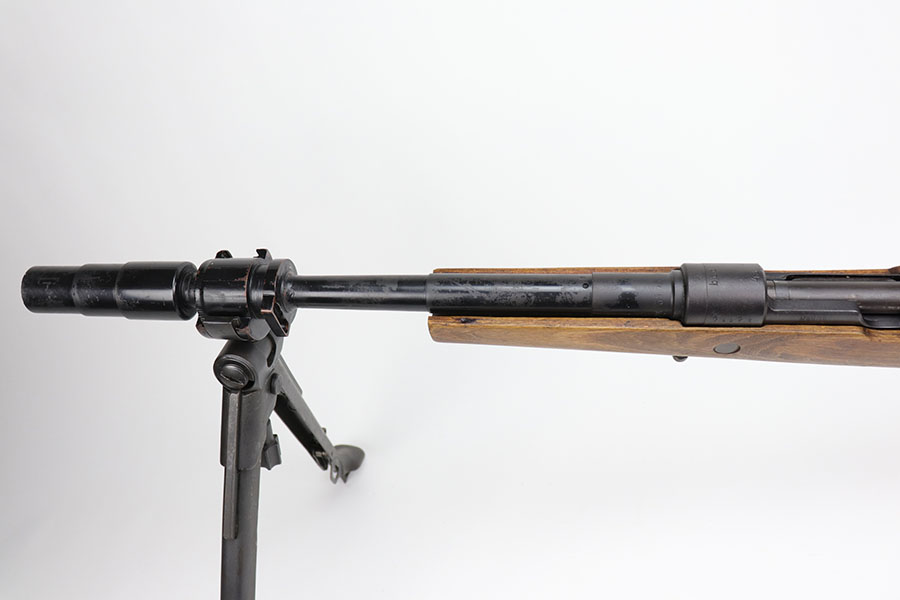 12/3/20 – This is a very interesting and potentially rare Nazi K98 in grenade launcher configuration, the first of its kind that we’ve encountered or offered. The base rifle was made in 1943 at the Gustloff-Werke factory and all numbers match with clear Heer Army waffenamt on stock. But as you’ll see, the rifle has been modified with original grenade launcher and bi-pod built directly into the barrel. The bi-pod is 1939 dated with maker mark and waffenamt. The barrel and launcher have that black enamel paint finish, similar to the S.A.C.M. 1935A. The finish on the original metal parts was redone at some point, too. Stock is in excellent condition. The bore is pitting and frosted throughout, perhaps facing extra corrosive material when used for launching. Overall a super cool and unique piece.