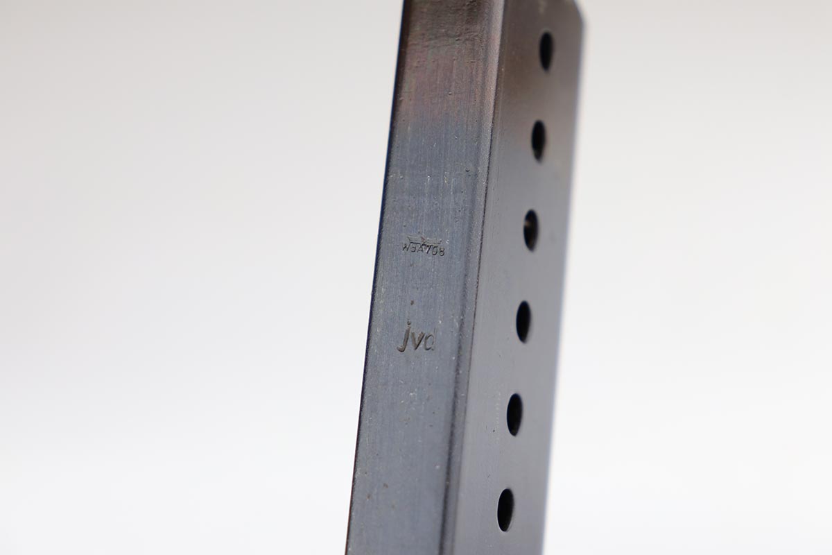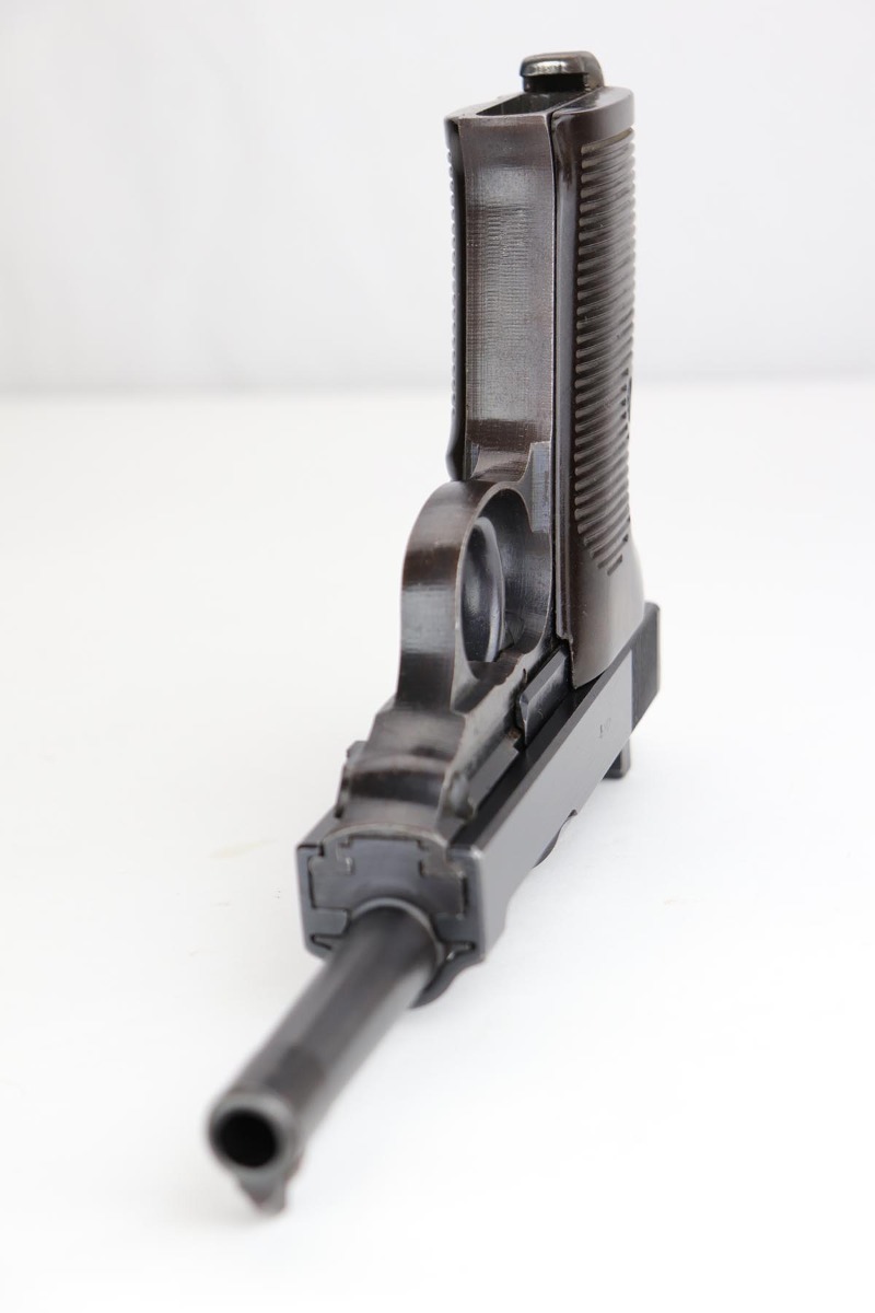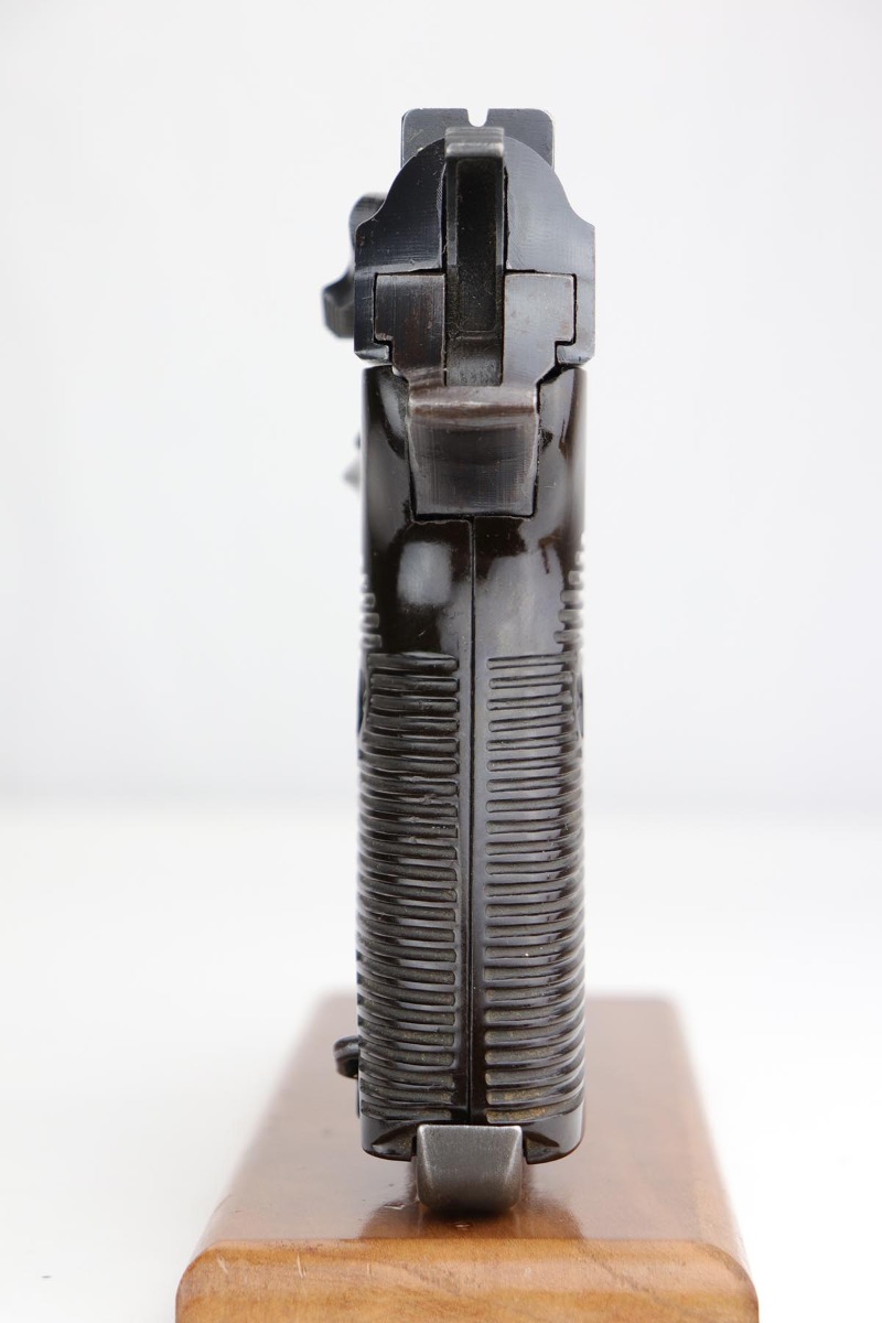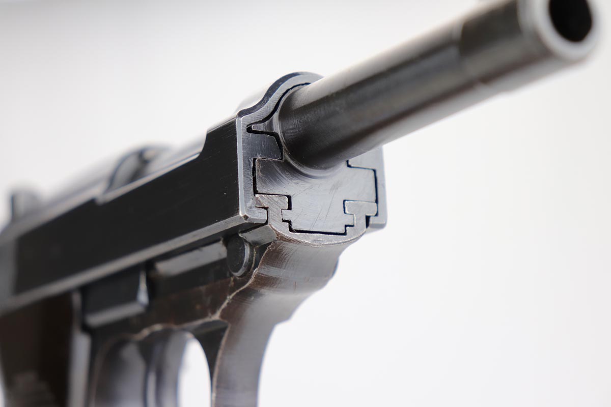 10/11/19 – This is a super interesting example of a known P.38 variation from the very end of the war. The pistol has no serial, and was assembled from remaining parts at the end of the war. The frame is ‘ac’ proofed with the Walther inspection mark, and the locking block is also Walther. The slide and barrel are Mauser marked, with ‘byf 44’ on the left side of the slide, but again, no serial. The right side of the slide doesn’t have the third firing proof, denoting it never passed all the way through parts inspection. The gun has minimal wear, just minor thinning of the front strap and a little bit of finish loss on the top plate. Bore is near-mint. Terrific brown grips.