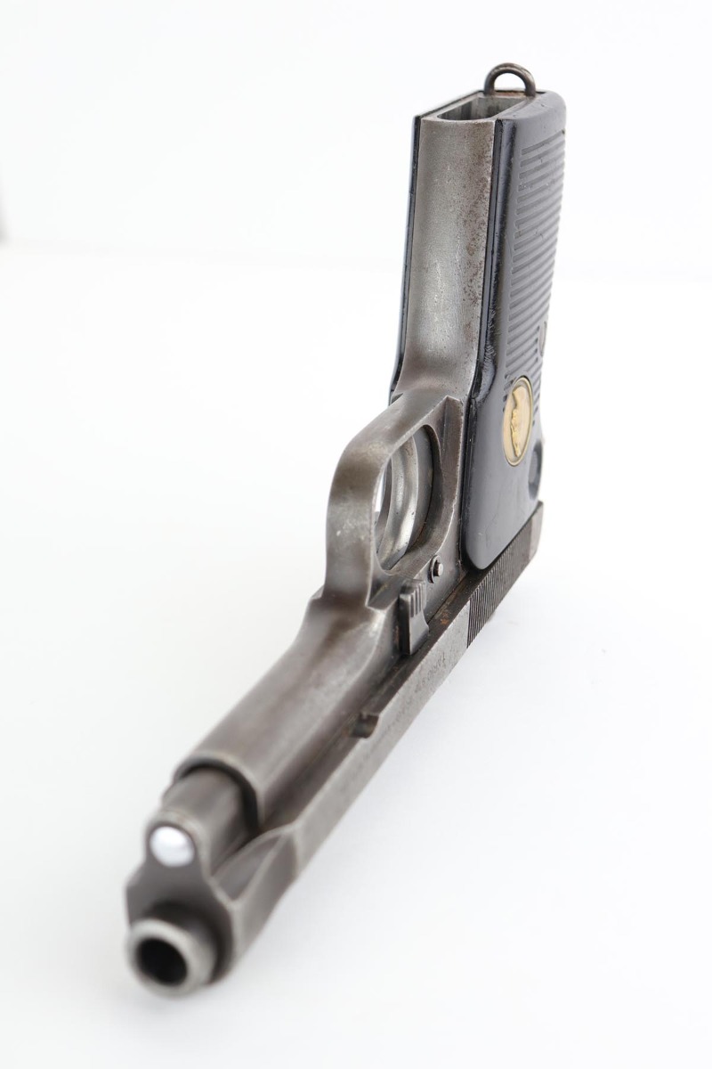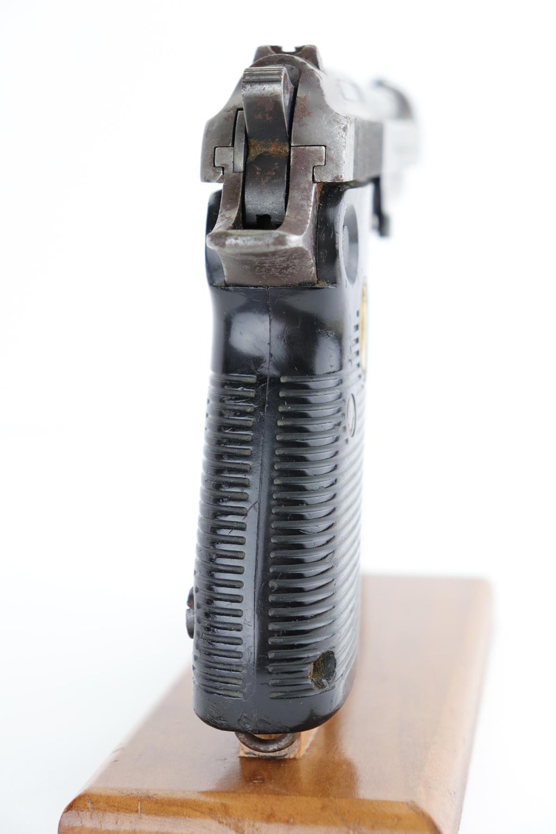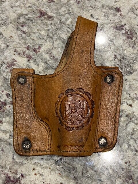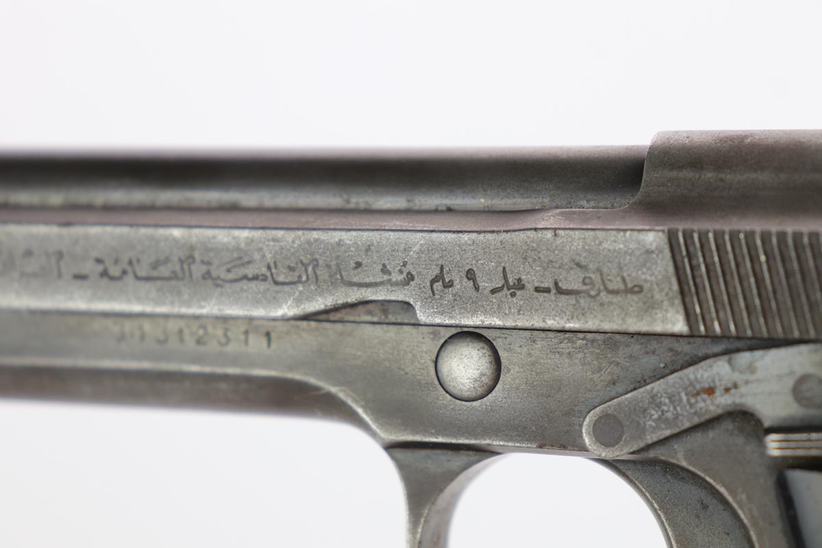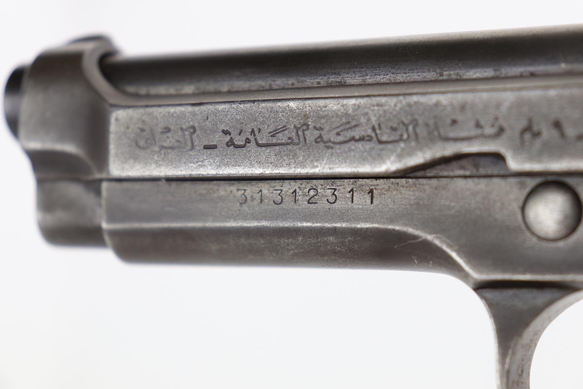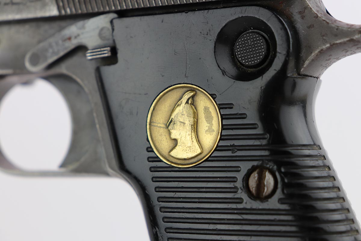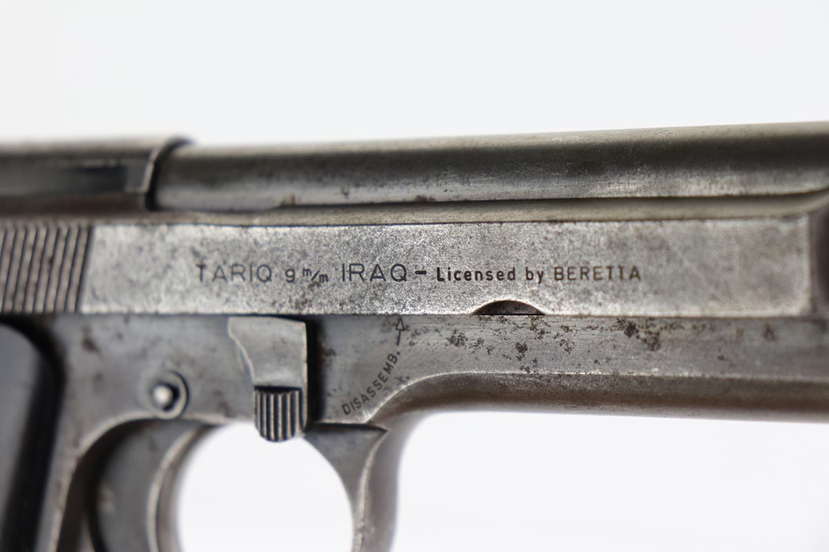 11/3/20 – This is a rare 9mm Iraqi Tariq pistol, a license built copy of the Beretta M1951 pistol. Al-Qadisiyyah Establishments were responsible for Iraqi production under the license. It has a blued finish which is obviously worn throughout.  The slide also has some oxidation, which is most pronounced on the right side of the slide. Grips are in good shape and the bore is excellent. These pistols were carried by the Iraqi Republican Guard. The unique grips featuring General Tariq ibn Ziyad’s profile on opposing medallions on the pistols grips. General Tariq was the conqueror of Visigoth Spain in 711 AD. Comes with a scarce holster that appears correct for the gun as it fits and has the Iraqi national crest on it.
