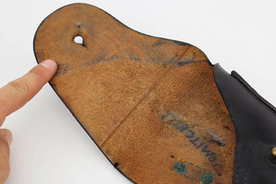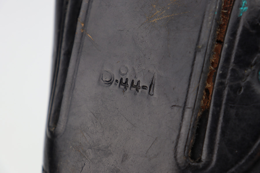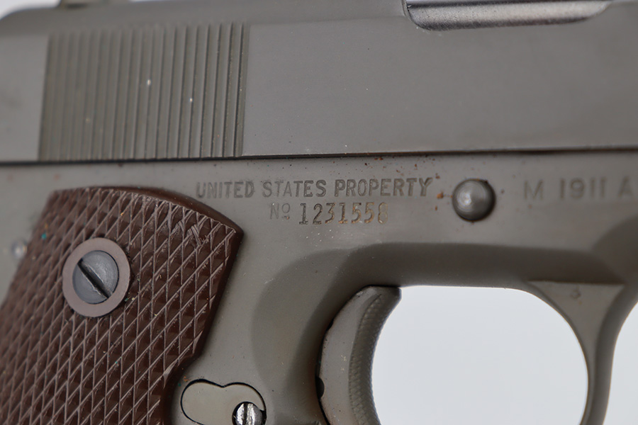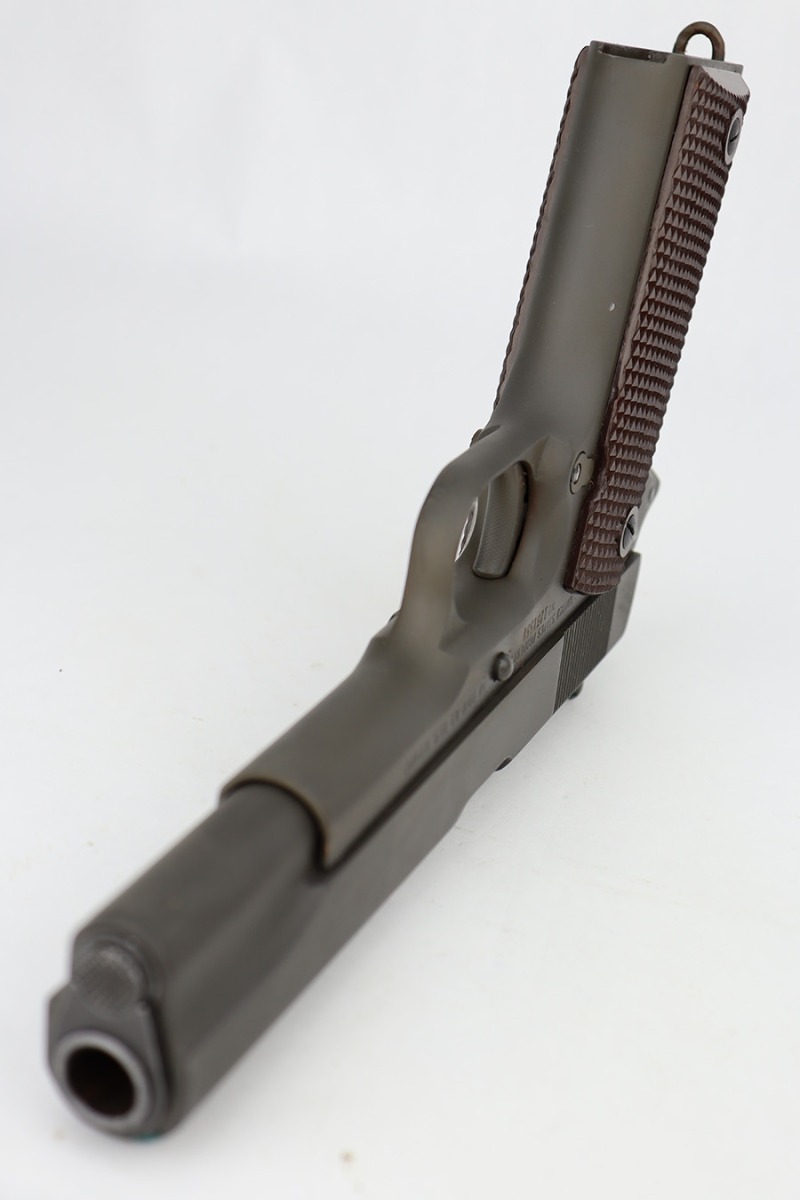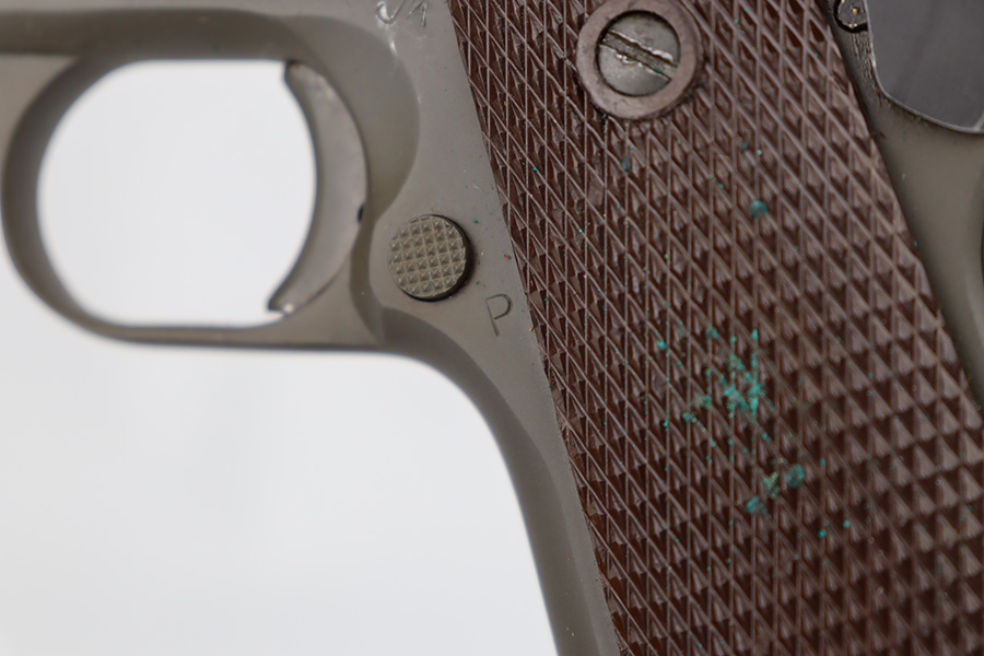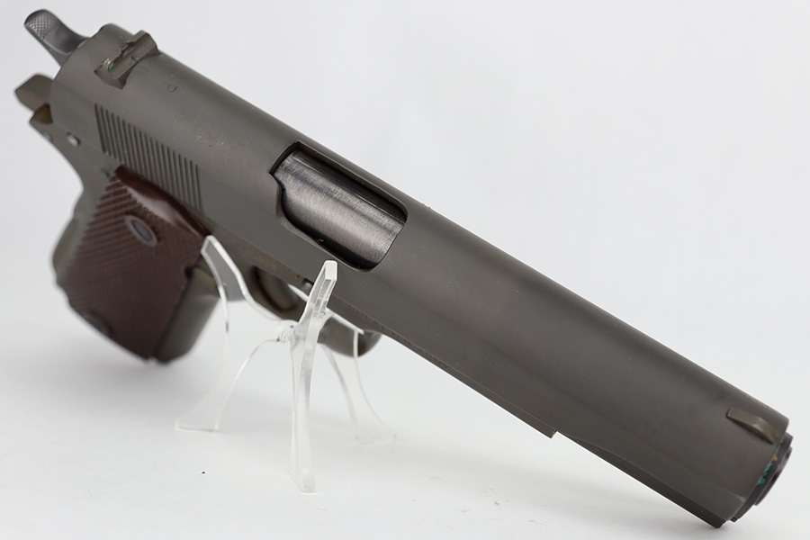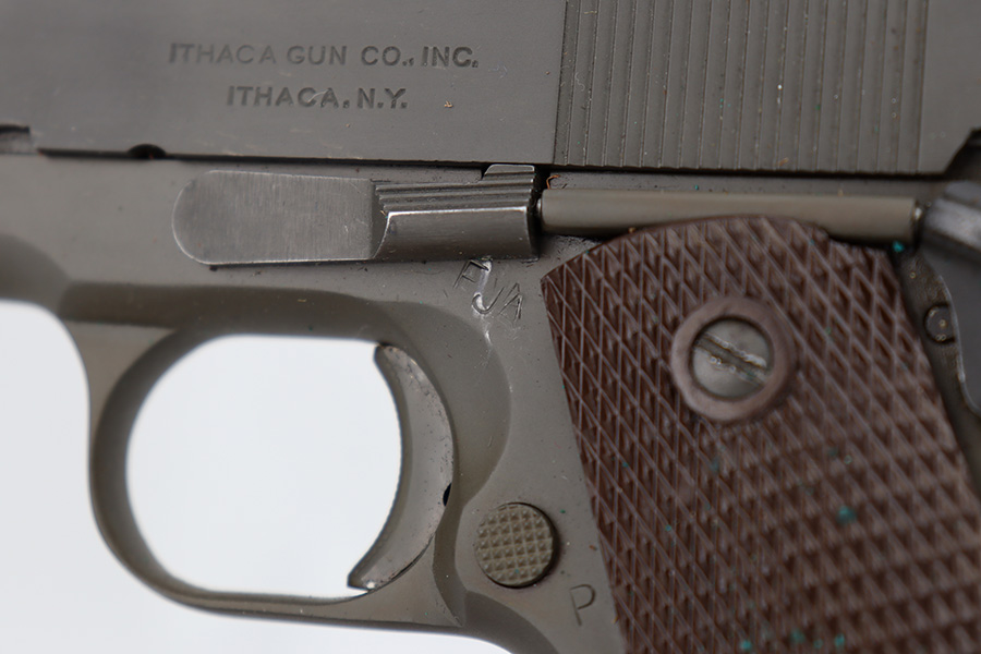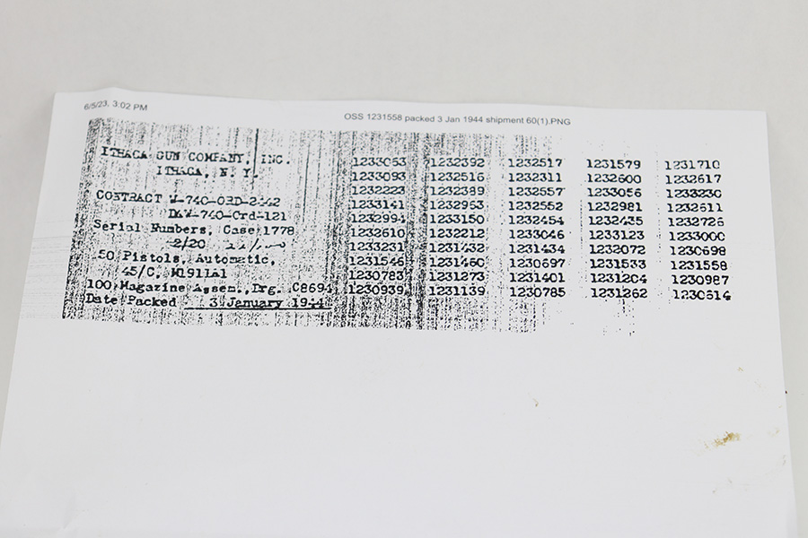 6/14/23 – This is a rare Ithaca 1911A1 from late in 1943 that was issued to the O.S.S. It is recorded by serial number on the O.S.S. manifest of pistols shipped on January 3rd of 1944. The pistol has Ithaca frame and slide with proper HS barrel, but the gun has been re-parkerized. Bore has strong rifling but some frost in the grooves. Excellent grips. Magazine marked with ‘S’ on toe.