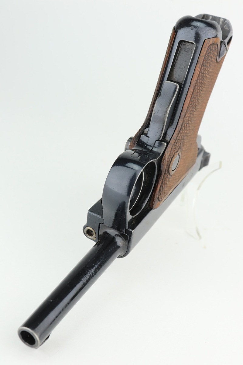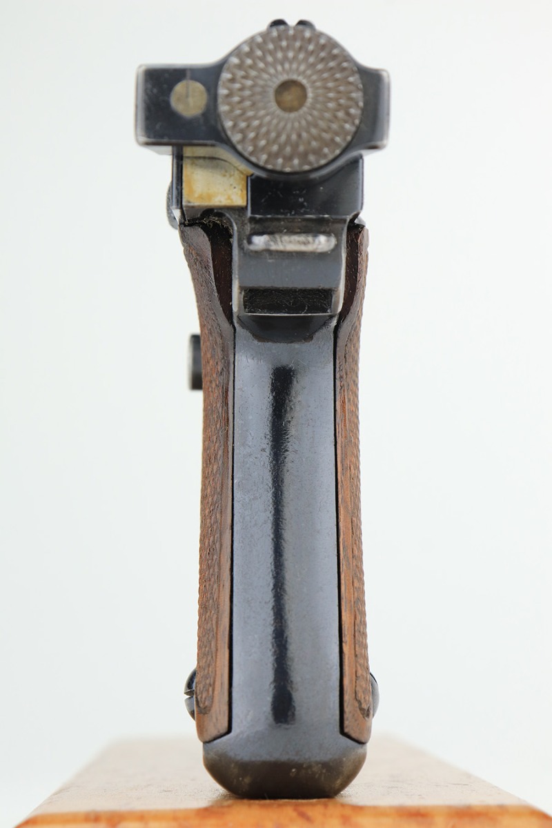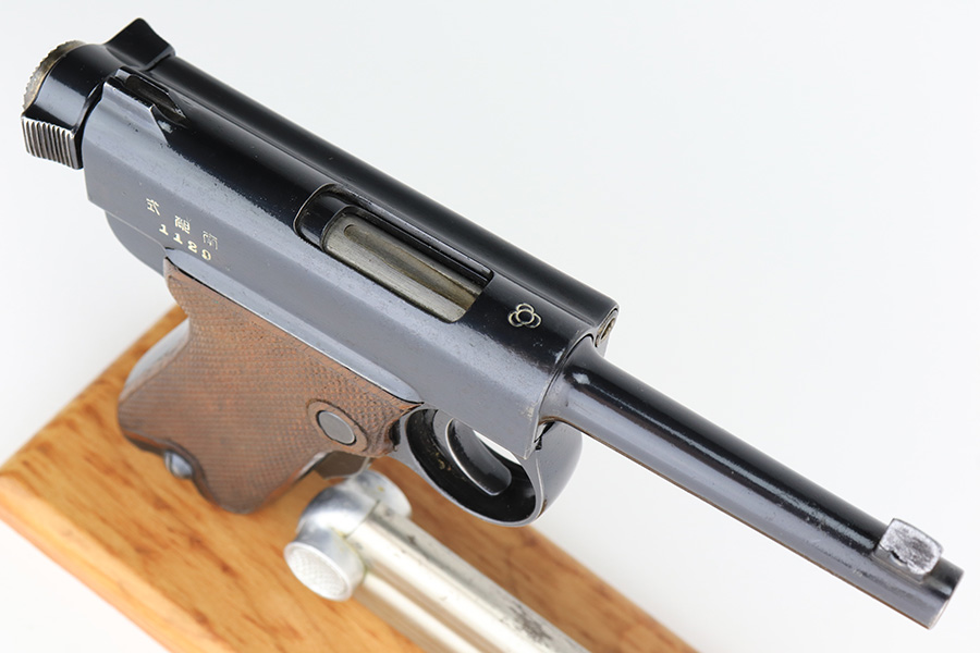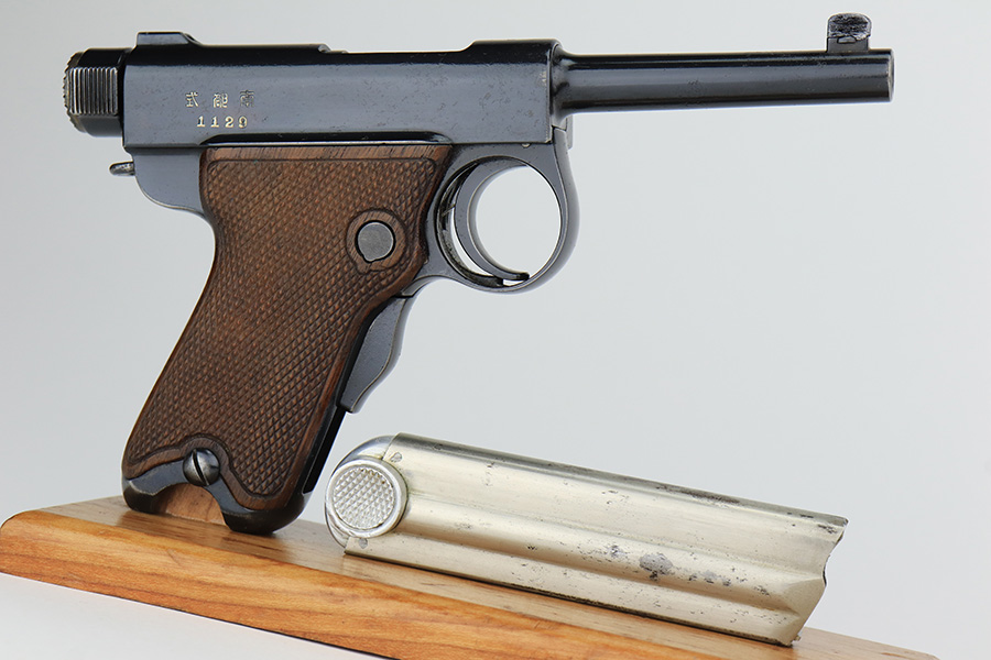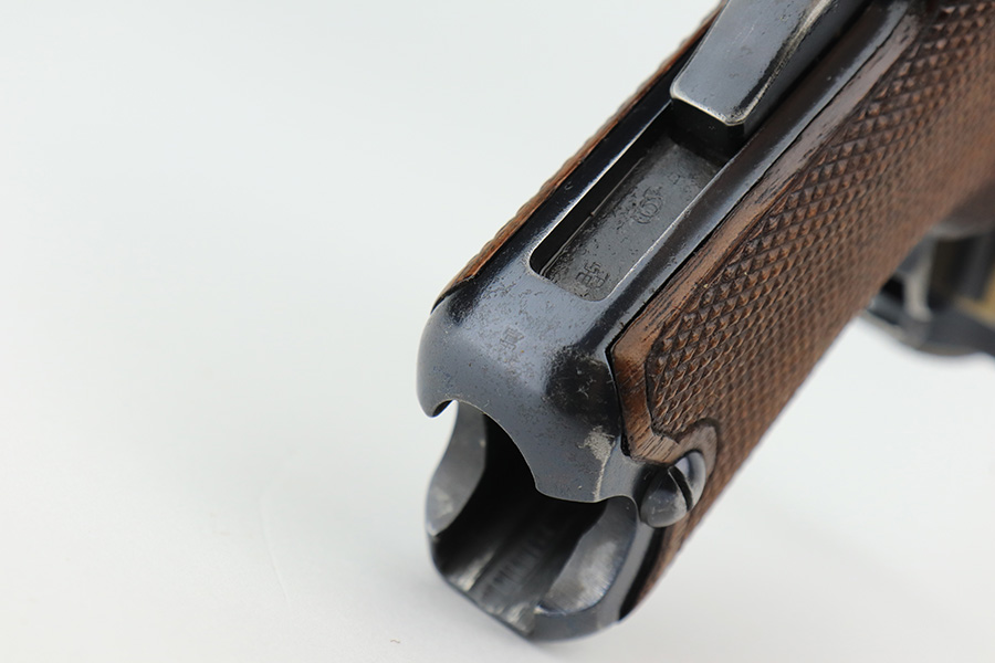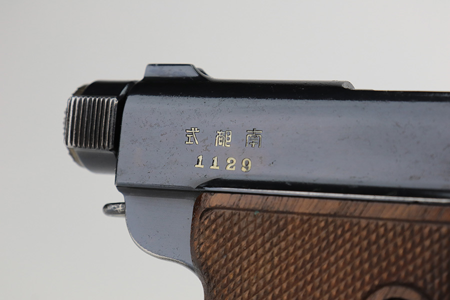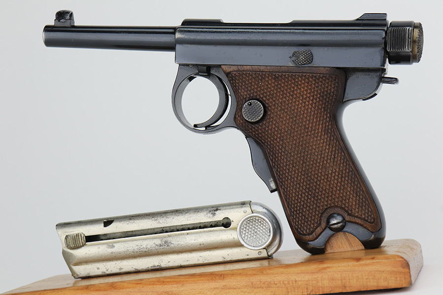 2/8/23 – This is a nice looking Baby Nambu pistol that was manufactured at the Tokyo Arsenal in the 1910s, and still has the original, matching grips and magazine. The pistol has a nice look to it but the finish was restored at some point. Minor pitting under the blue in a few areas. Excellent bore and grips. The Baby Nambu was developed as a personal weapon for high ranking Japanese officers and only about 6,500 were made in total. Considered by collectors to be one of the most beautiful handguns made in pre-war Japan, it featured ornamental knurling on the cocking knob and high quality “rust” blue, that rivaled European handguns of the era.