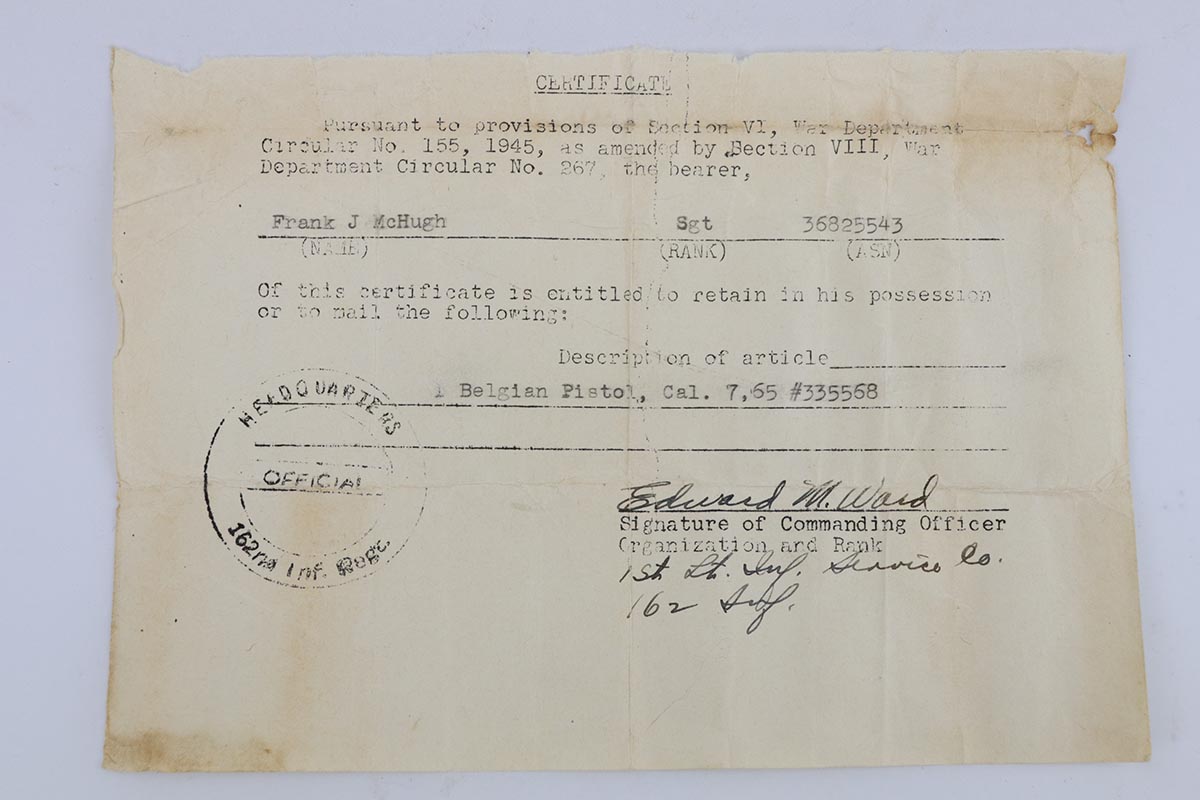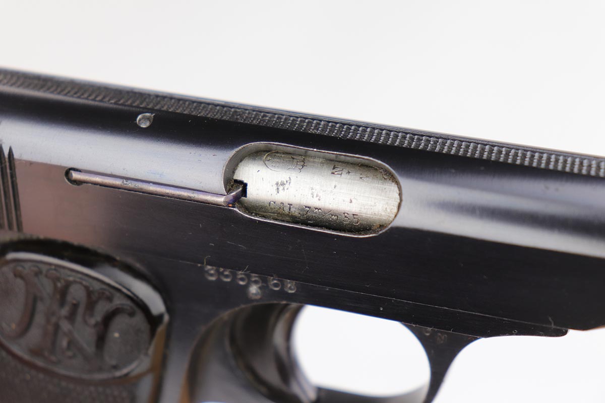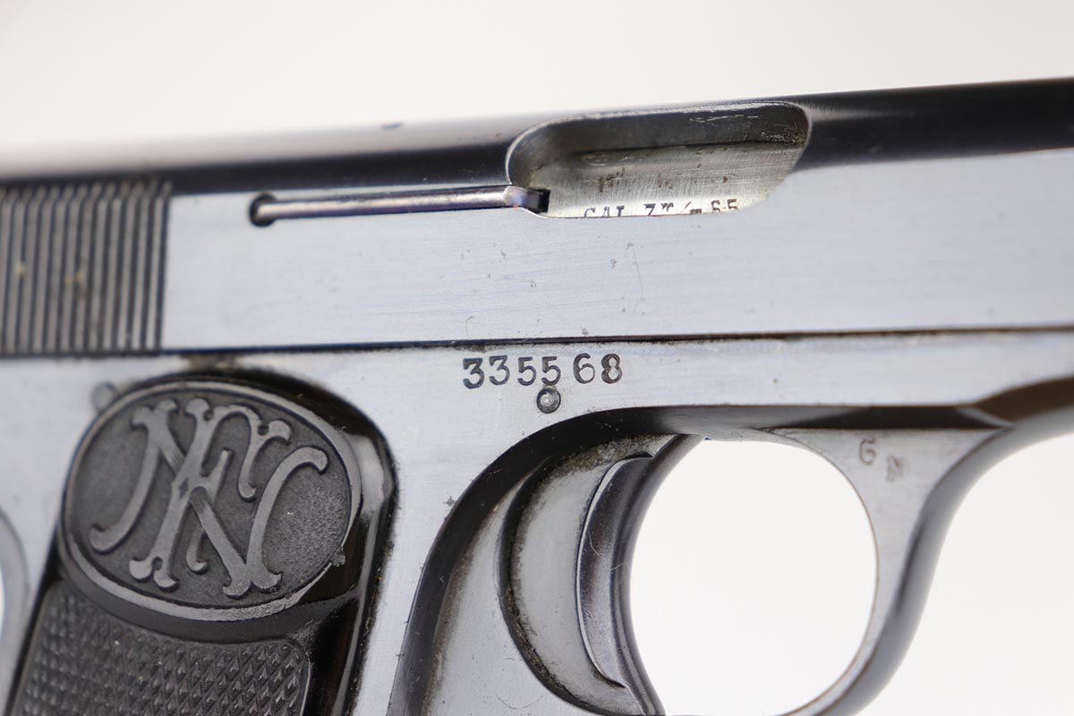 2/25/20 – This is a super rare, all matching, Japanese procurement FN 1910 rig with capture papers. Japanese officers had to purchase their own sidearms and many opted for European made handguns in .32 and .25 caliber. FN 1910 models proved to be very popular and were purchased with locally made holsters. A vast majority of the FN1910 Japanese procurement guns had a kanji marking preceding the serial number on the right side as the only proof that tied these guns to Japan. However, there were a few that were purchased in the early 1930s that had no identifiable Japanese features. The only way to conclusively prove the Japanese connection for these guns is the presence of the capture papers and of the correct Japanese made holster. This is one of those guns. It remains in 99% near-mint original condition with just a few minor handling marks, too small to see in the photographs. It comes with a rare, Japanese made, holster. It has all the attributes of the Japanese made holsters, including the loops for the shoulder strap carry. There are also two original magazines. The capture papers specify the gun by the serial number. A great, prewar set, that would be impossible to upgrade.