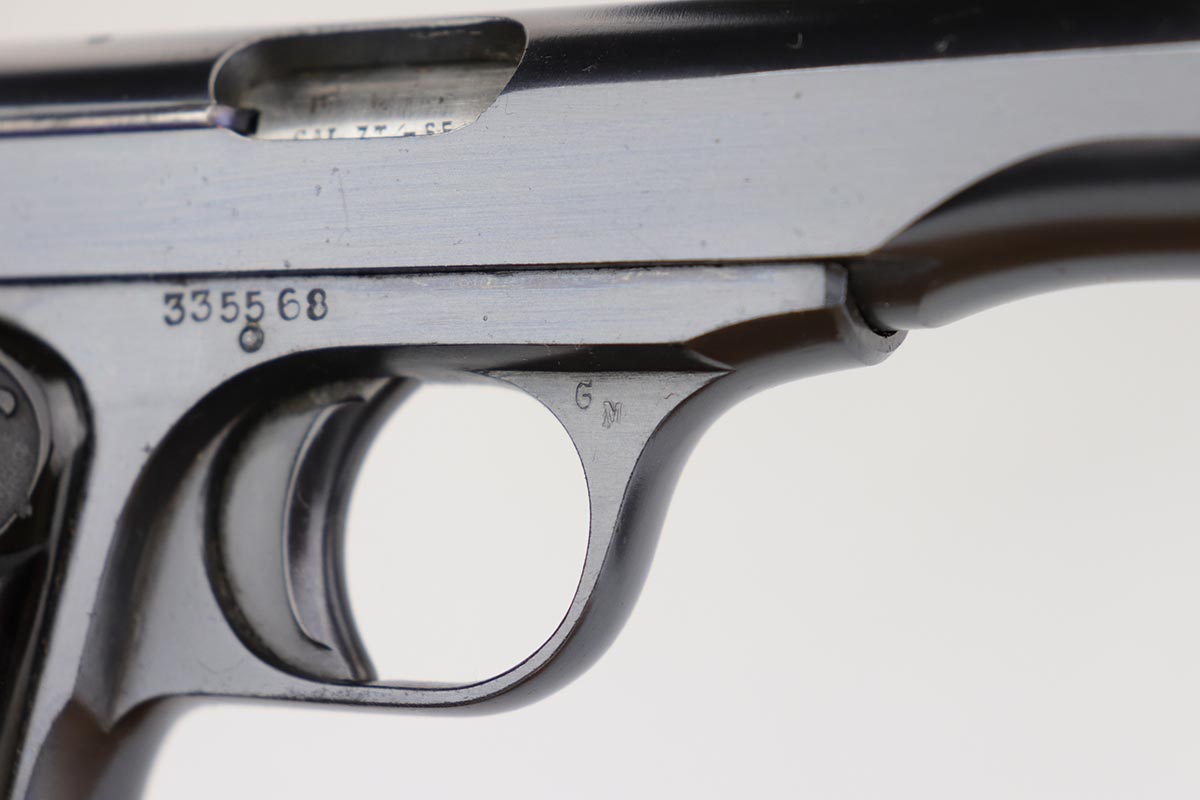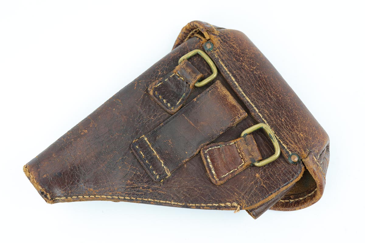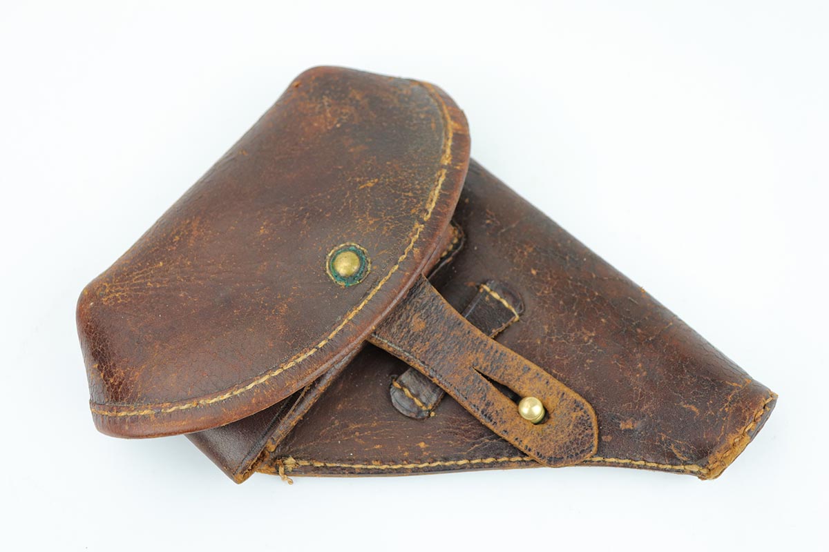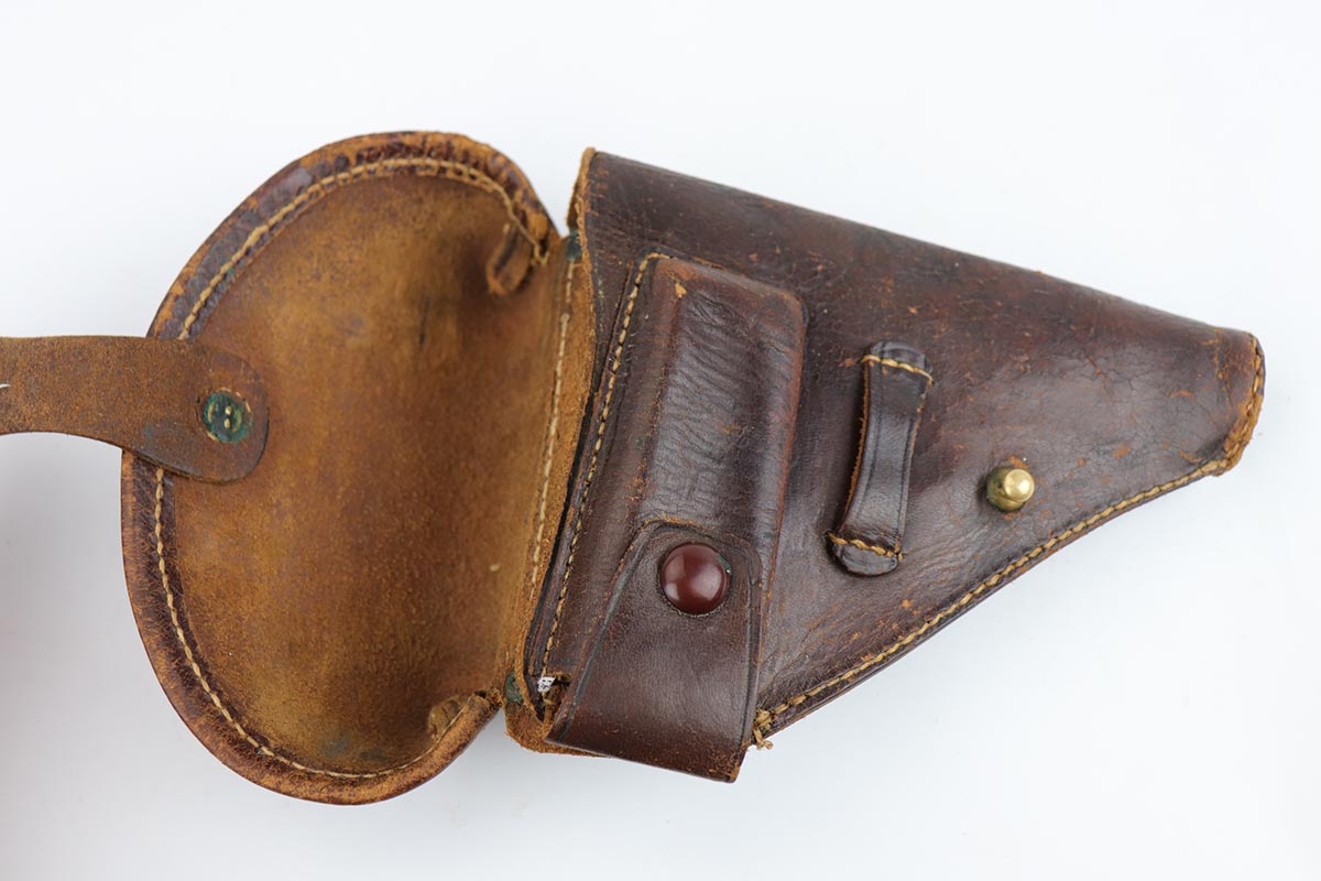 2/25/20 – This is a super rare, all matching, Japanese procurement FN 1910 rig with capture papers. Japanese officers had to purchase their own sidearms and many opted for European made handguns in .32 and .25 caliber. FN 1910 models proved to be very popular and were purchased with locally made holsters. A vast majority of the FN1910 Japanese procurement guns had a kanji marking preceding the serial number on the right side as the only proof that tied these guns to Japan. However, there were a few that were purchased in the early 1930s that had no identifiable Japanese features. The only way to conclusively prove the Japanese connection for these guns is the presence of the capture papers and of the correct Japanese made holster. This is one of those guns. It remains in 99% near-mint original condition with just a few minor handling marks, too small to see in the photographs. It comes with a rare, Japanese made, holster. It has all the attributes of the Japanese made holsters, including the loops for the shoulder strap carry. There are also two original magazines. The capture papers specify the gun by the serial number. A great, prewar set, that would be impossible to upgrade.