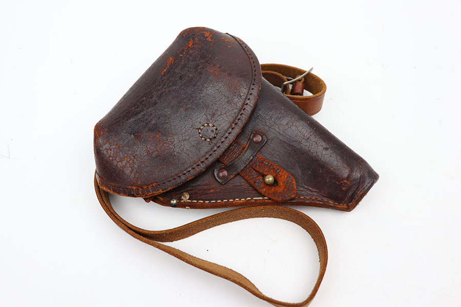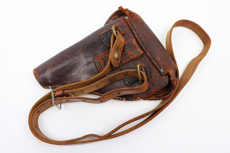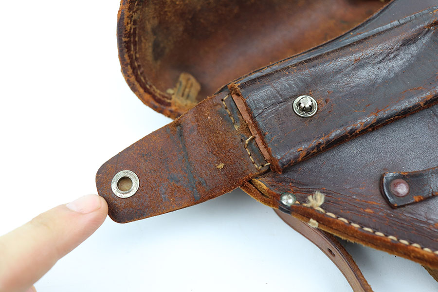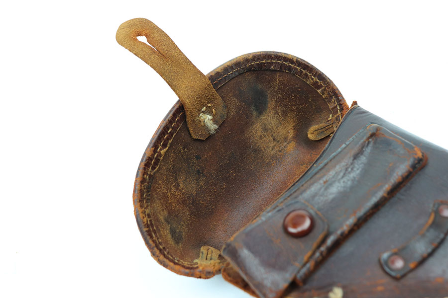 3/12/21 – This is a rare Japanese made FN model 1910 holster. The FN model 1910’s were used by Japanese officers, making this a perfect officer’s holster. The holster has a replaced shoulder strap, but the strap is in excellent condition and has a Japanese ink stamp on the interior leather. The strap is likely a high-end quality reproduction. The holster leather is worn and pliable with some surface cracking throughout. The leather is still in tact however. The stitching is replaced along the left side of the holster, but the other stitching is original.