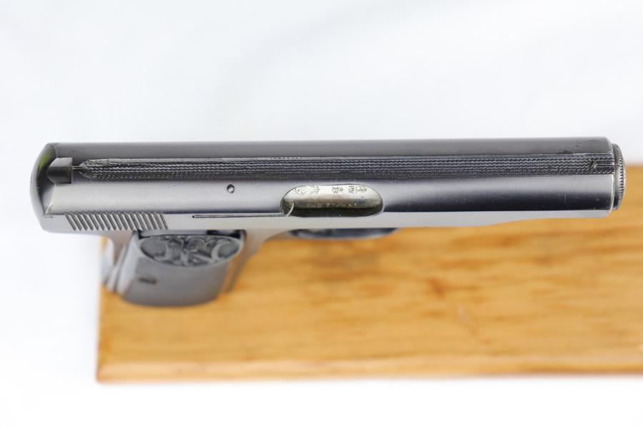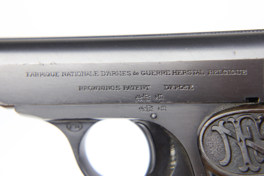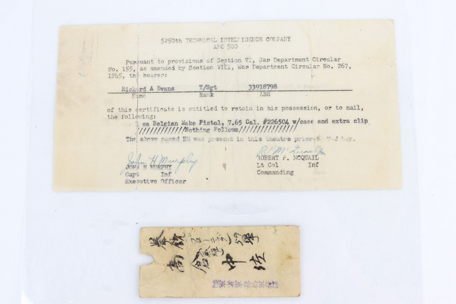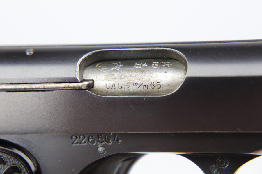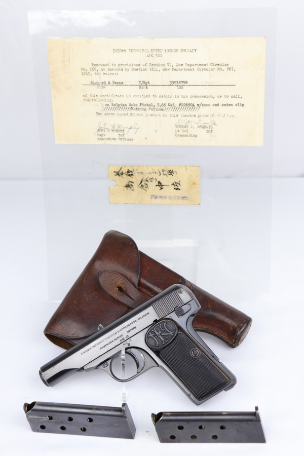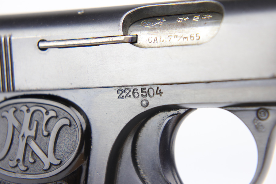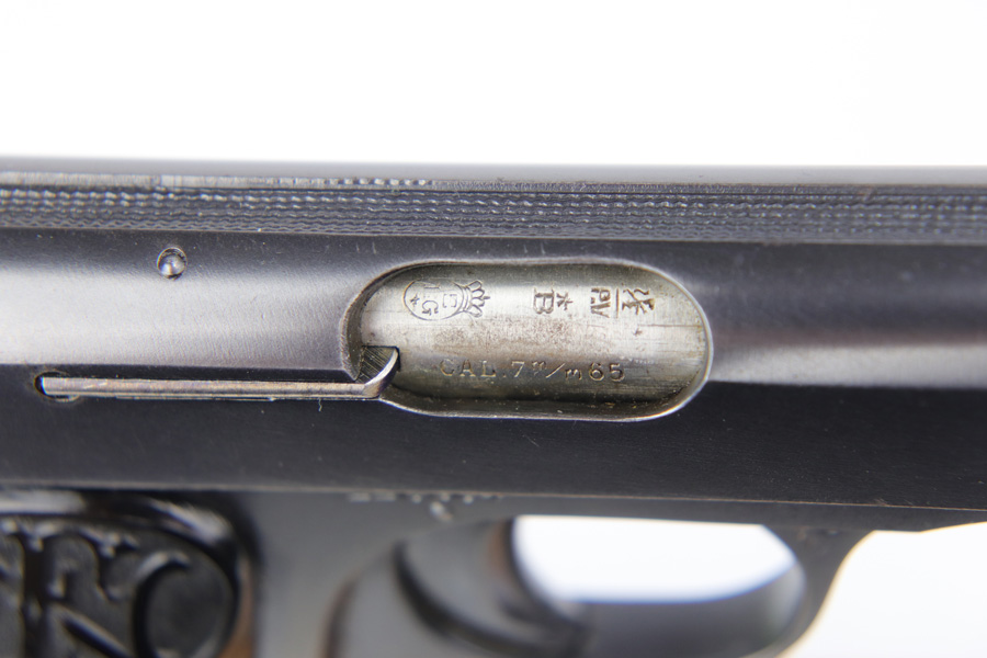 11/1/18 – This gun is a super rare Japanese procurement FN 1910 rig with original capture papers. Japanese officers had to purchase their own sidearms and many opted for European made handguns in .32 and .25 caliber. FN 1910 models proved to be very popular and were purchased with locally made holsters. A vast majority of the FN1910 Japanese procurement guns had a kanji marking preceding the serial number on the right side as the only proof that tied these guns to Japan. However, there were a few that were purchased in the early 30s that had no identifiable Japanese features. The only way to conclusively prove the Japanese connection for these guns is the presence of the capture papers and of the correct Japanese made holster. This is one of those guns. It remains in 98% original condition with just a hint of wear on the edges of the slide, and a couple of small areas of surface freckling at the front and back of the slide. It comes with a rare, one of a kind holster that actually has a maker mark in English, but was made in Tokyo! It has all the attributes of the Japanese made holsters, including the loops for the shoulder strap carry. There are also two original magazines. The capture papers specify the gun by the serial number. There is also a tag with Japanese writing, identifying a specific officer that the gun belonged to. We will attempt to get the translation soon. Excellent bore and grips. This is a rare opportunity to add such a set to your collection! NOTE: We were able to get the translation of the Japanese tag that came with this rare set. It identifies the gun as a personal sidearm of a high ranking Japanese officer and reads:
