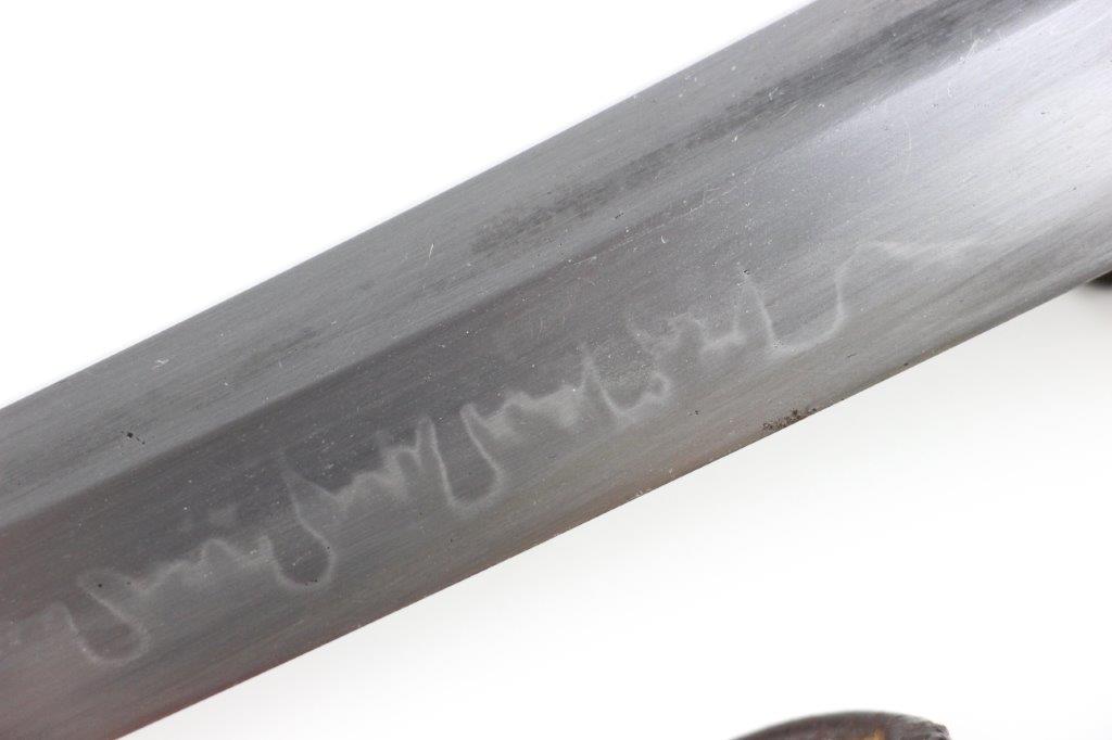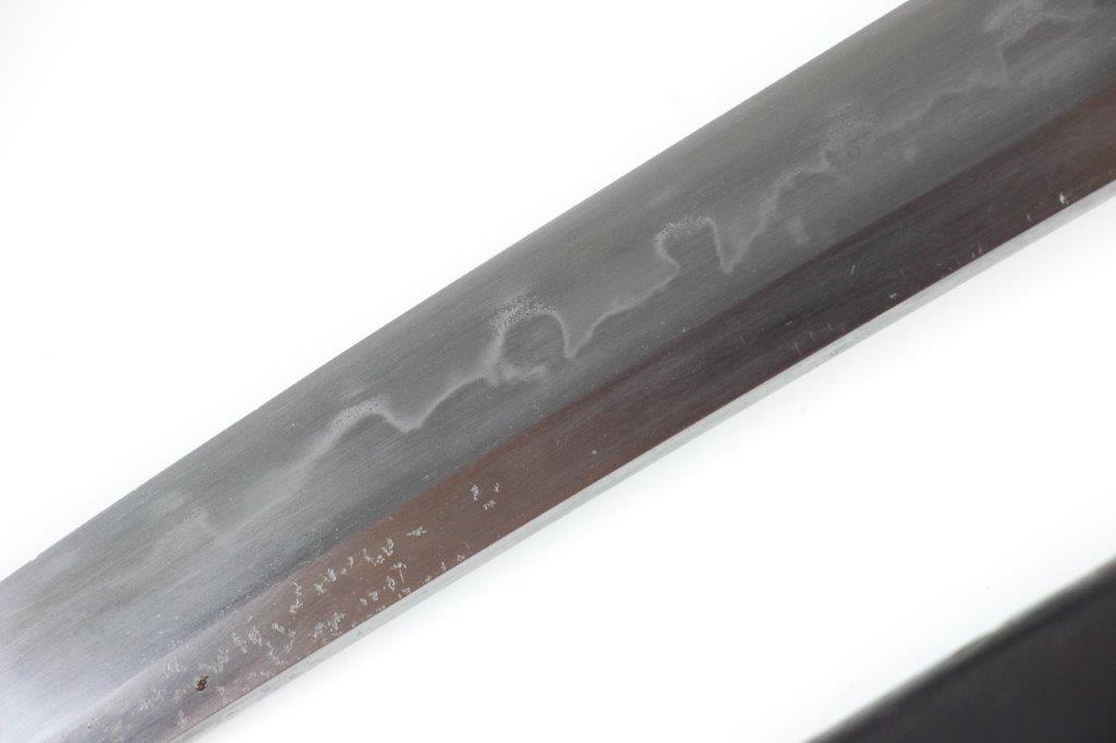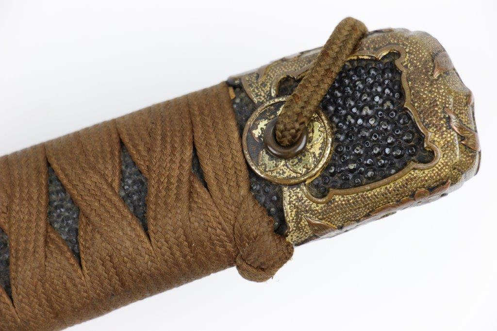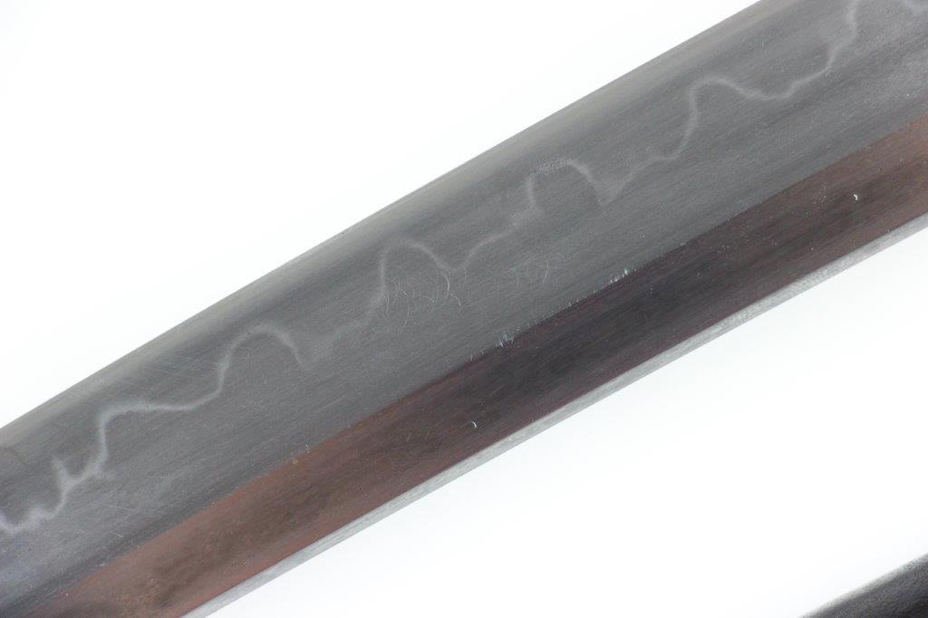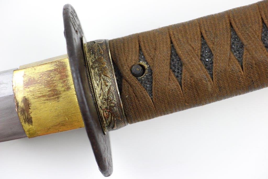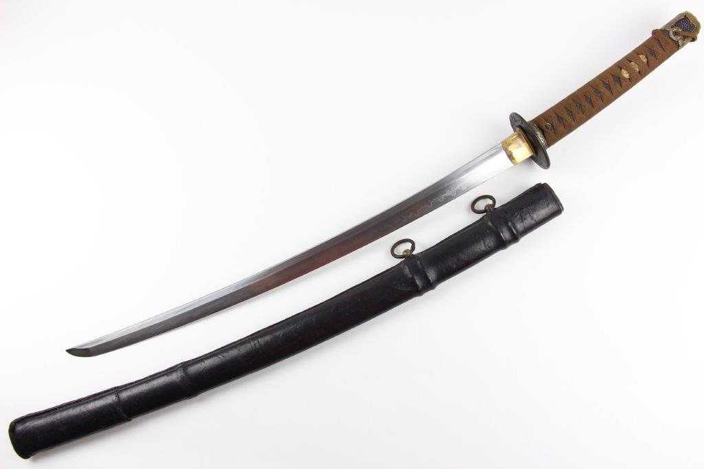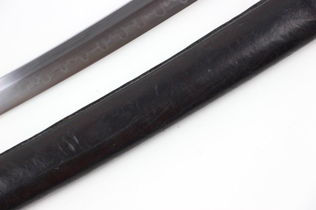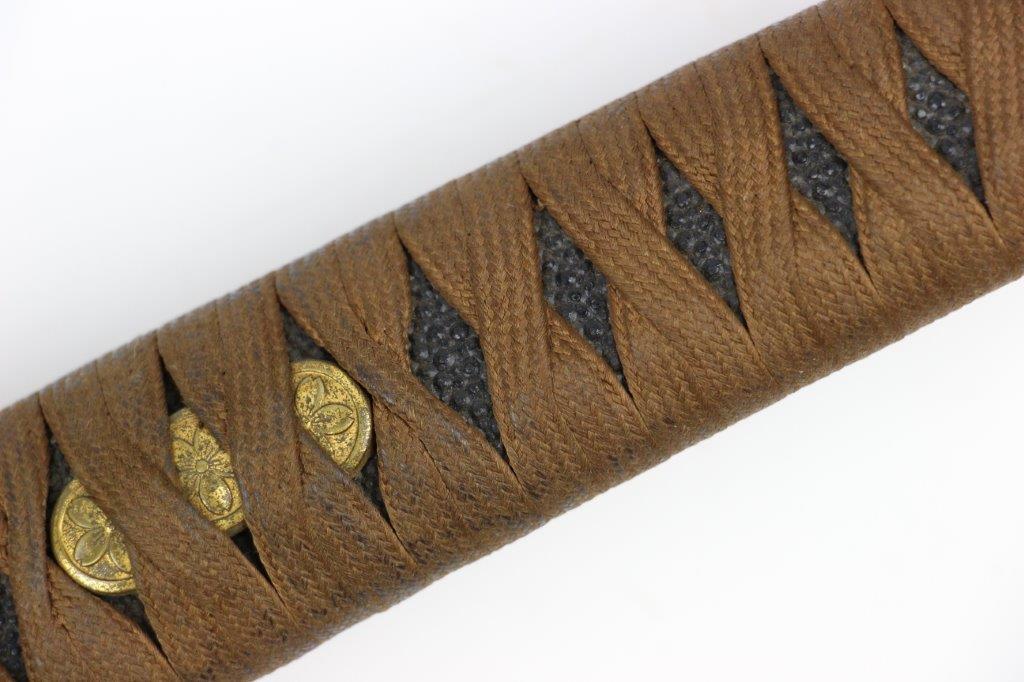 8/26/24 – This is a traditionally made Japanese Family Sword signed by yamashiro Fujiwara Kane yoshiyuki from the 1700s. The sword is fitted with WW2 Japanese Navy fittings, meaning this sword was carried to war by a Naval Officer during WW2. This is characterized by the black ray skin handle with brown cloth wrapping, and the Navy style scabbard. Interestingly, the sword blade has a 23 inch cutting edge, which would typically not be allowed during the war as an Officer’s Sword, but exceptions were made for pilots, tank crew members, and naval landing forces. The shorter length is highly sought after by collectors today. The sword was originally made as a wakizashi and has never been cut down or shortened. The blade also features a beautifully distinct and jagged tempered edge. There’s some mild surface rub wear and speckling which is mostly near the tip of the blade. Overall the blade is in great condition. The tsuba is a civilian style which must have been customized by the officer. There’s natural patina and age but no major issues. Comes with an original Type 97 Navy style scabbard (2 mounting rings) with desirable field-leather wrapping. Overall length is about 33.50 inches.