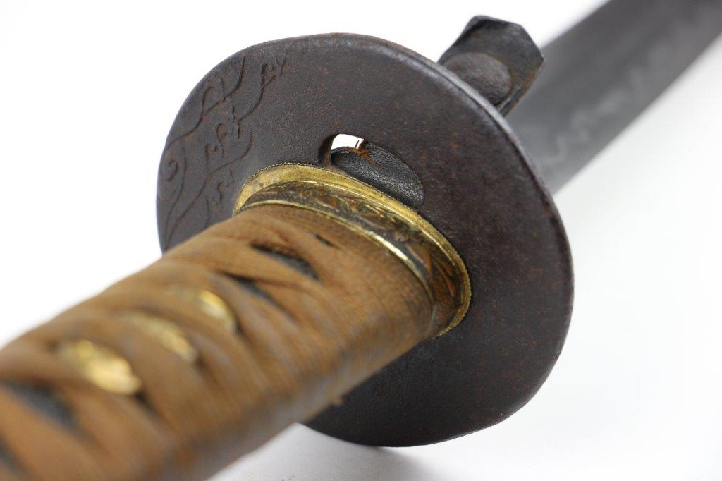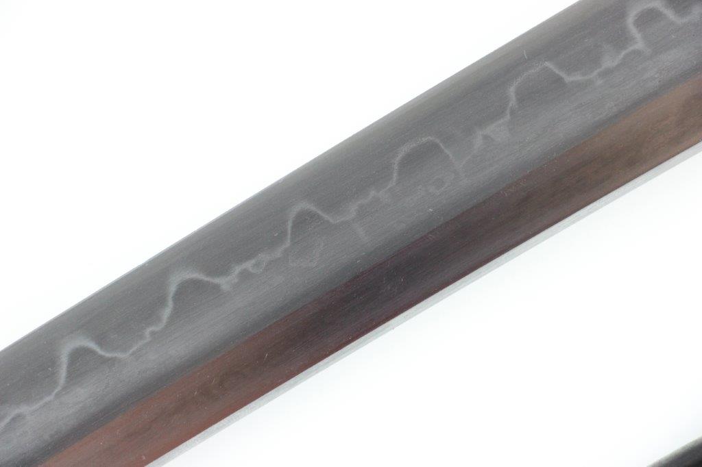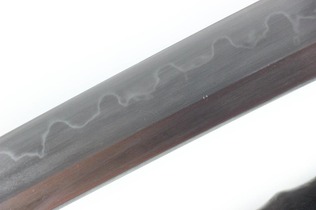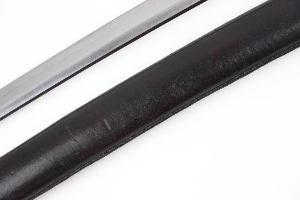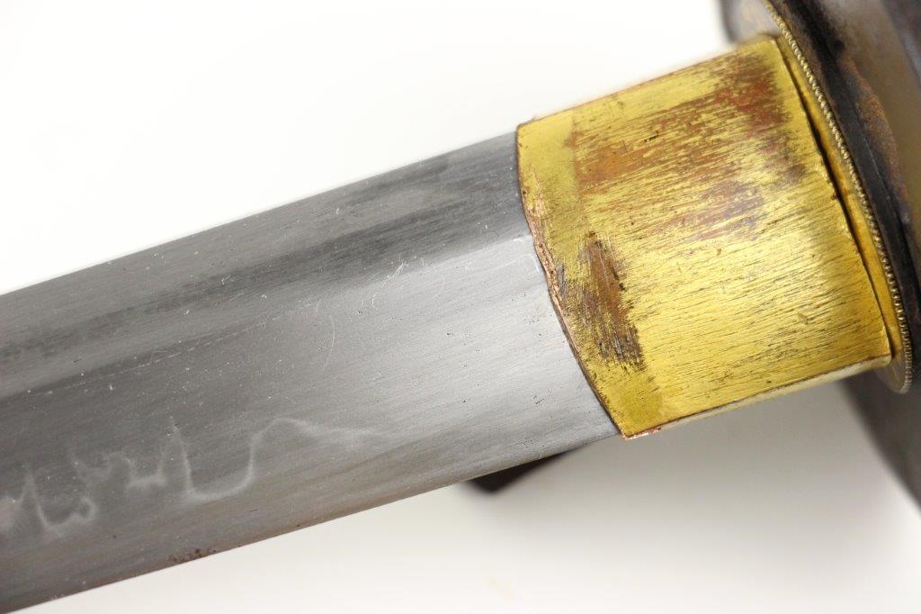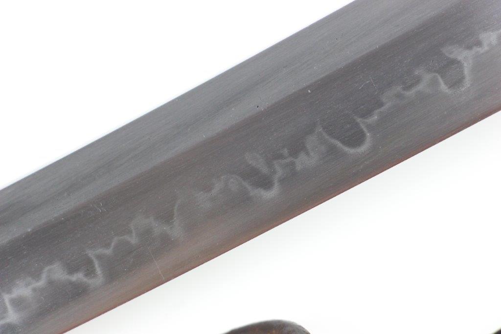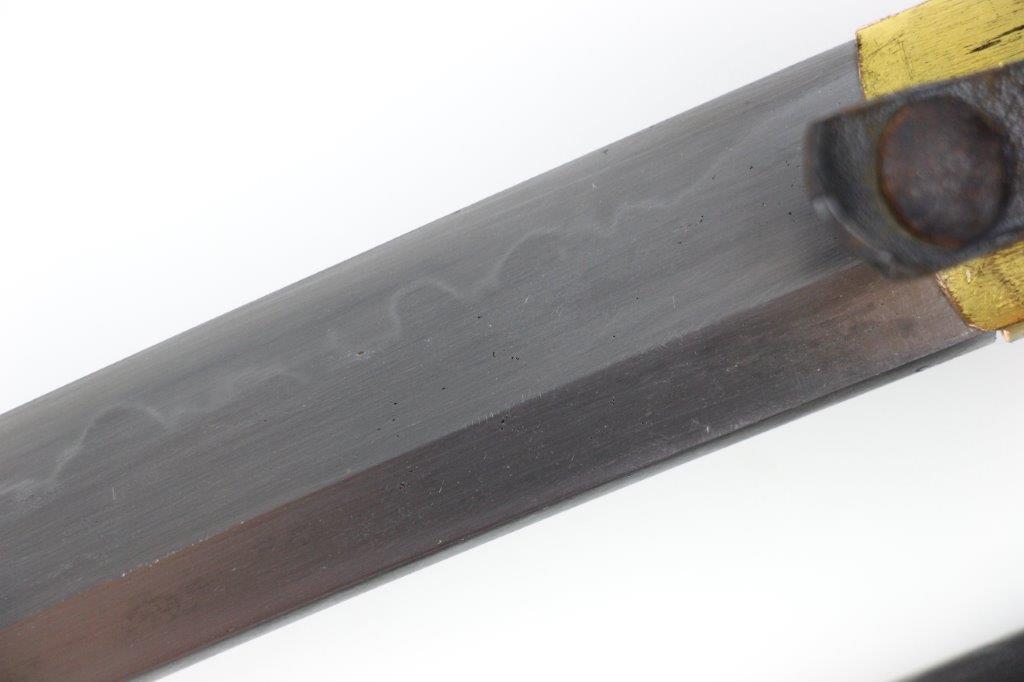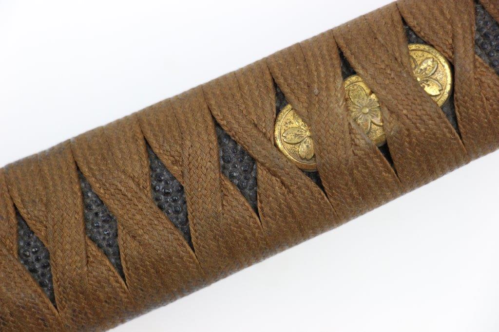 8/26/24 – This is a traditionally made Japanese Family Sword signed by yamashiro Fujiwara Kane yoshiyuki from the 1700s. The sword is fitted with WW2 Japanese Navy fittings, meaning this sword was carried to war by a Naval Officer during WW2. This is characterized by the black ray skin handle with brown cloth wrapping, and the Navy style scabbard. Interestingly, the sword blade has a 23 inch cutting edge, which would typically not be allowed during the war as an Officer’s Sword, but exceptions were made for pilots, tank crew members, and naval landing forces. The shorter length is highly sought after by collectors today. The sword was originally made as a wakizashi and has never been cut down or shortened. The blade also features a beautifully distinct and jagged tempered edge. There’s some mild surface rub wear and speckling which is mostly near the tip of the blade. Overall the blade is in great condition. The tsuba is a civilian style which must have been customized by the officer. There’s natural patina and age but no major issues. Comes with an original Type 97 Navy style scabbard (2 mounting rings) with desirable field-leather wrapping. Overall length is about 33.50 inches.