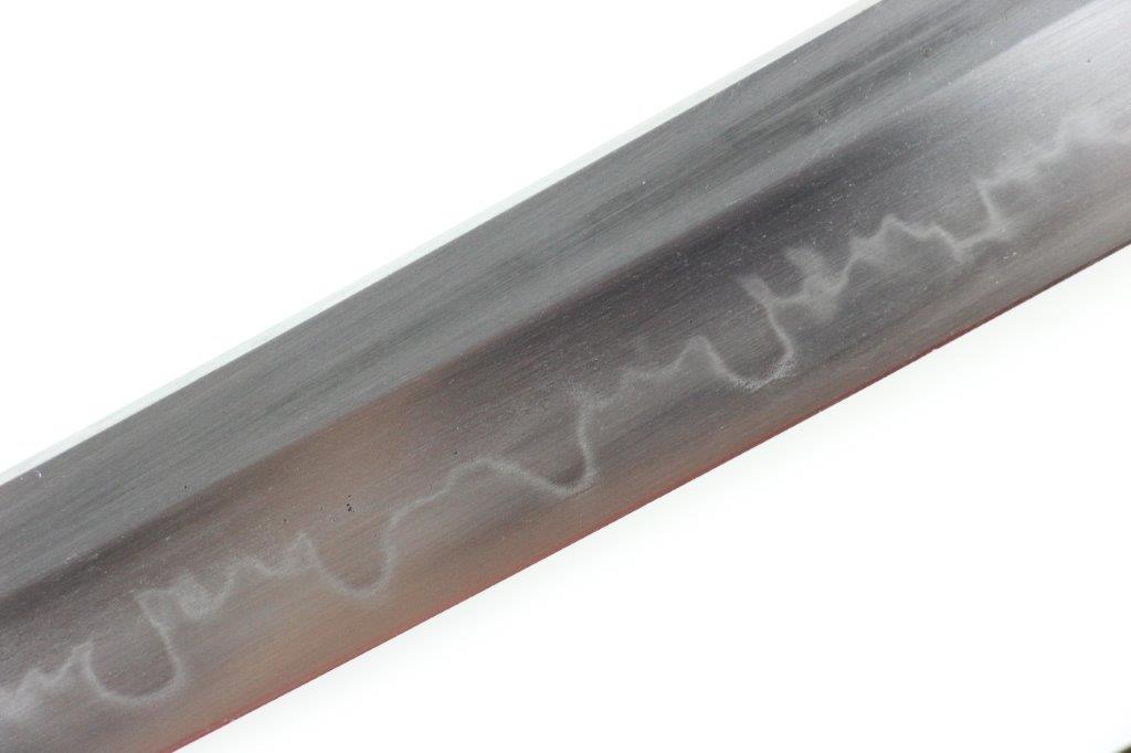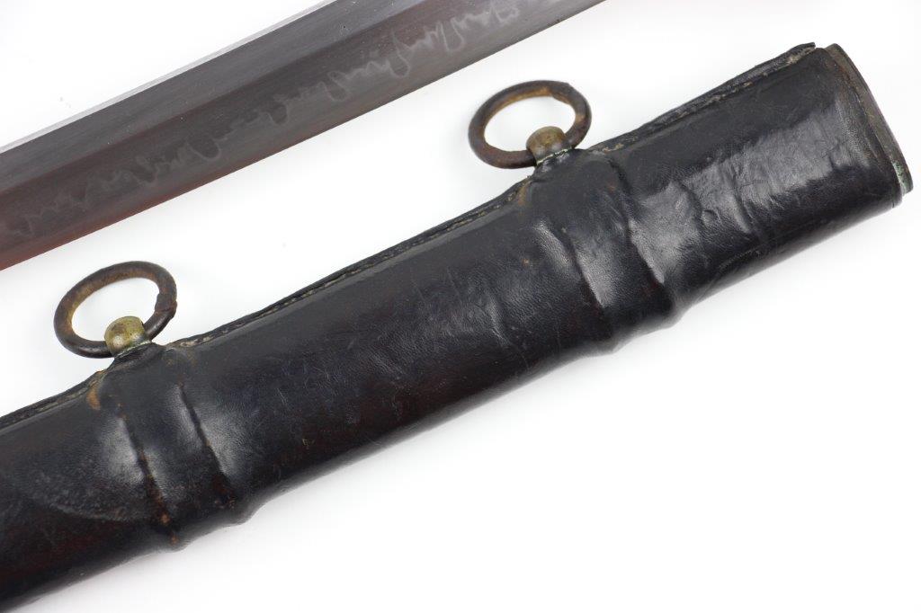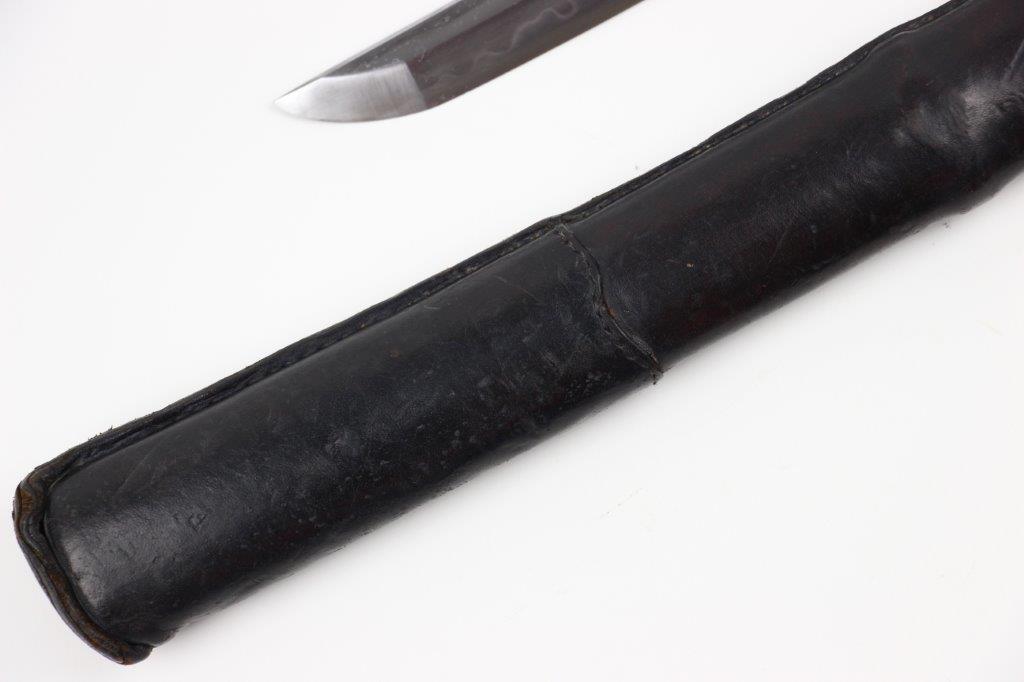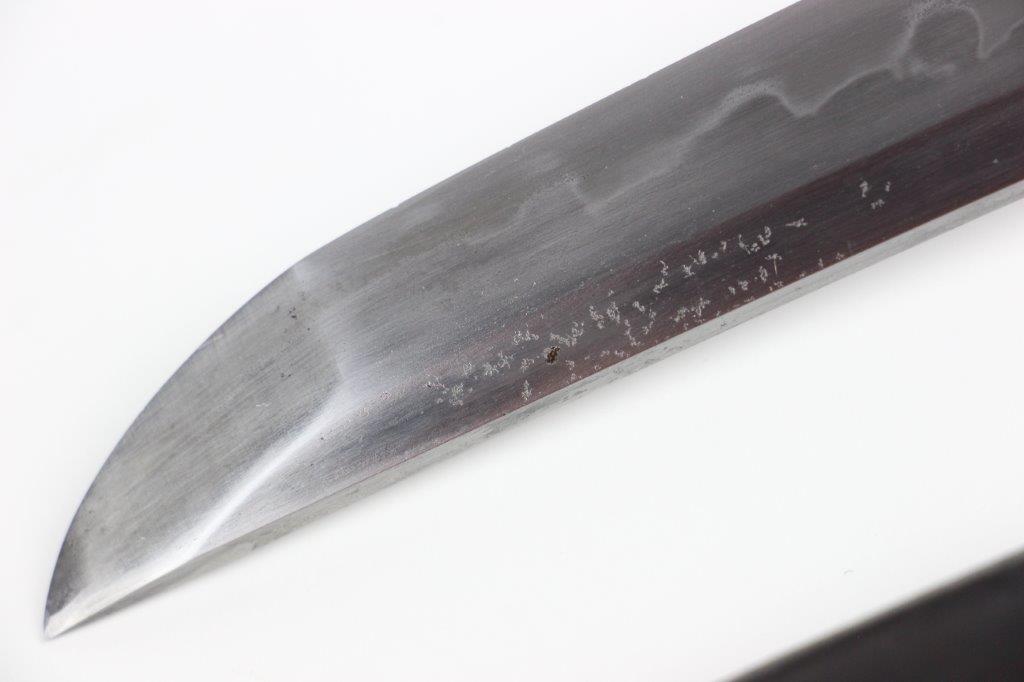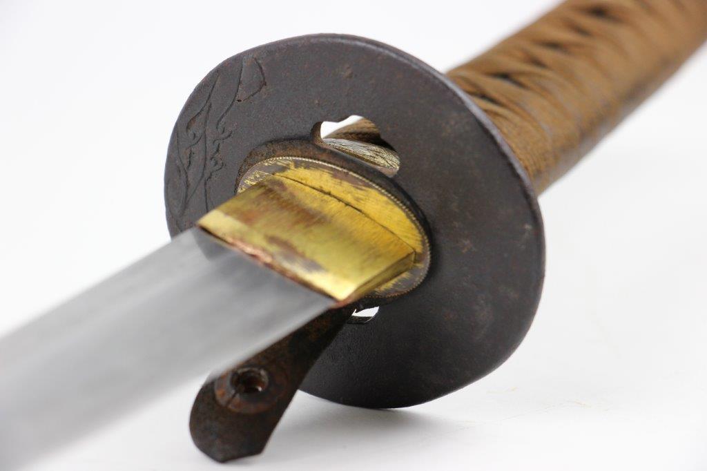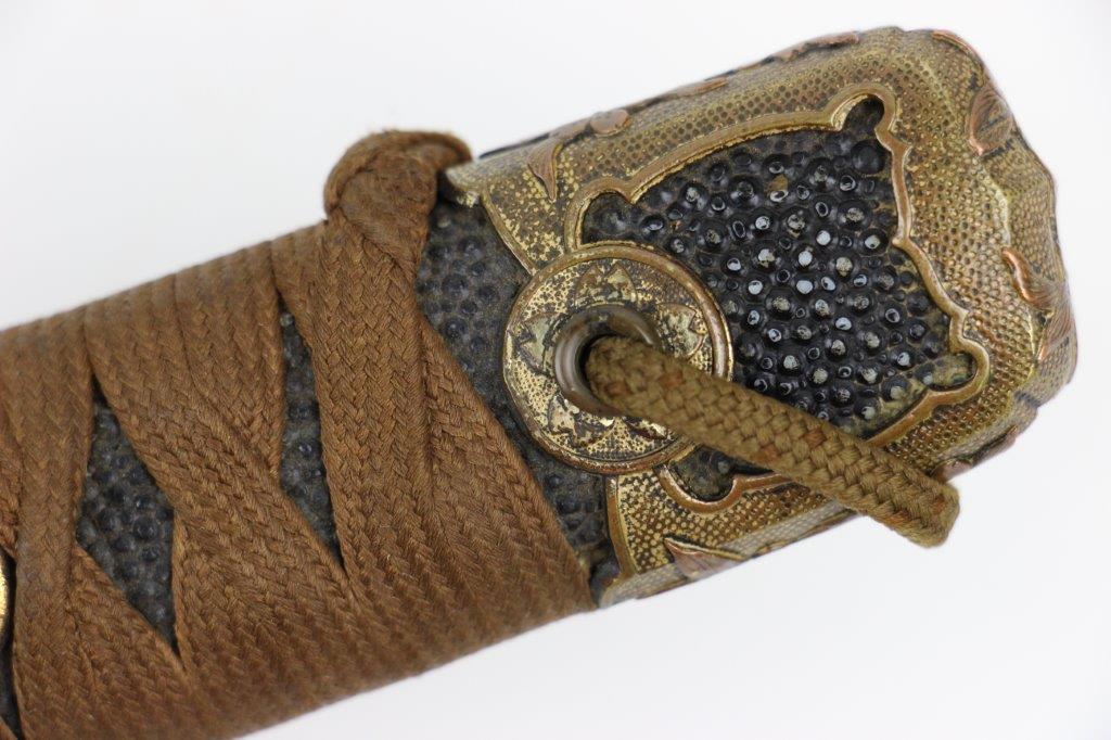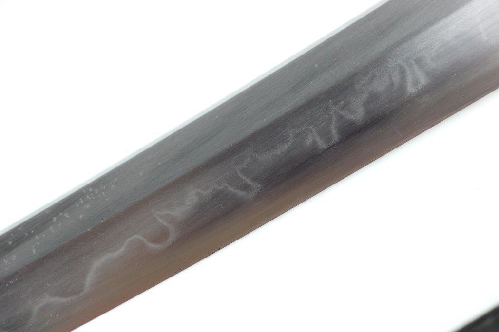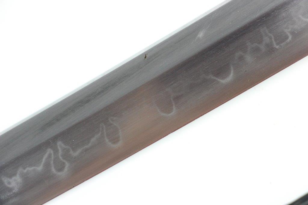 8/26/24 – This is a traditionally made Japanese Family Sword signed by yamashiro Fujiwara Kane yoshiyuki from the 1700s. The sword is fitted with WW2 Japanese Navy fittings, meaning this sword was carried to war by a Naval Officer during WW2. This is characterized by the black ray skin handle with brown cloth wrapping, and the Navy style scabbard. Interestingly, the sword blade has a 23 inch cutting edge, which would typically not be allowed during the war as an Officer’s Sword, but exceptions were made for pilots, tank crew members, and naval landing forces. The shorter length is highly sought after by collectors today. The sword was originally made as a wakizashi and has never been cut down or shortened. The blade also features a beautifully distinct and jagged tempered edge. There’s some mild surface rub wear and speckling which is mostly near the tip of the blade. Overall the blade is in great condition. The tsuba is a civilian style which must have been customized by the officer. There’s natural patina and age but no major issues. Comes with an original Type 97 Navy style scabbard (2 mounting rings) with desirable field-leather wrapping. Overall length is about 33.50 inches.