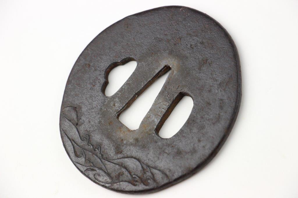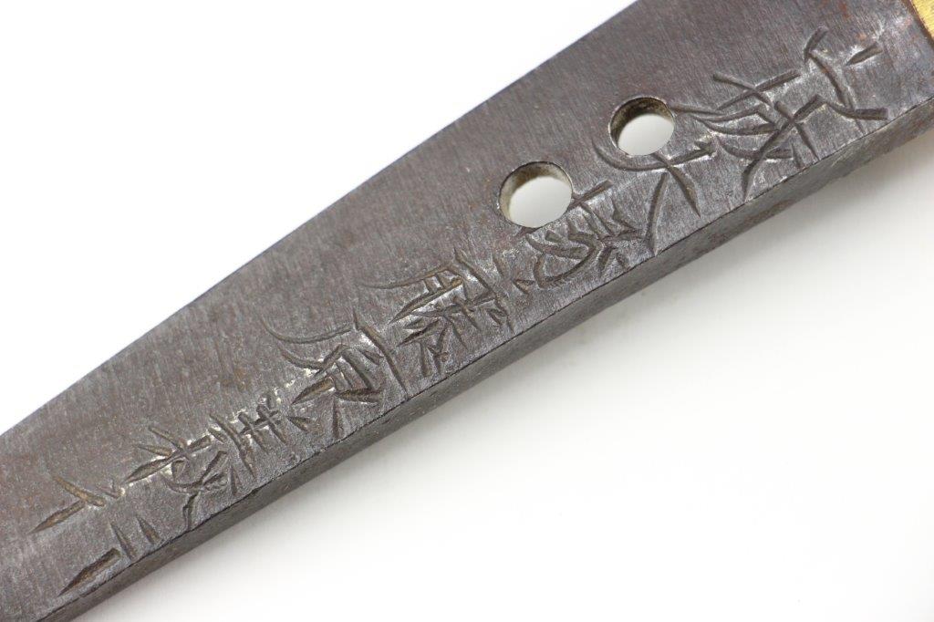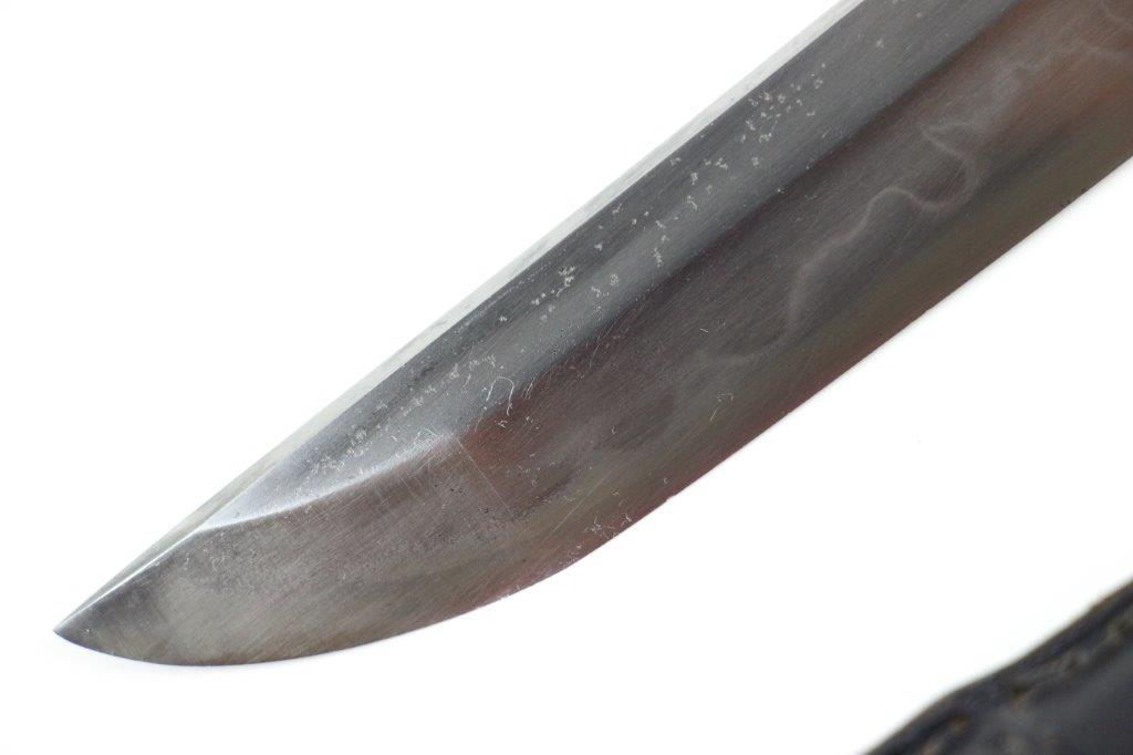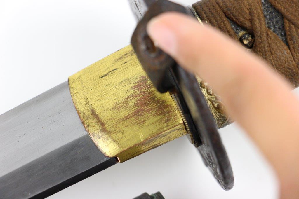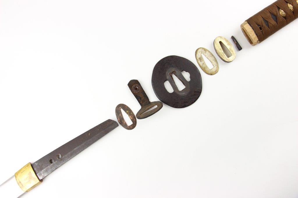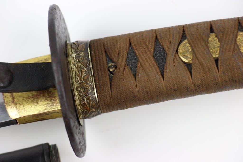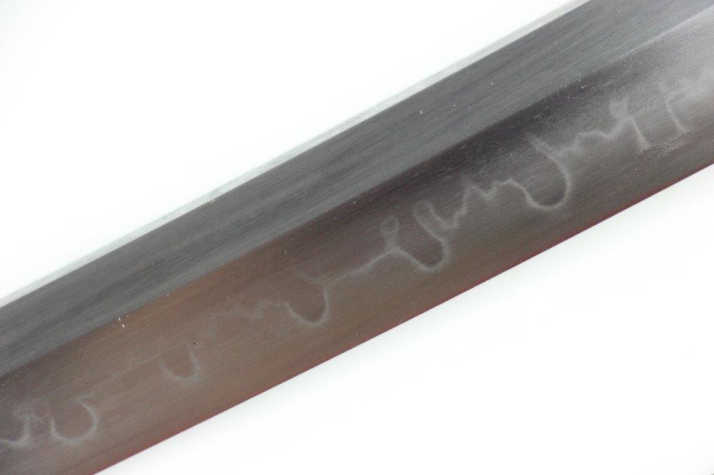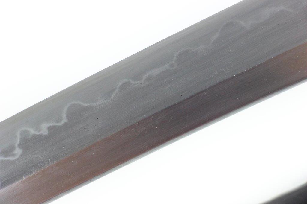 8/26/24 – This is a traditionally made Japanese Family Sword signed by yamashiro Fujiwara Kane yoshiyuki from the 1700s. The sword is fitted with WW2 Japanese Navy fittings, meaning this sword was carried to war by a Naval Officer during WW2. This is characterized by the black ray skin handle with brown cloth wrapping, and the Navy style scabbard. Interestingly, the sword blade has a 23 inch cutting edge, which would typically not be allowed during the war as an Officer’s Sword, but exceptions were made for pilots, tank crew members, and naval landing forces. The shorter length is highly sought after by collectors today. The sword was originally made as a wakizashi and has never been cut down or shortened. The blade also features a beautifully distinct and jagged tempered edge. There’s some mild surface rub wear and speckling which is mostly near the tip of the blade. Overall the blade is in great condition. The tsuba is a civilian style which must have been customized by the officer. There’s natural patina and age but no major issues. Comes with an original Type 97 Navy style scabbard (2 mounting rings) with desirable field-leather wrapping. Overall length is about 33.50 inches.
