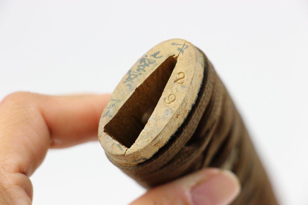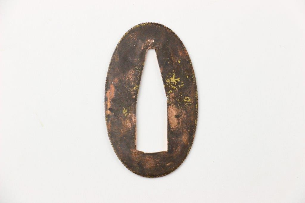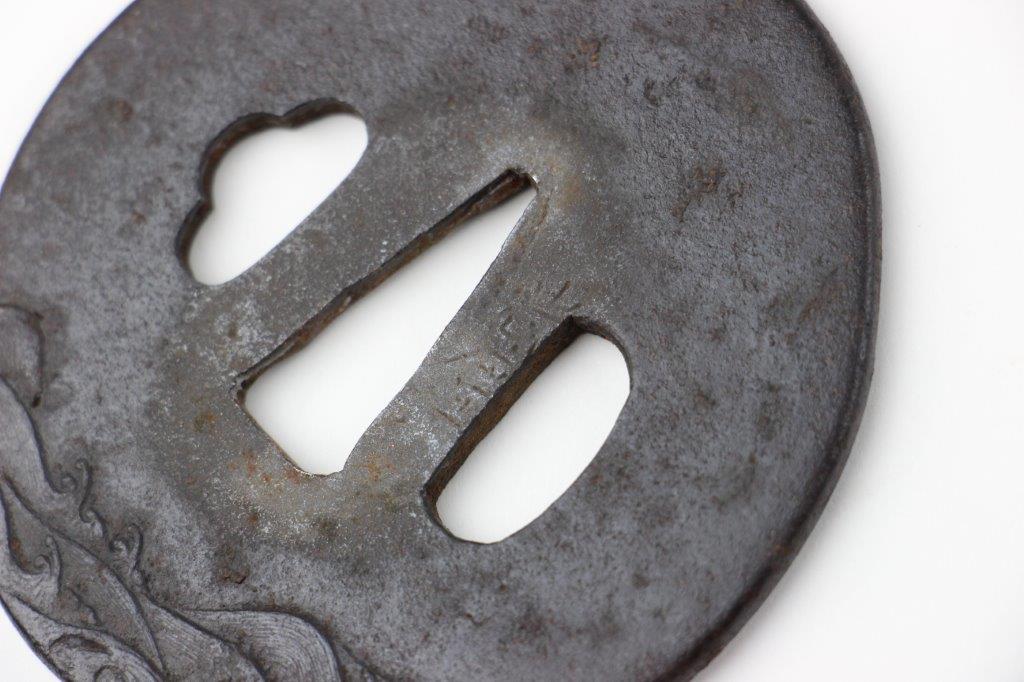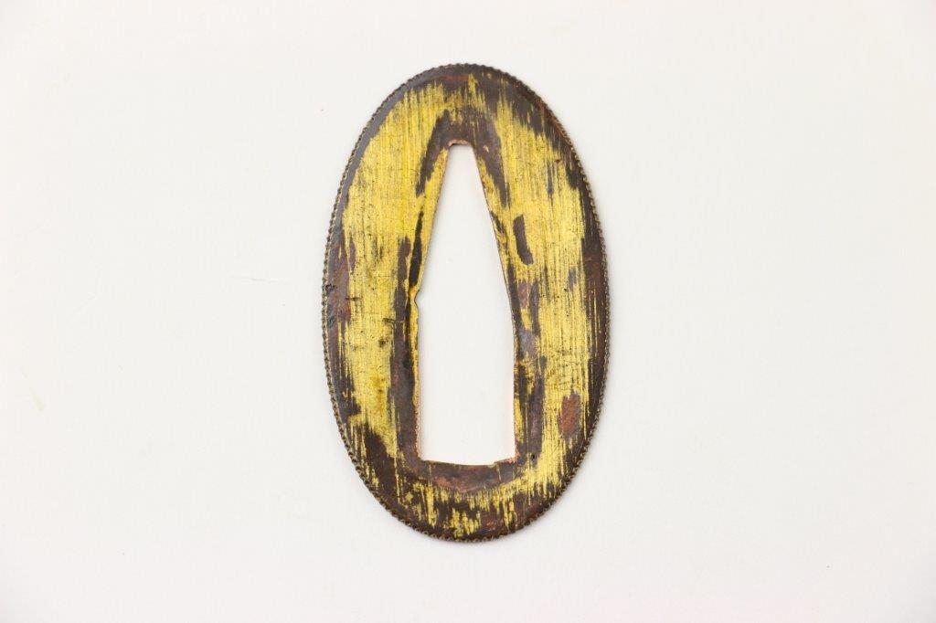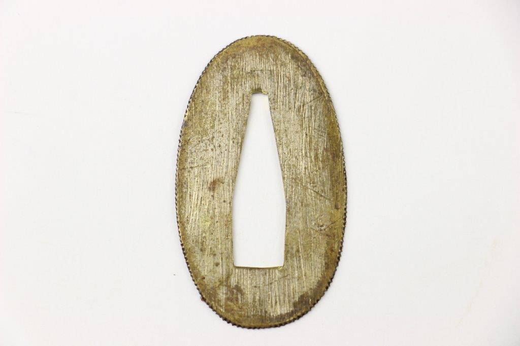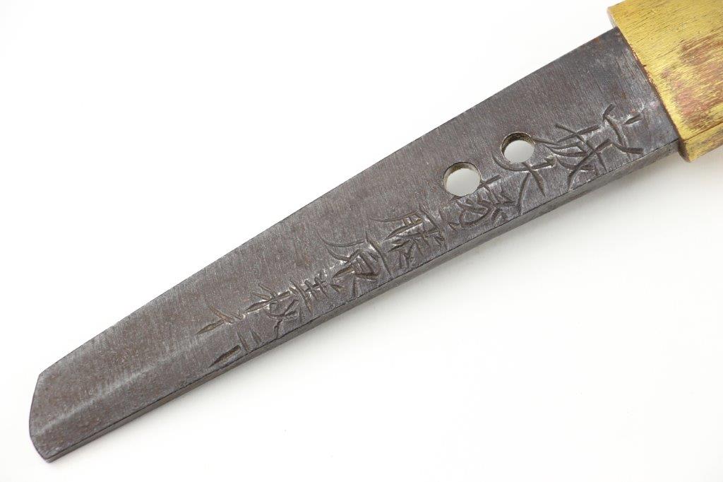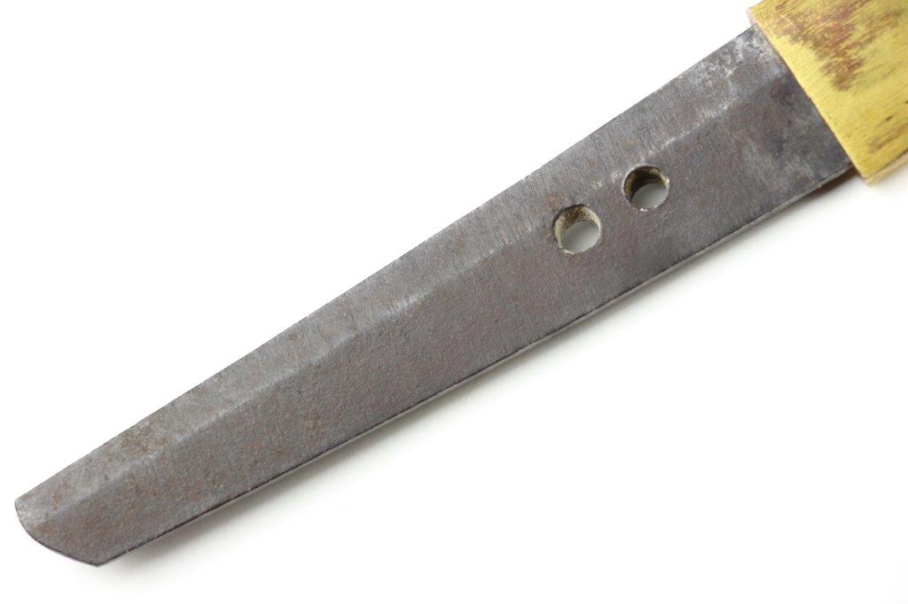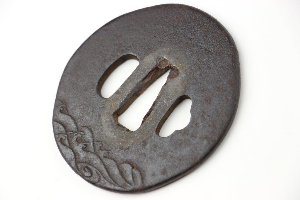8/26/24 – This is a traditionally made Japanese Family Sword signed by yamashiro Fujiwara Kane yoshiyuki from the 1700s. The sword is fitted with WW2 Japanese Navy fittings, meaning this sword was carried to war by a Naval Officer during WW2. This is characterized by the black ray skin handle with brown cloth wrapping, and the Navy style scabbard. Interestingly, the sword blade has a 23 inch cutting edge, which would typically not be allowed during the war as an Officer’s Sword, but exceptions were made for pilots, tank crew members, and naval landing forces. The shorter length is highly sought after by collectors today. The sword was originally made as a wakizashi and has never been cut down or shortened. The blade also features a beautifully distinct and jagged tempered edge. There’s some mild surface rub wear and speckling which is mostly near the tip of the blade. Overall the blade is in great condition. The tsuba is a civilian style which must have been customized by the officer. There’s natural patina and age but no major issues. Comes with an original Type 97 Navy style scabbard (2 mounting rings) with desirable field-leather wrapping. Overall length is about 33.50 inches.