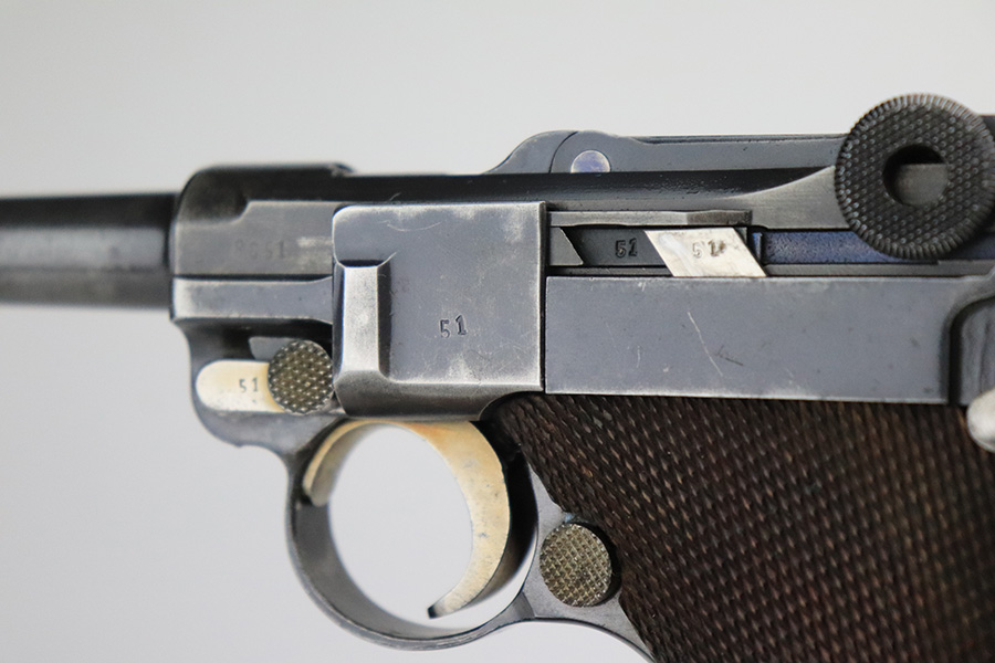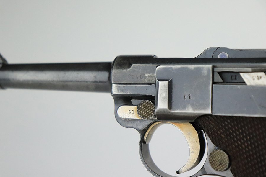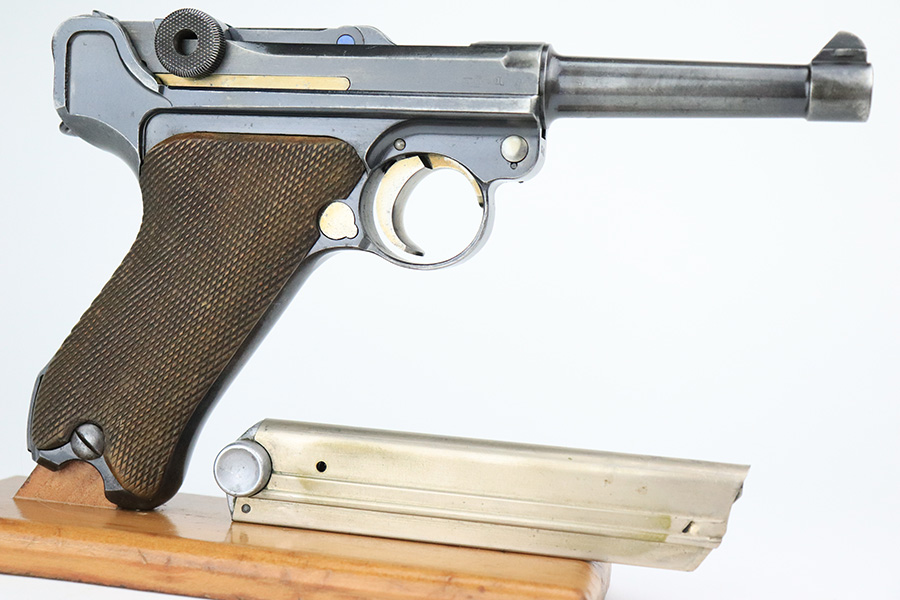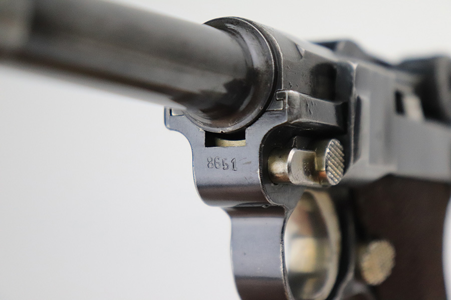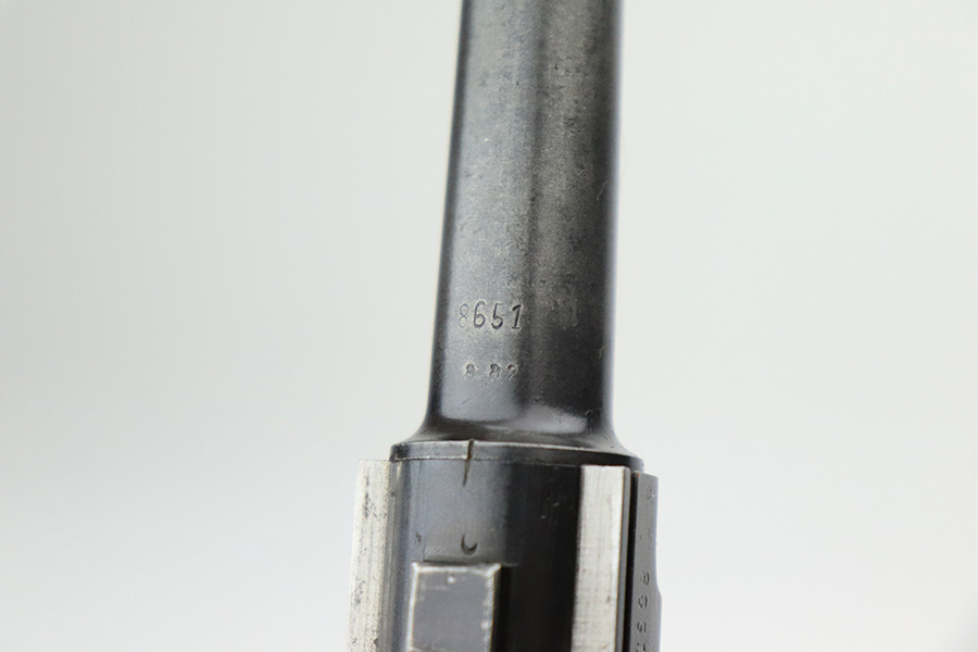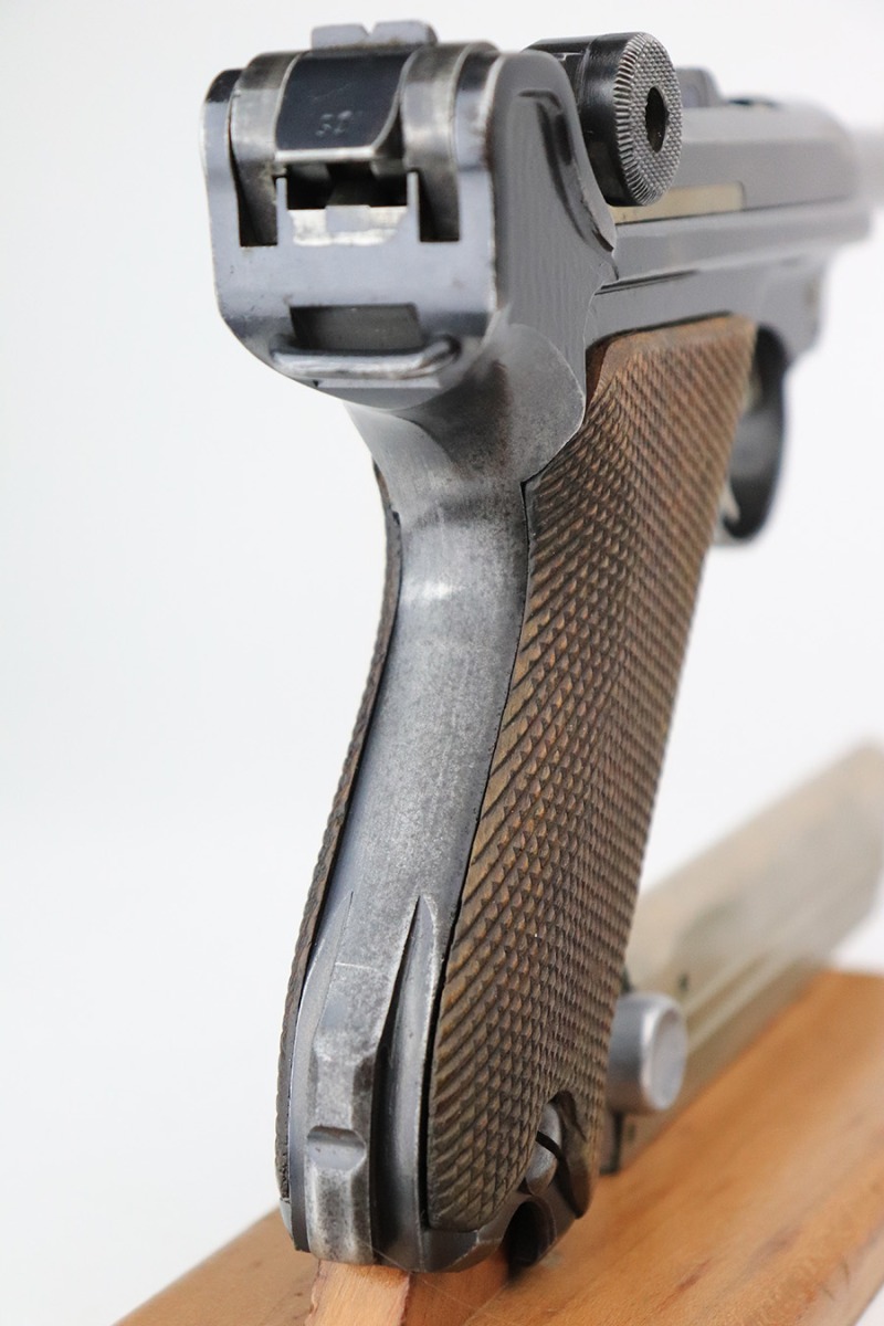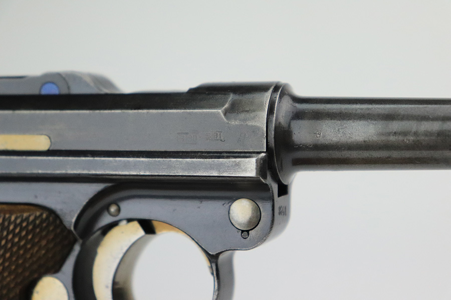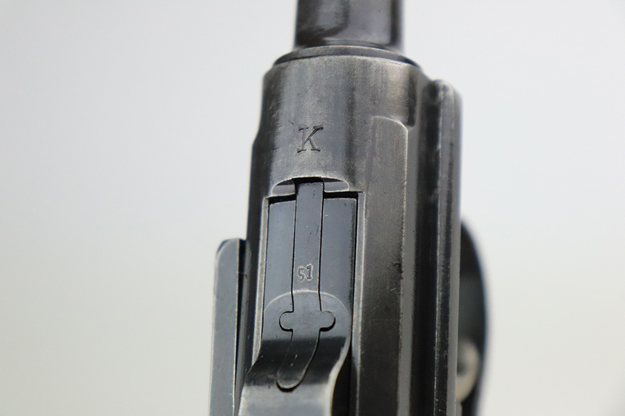 6/8/22 – This is a nice example of a rare K Date Mauser Luger issued to the Nazi military in 1934. It is all matching and has the proper “B90” and “S91” military acceptance proofs. It has retained roughly half of its original finish. There are areas of wear throughout, most noticeable on the barrel, side plate, chamber, and grip straps. Spotty oxidation on the grip straps as well. The side plate is slightly dented. Comes with nice period-correct wood grips – the left panel is numbered and matching, the right panel is un-numbered. There is a tiny chip in the upper corner of the left panel. Also comes with a mismatched “Eagle 63” proofed magazine. Excellent bore with strong rifling.