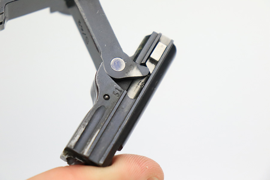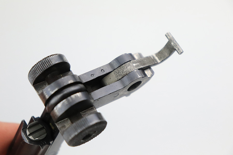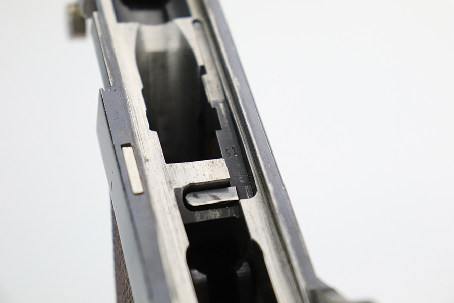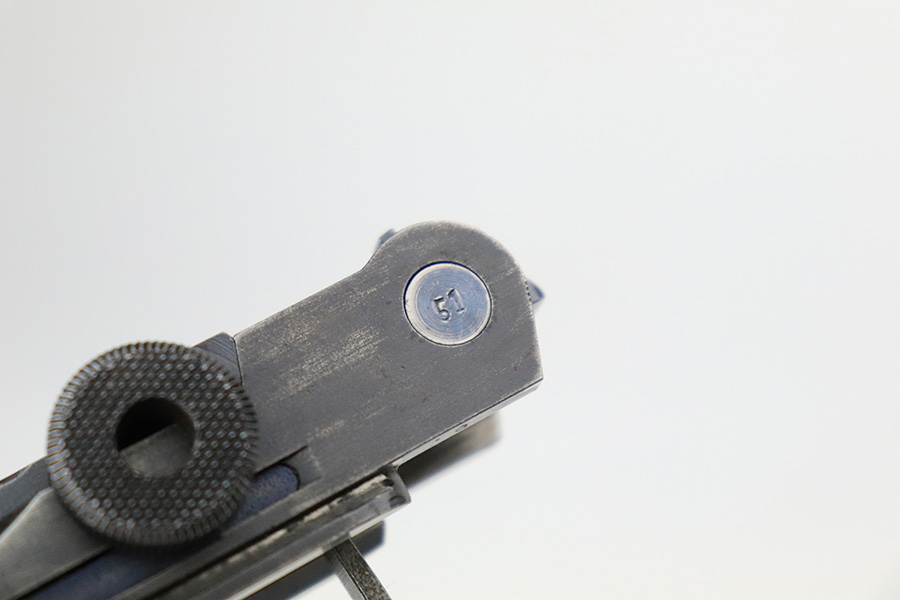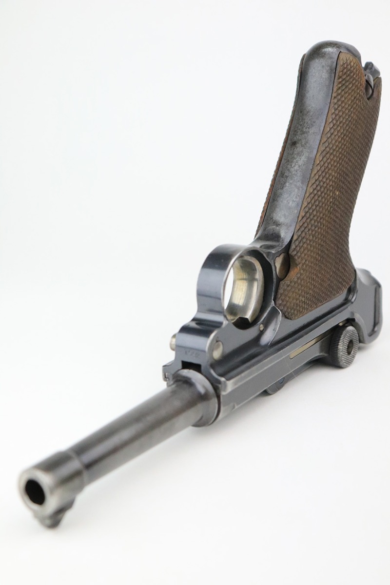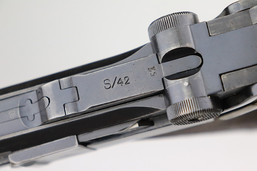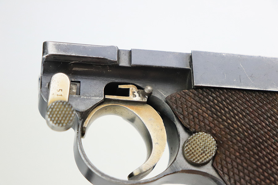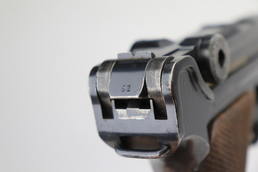 6/8/22 – This is a nice example of a rare K Date Mauser Luger issued to the Nazi military in 1934. It is all matching and has the proper “B90” and “S91” military acceptance proofs. It has retained roughly half of its original finish. There are areas of wear throughout, most noticeable on the barrel, side plate, chamber, and grip straps. Spotty oxidation on the grip straps as well. The side plate is slightly dented. Comes with nice period-correct wood grips – the left panel is numbered and matching, the right panel is un-numbered. There is a tiny chip in the upper corner of the left panel. Also comes with a mismatched “Eagle 63” proofed magazine. Excellent bore with strong rifling.