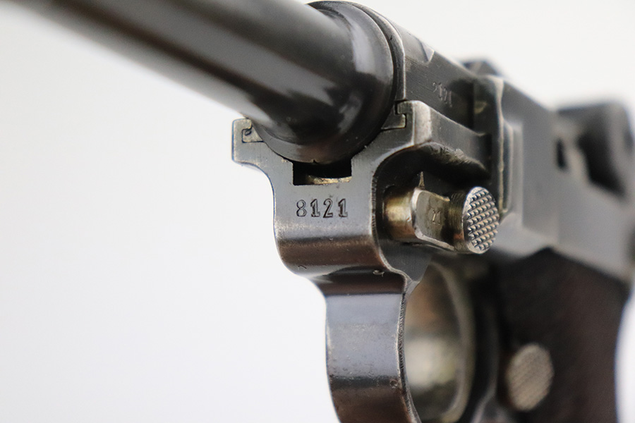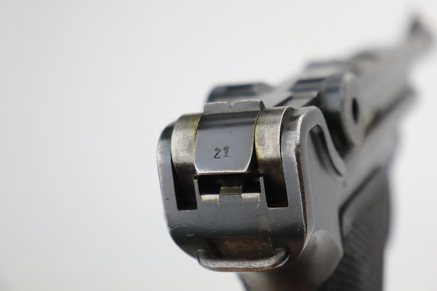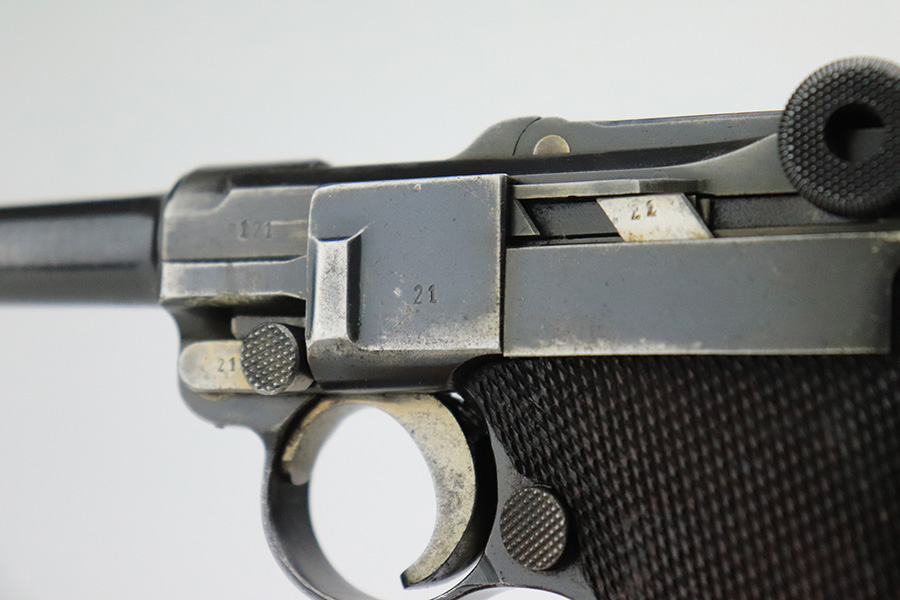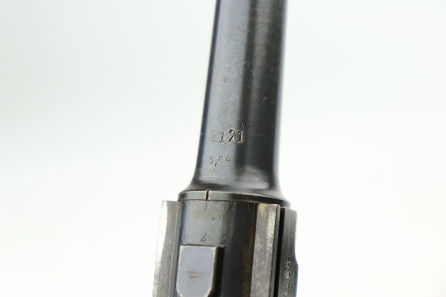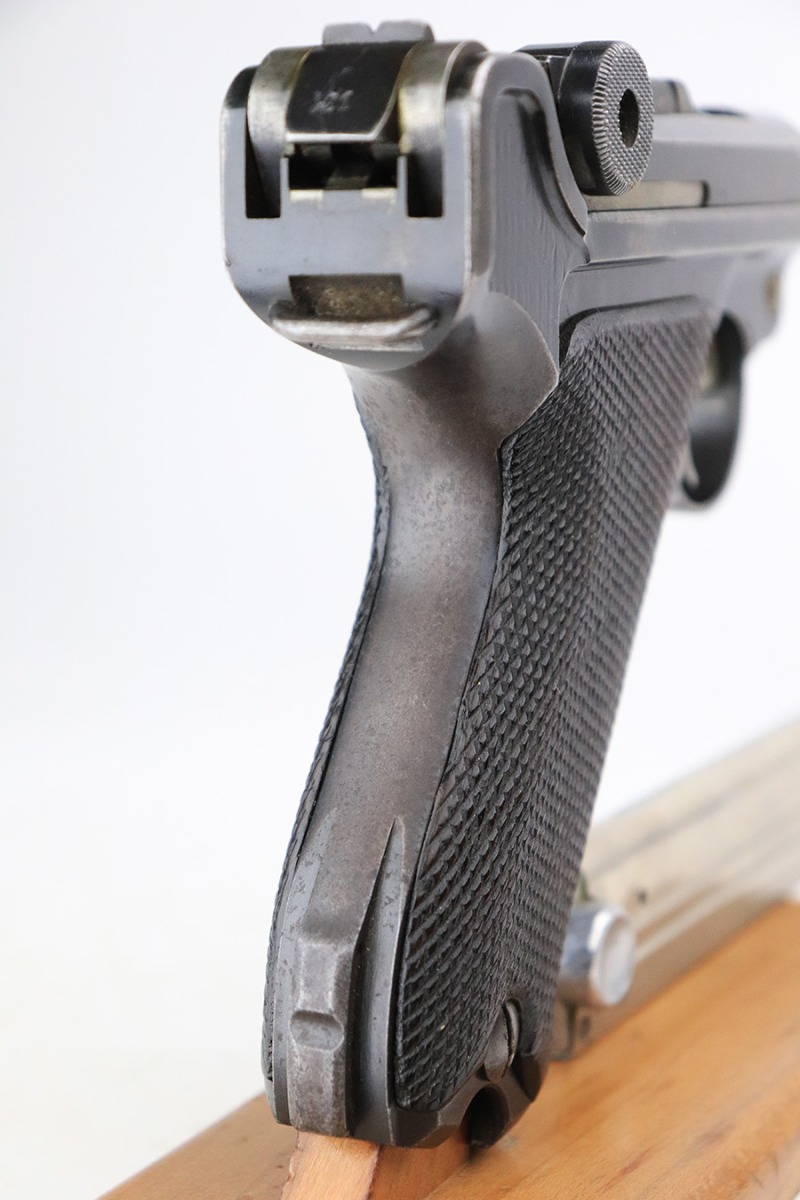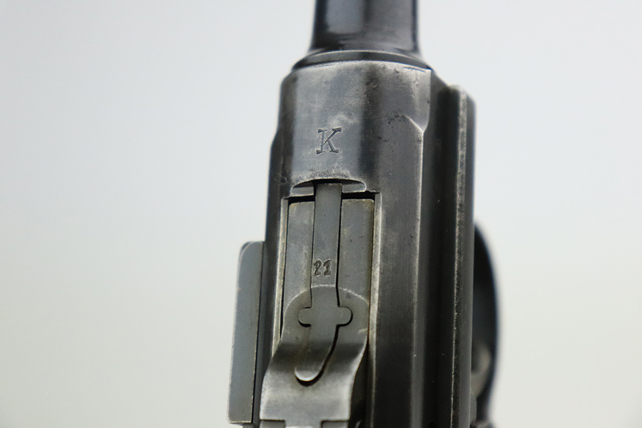 6/15/22 – This is a nice example of a rare K Date Mauser Luger issued to the Nazi military in 1934. It is all matching (except the toggle pin) and has the proper “B90” and “S91” K Date military acceptance proofs. It has retained roughly 75% of its original finish. Most of the wear is spotty on the upper of the gun, concentrated mostly around the muzzle, barrel, side plate, side rails, and on the chamber. Minor thinning and heavy spotty oxidation on the grip straps. Comes with very nice matching-numbered wood grips – some minor bruising. Also comes with a mismatched “Eagle 63” proofed magazine. The bore has decent rifling, but there is minor pin-pricking throughout.