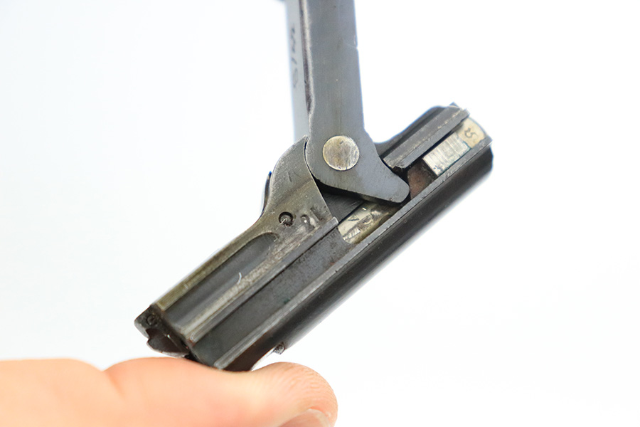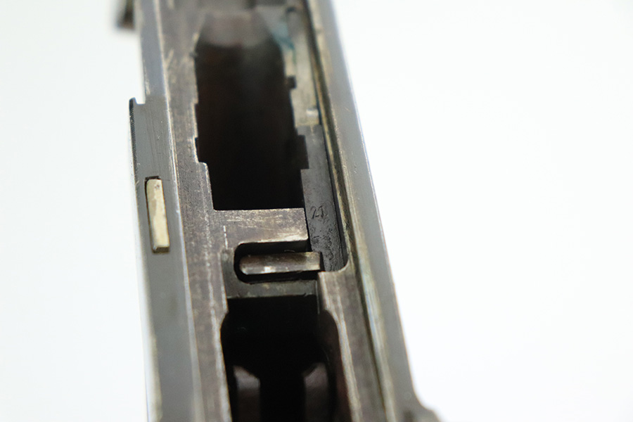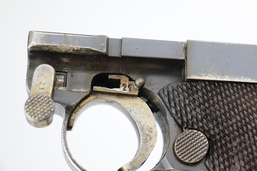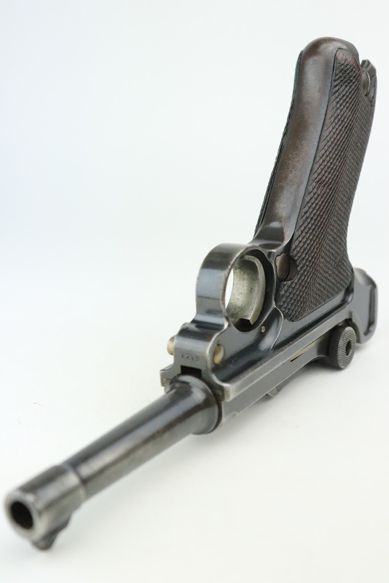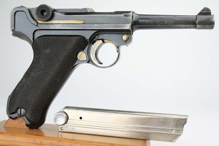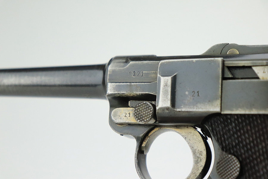 6/15/22 – This is a nice example of a rare K Date Mauser Luger issued to the Nazi military in 1934. It is all matching (except the toggle pin) and has the proper “B90” and “S91” K Date military acceptance proofs. It has retained roughly 75% of its original finish. Most of the wear is spotty on the upper of the gun, concentrated mostly around the muzzle, barrel, side plate, side rails, and on the chamber. Minor thinning and heavy spotty oxidation on the grip straps. Comes with very nice matching-numbered wood grips – some minor bruising. Also comes with a mismatched “Eagle 63” proofed magazine. The bore has decent rifling, but there is minor pin-pricking throughout.