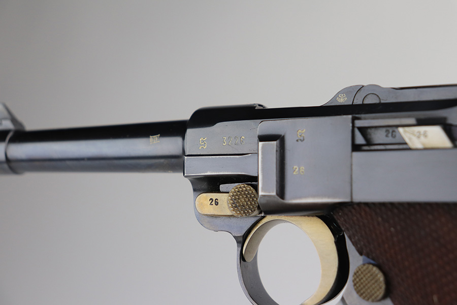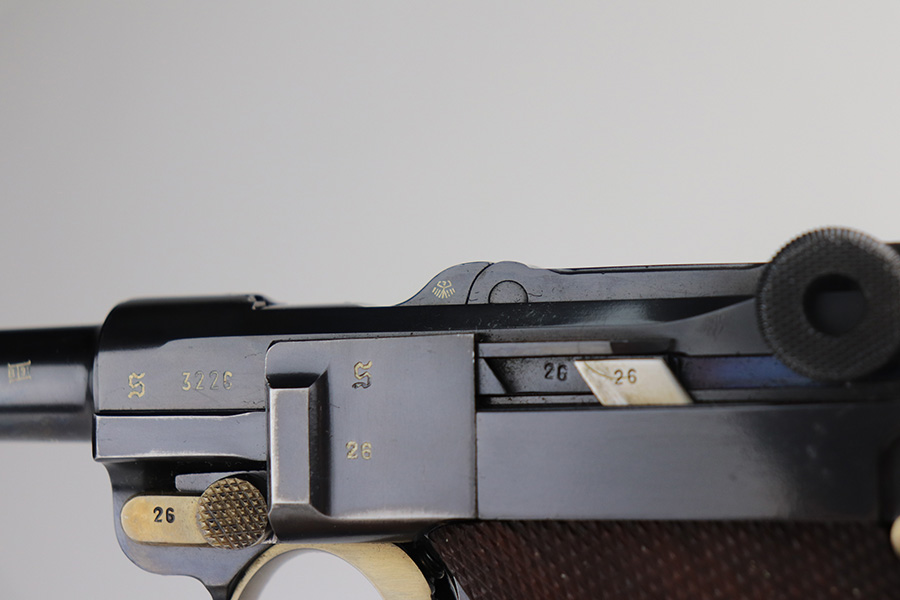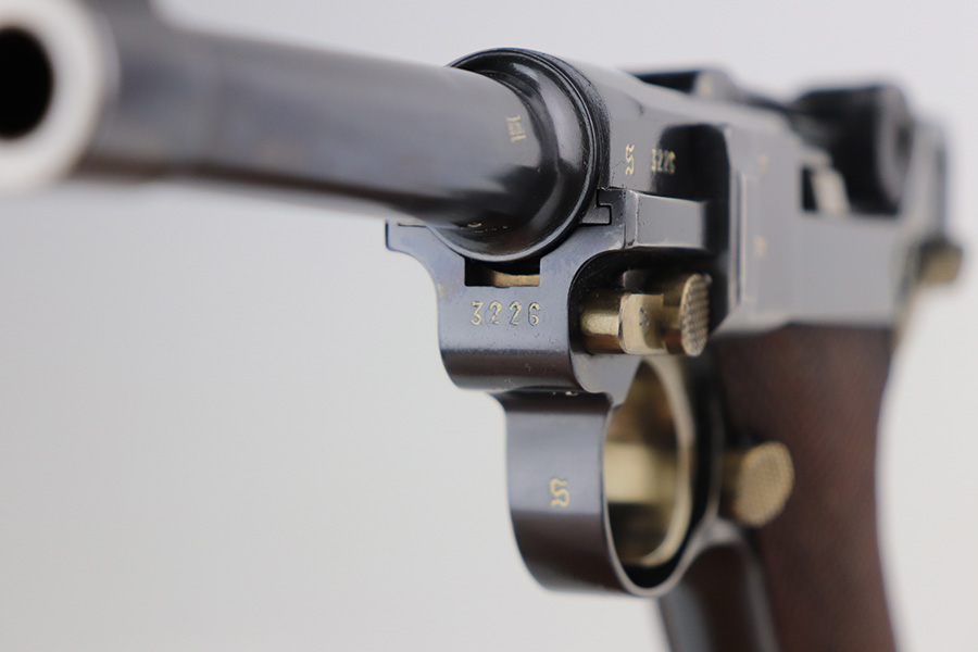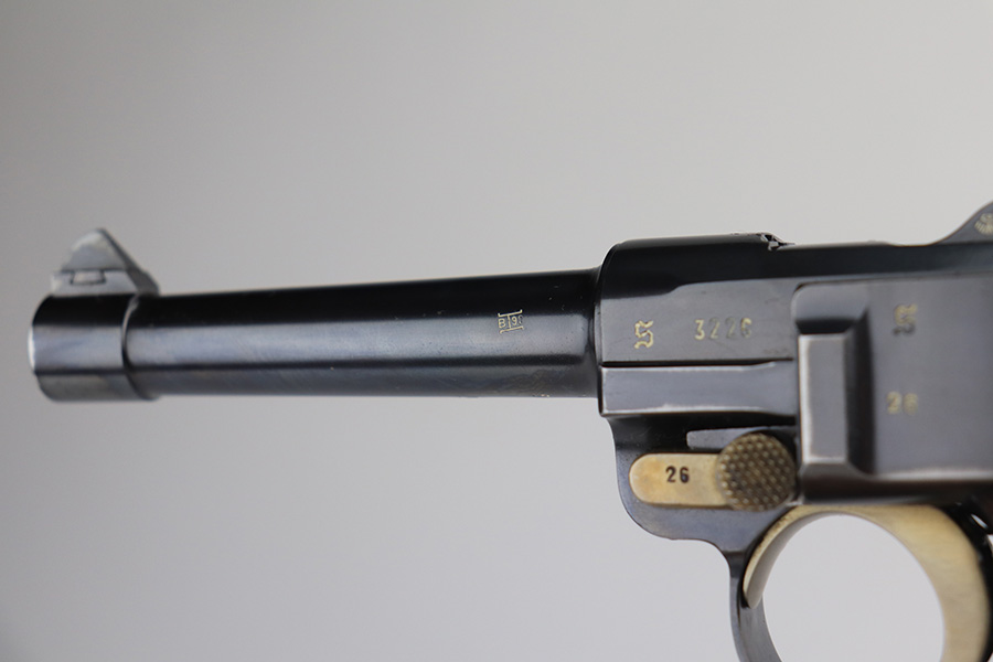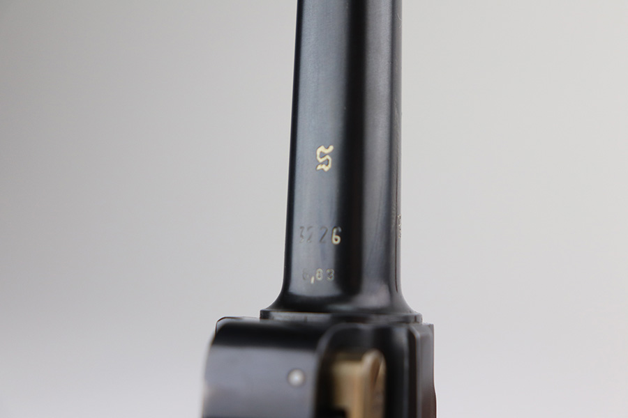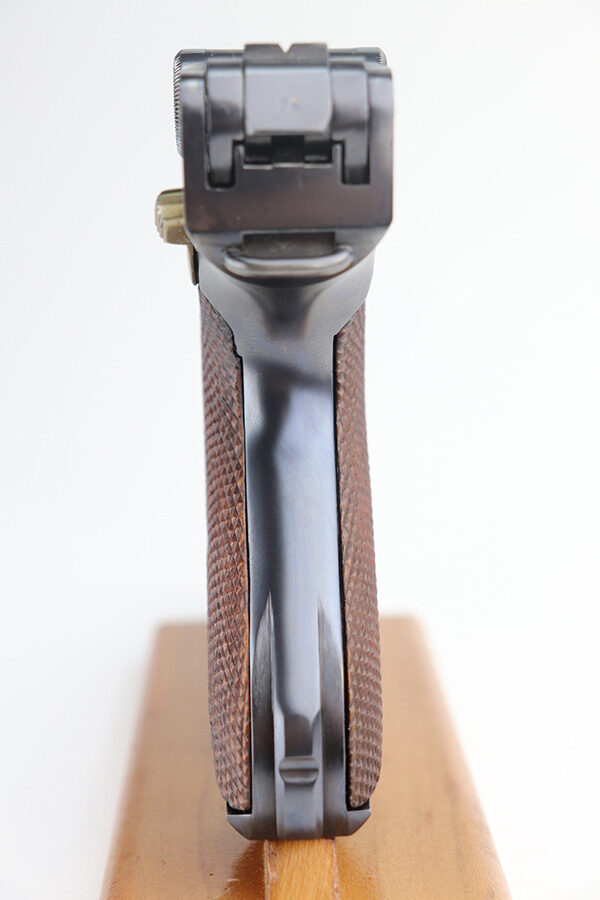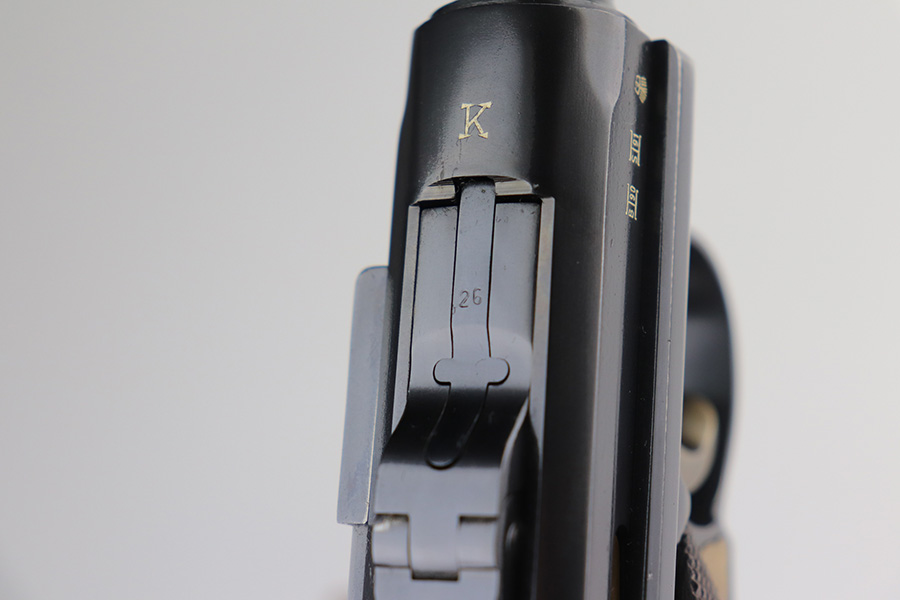 6/15/21 – This is an excellent example of a rare K Date Mauser Luger issued to the Nazi military in 1934. The gun is all matching and has the proper K Date military proofs. The gun is in gorgeous condition, as we believe the gun has been professionally restored, refinished, and the stamps were likely reapplied. Included with the gun is a letter of Authenticity from Collector’s Firearms. The gun has retained about 98-99% of its new bluing with hints of wear on the side plate and side rail. It comes with a matching magazine that was renumbered and is not original to the gun. The bore is excellent – shiny with strong rifling and a hint of freckling in the grooves.