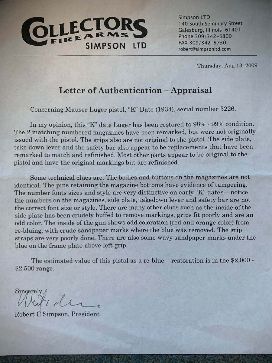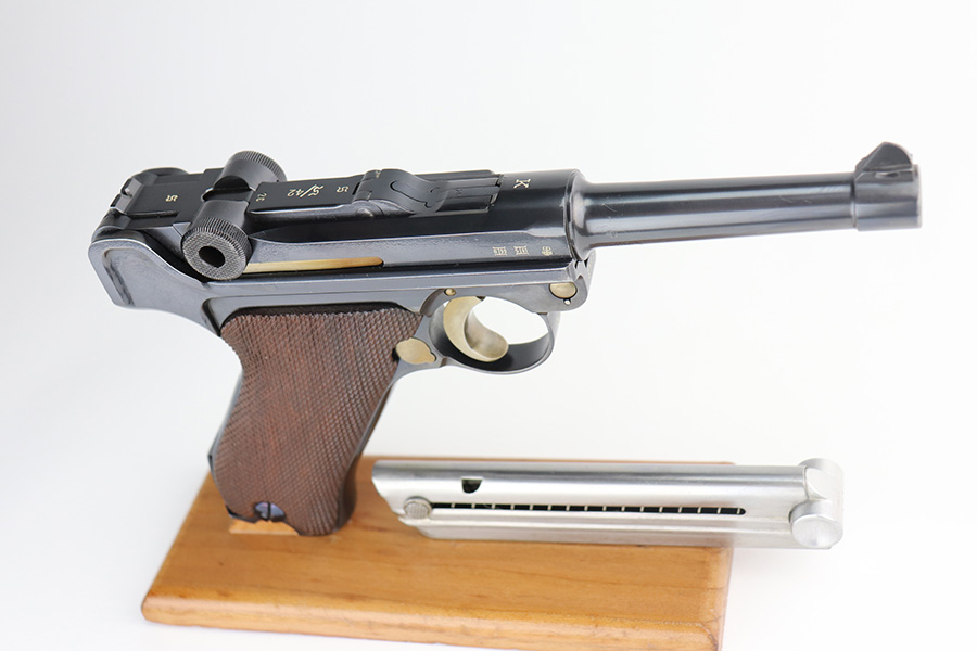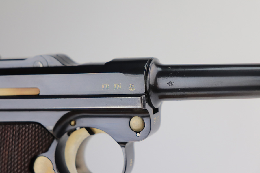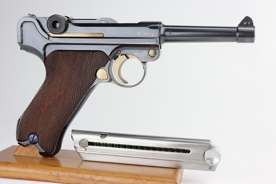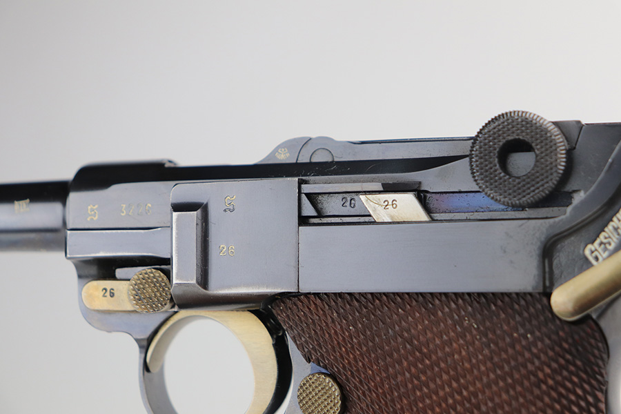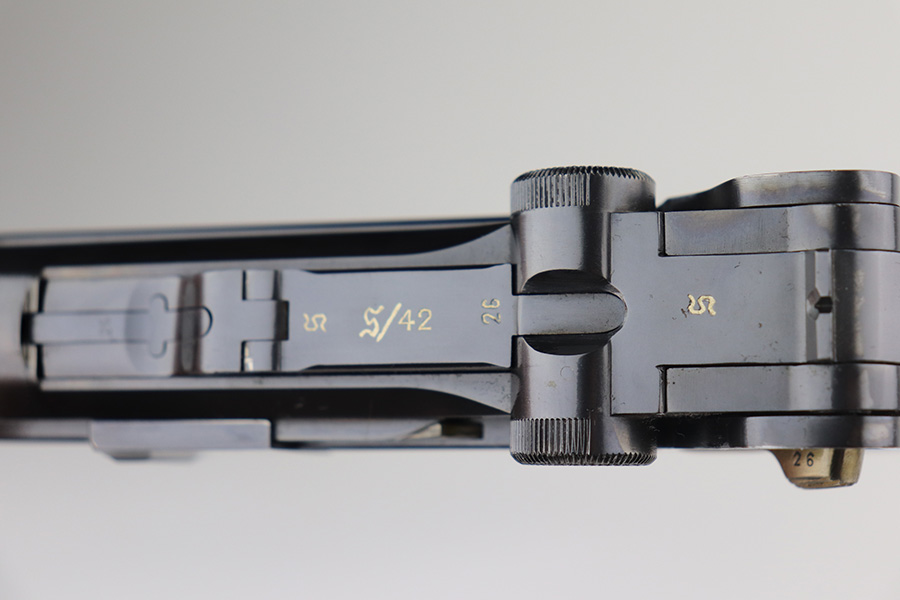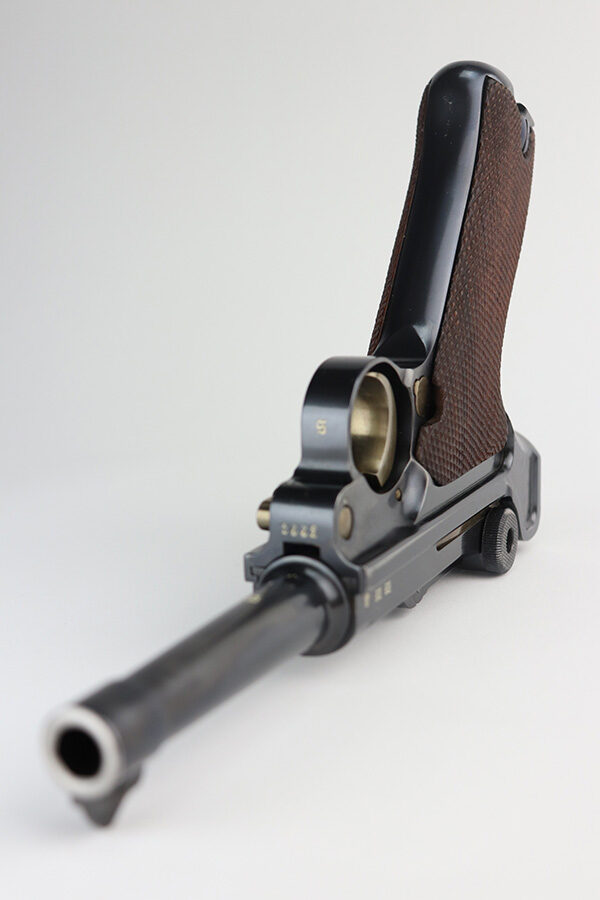 6/15/21 – This is an excellent example of a rare K Date Mauser Luger issued to the Nazi military in 1934. The gun is all matching and has the proper K Date military proofs. The gun is in gorgeous condition, as we believe the gun has been professionally restored, refinished, and the stamps were likely reapplied. Included with the gun is a letter of Authenticity from Collector’s Firearms. The gun has retained about 98-99% of its new bluing with hints of wear on the side plate and side rail. It comes with a matching magazine that was renumbered and is not original to the gun. The bore is excellent – shiny with strong rifling and a hint of freckling in the grooves.