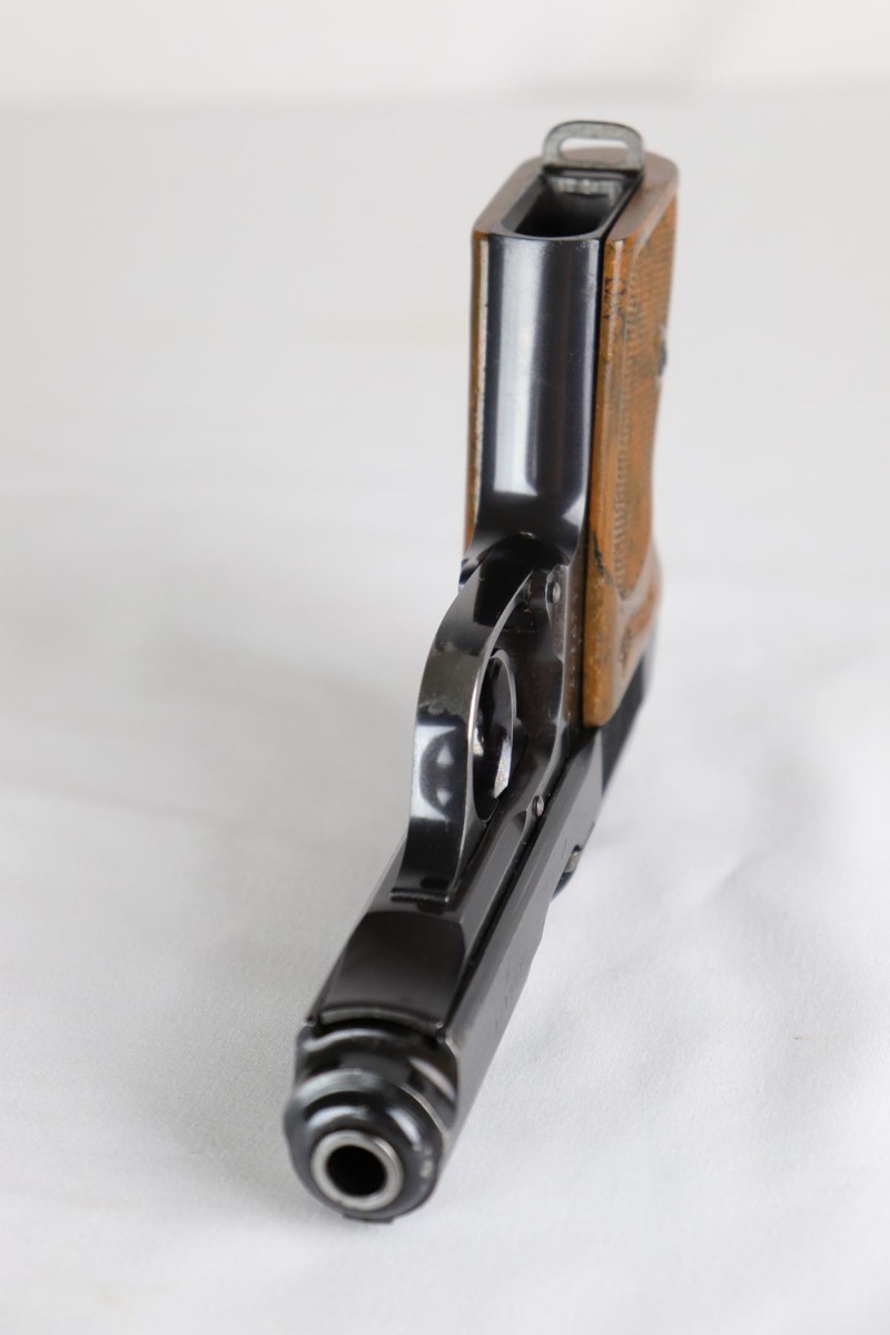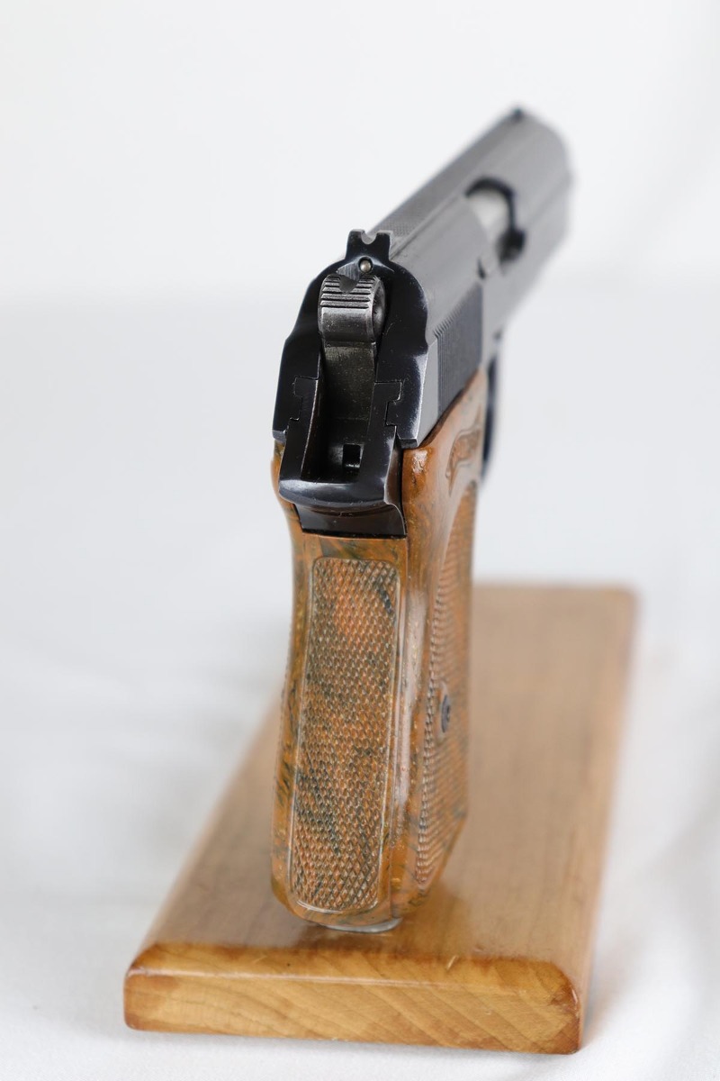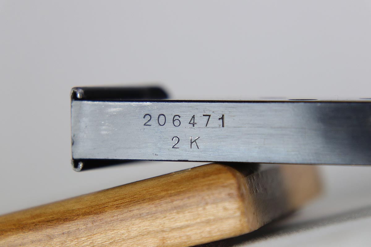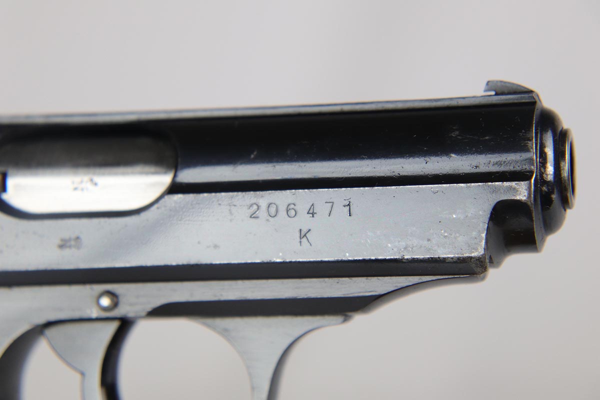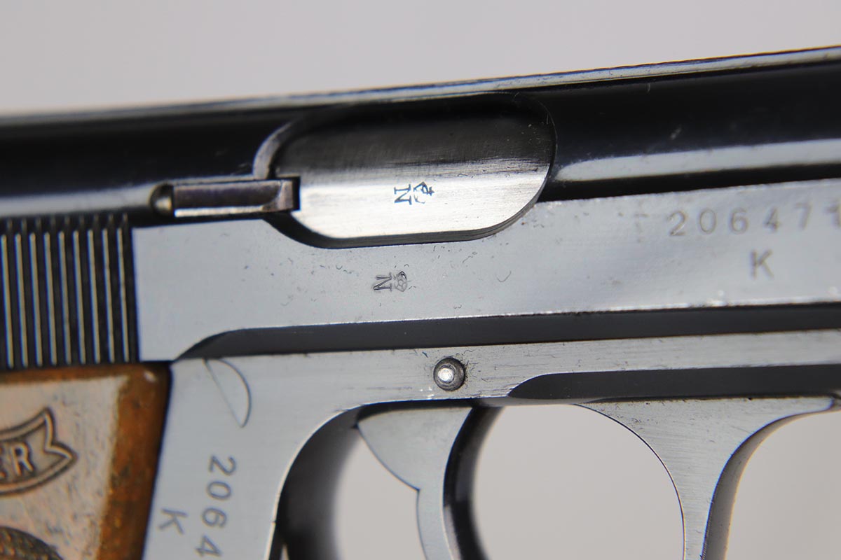 2/21/18 – This is a type 4 SS Walther PPK with original matching magazine. It is known as the “K Under” since the K is below the serial number on the slide and frame. This was only done on the SS pistols and this is a very desirable variation. It is in excellent condition with about 95% of its original finish. There is some minor slide wear, as well as an area of finish loss on the trigger guard. The bore is excellent and shiny.  Excellent grip with no chips or cracks.