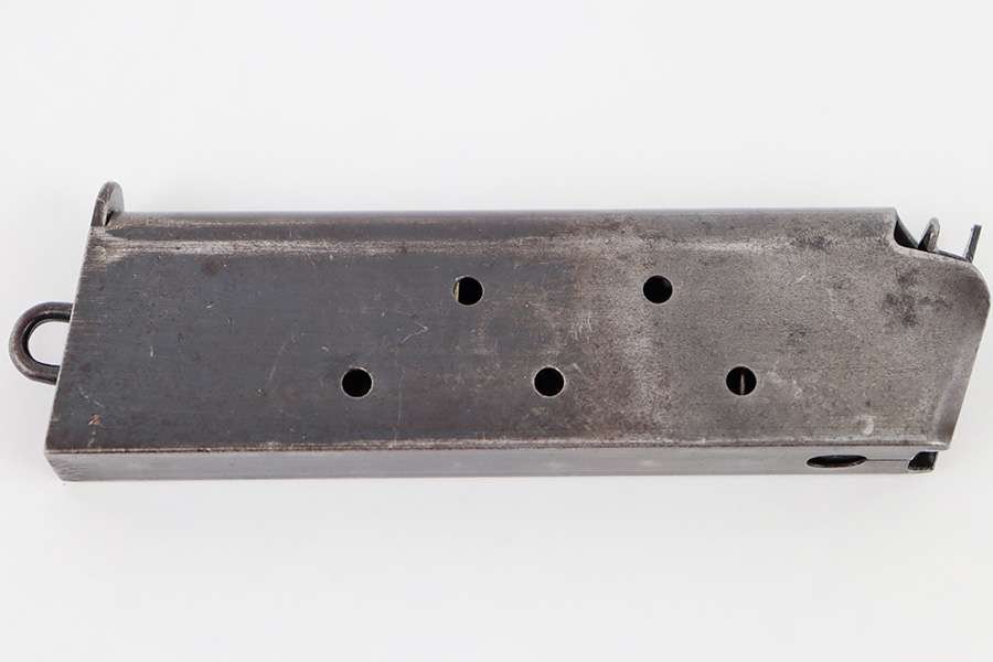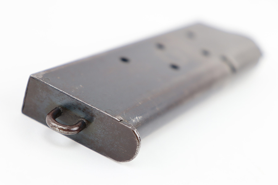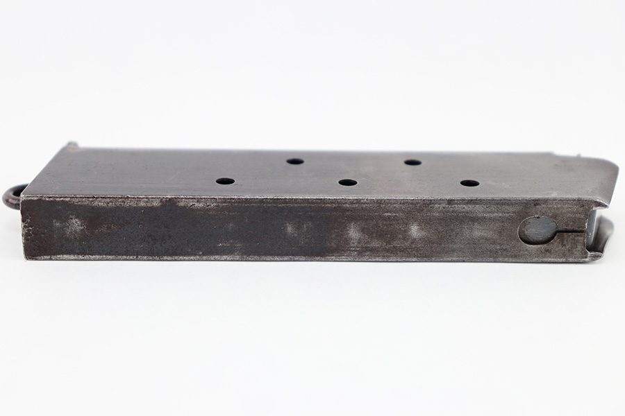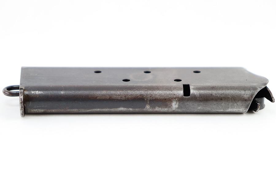 8/24/23 – This is an original, early Colt production M1911 magazine. The magazine has a rare “keyhole” in the spine of the magazine. The two toned finish is still visible, but covered in natural browning patina. The follower and base show mild wear but also retain some of the original finish. No rust or pitting and a fully functional spring.