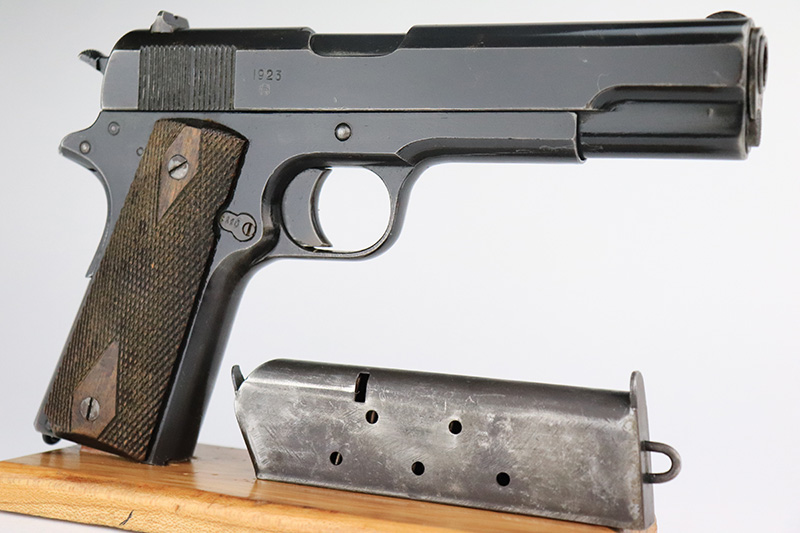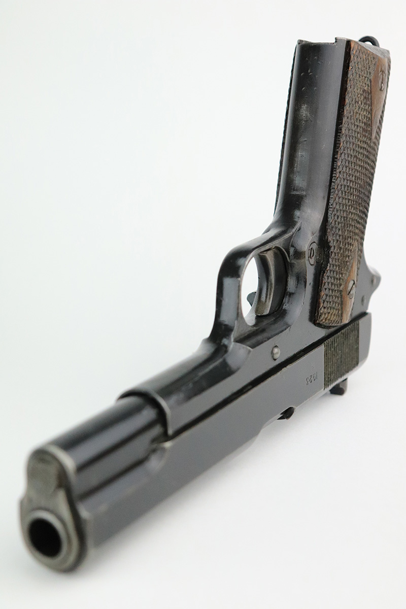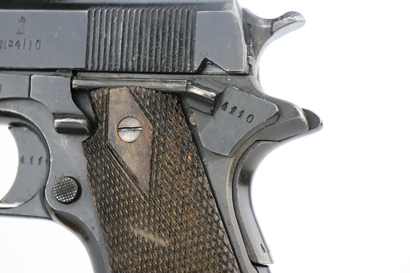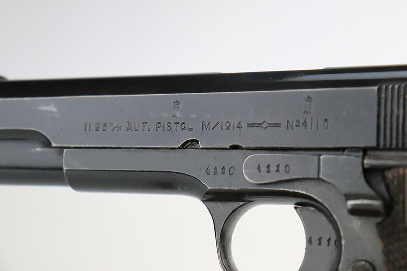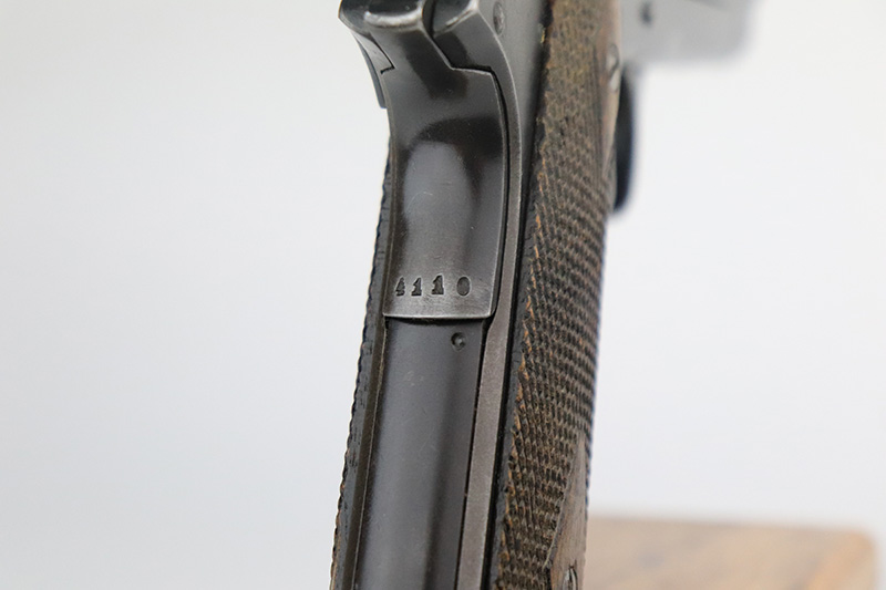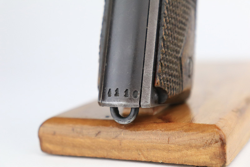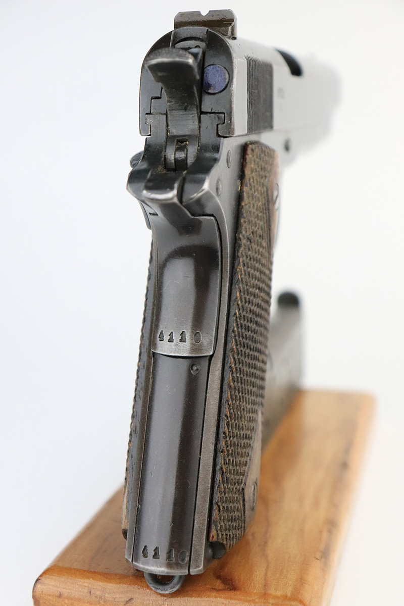 9/27/23 – This is a rare and fairly early Kongsberg Model 1914 from 1923. One of only ~1650 produced that year, it’s all matching and original throughout. Matching serials down to the bushing and barrel. The original finish rates at about 95% with a spot of wear on the front strap, left side slide, grip safety and around the muzzle. Excellent, shiny bore. Proper Norwegian mag with lanyard ring. Nice grips with no cracks, but the left panel does have a visible gouge.