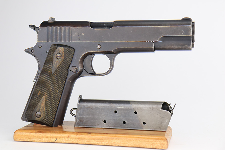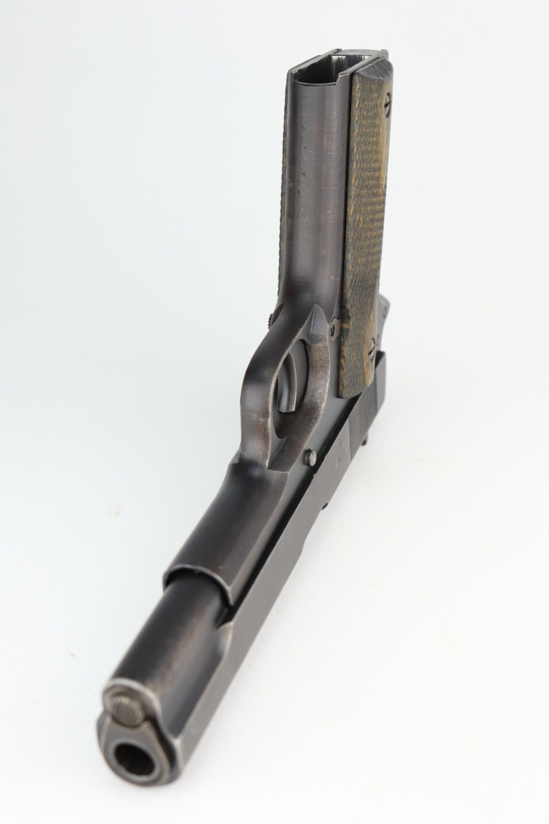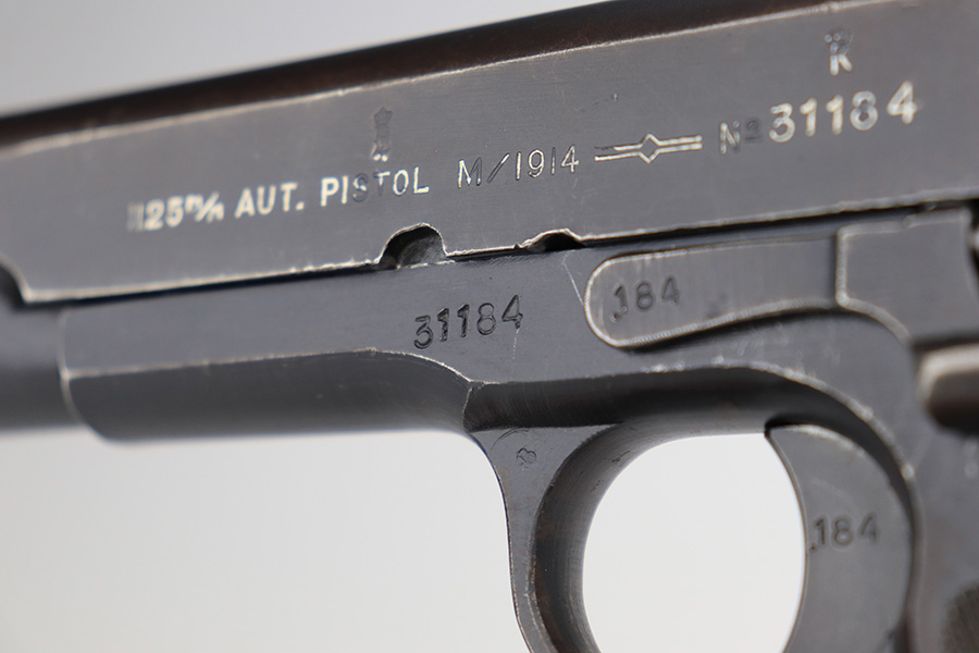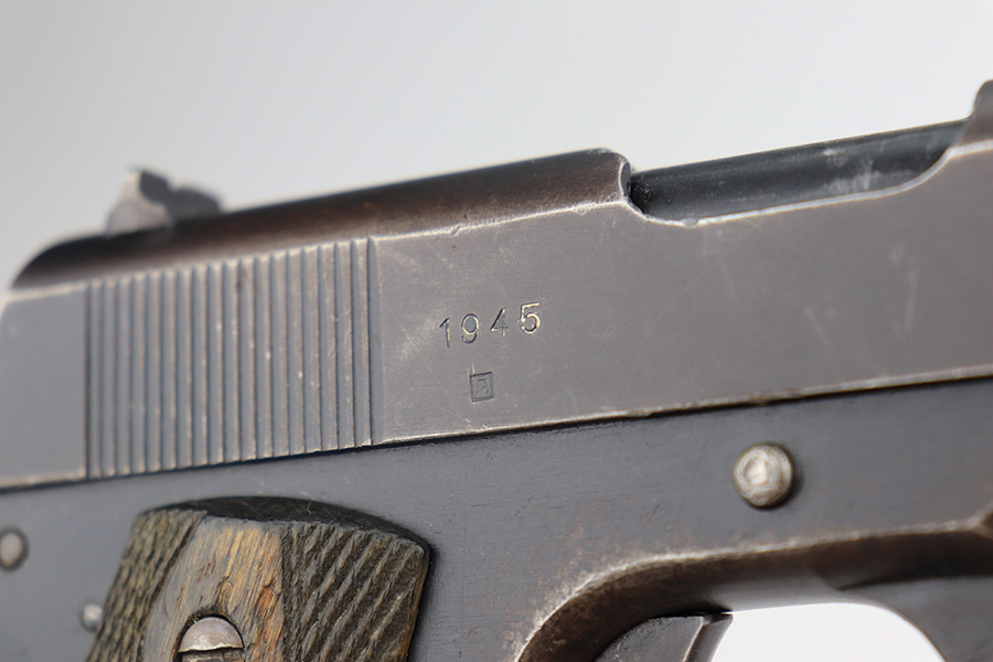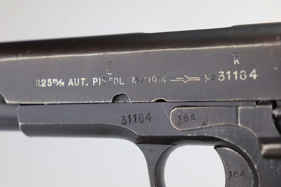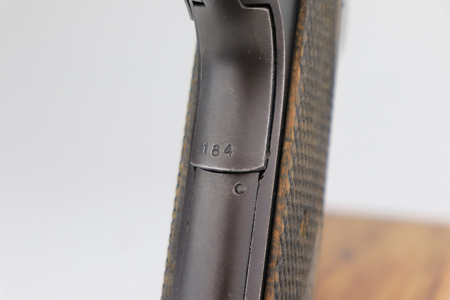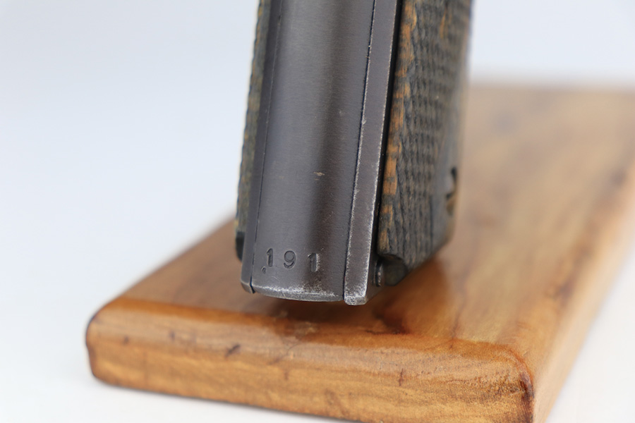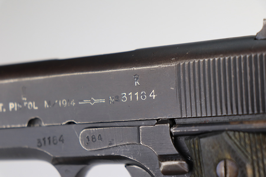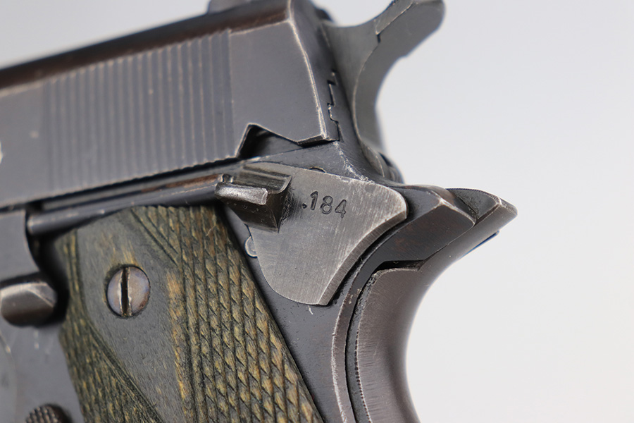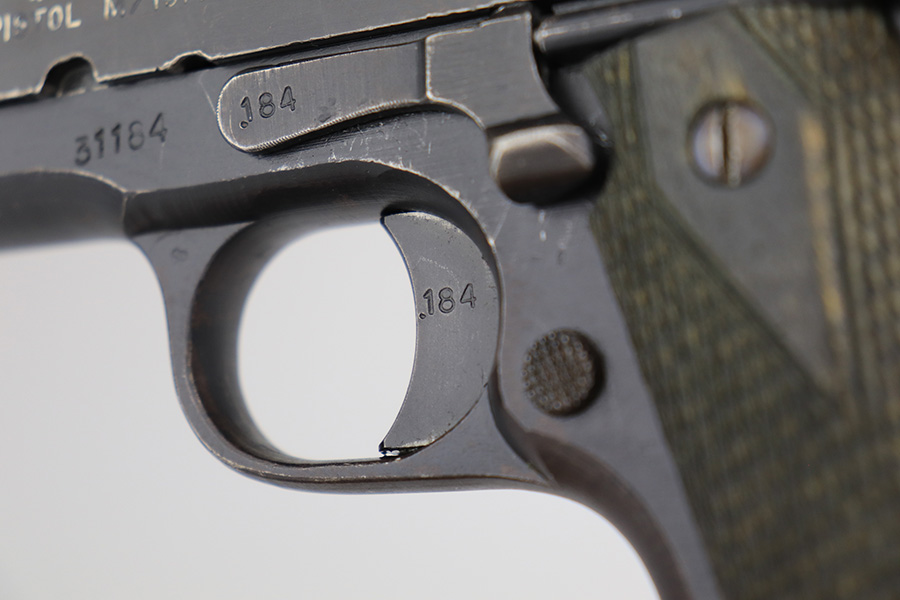 5/7/24 – This is an excellent example of a rare Kongsberg M1914 from 1945. This variation was assembled after the end of the war from the parts on hand, one of 1,800 produced. This one is all original, with mostly matching numbers. The mainspring housing is serialized ‘191’ and the barrel is ‘186’, as compared to the rest of the pistol (184). As these were assembled from the leftovers, these nearly matching parts very likely left the factory with this pistol. The original finish is in excellent condition with minor wear on either side of the muzzle and just a little on the bottom of the mainspring housing. Strong bore with just a little frost in the grooves. Excellent stained birch grips with no cracks.
