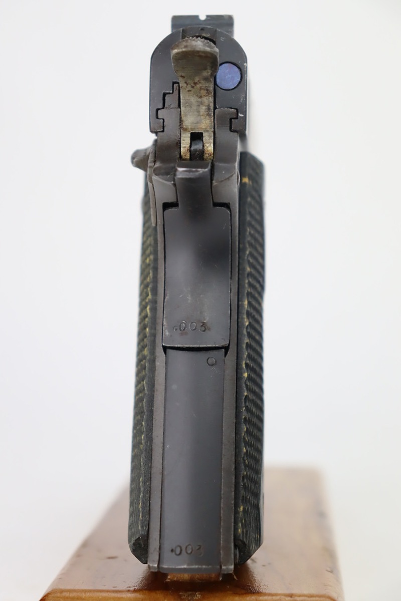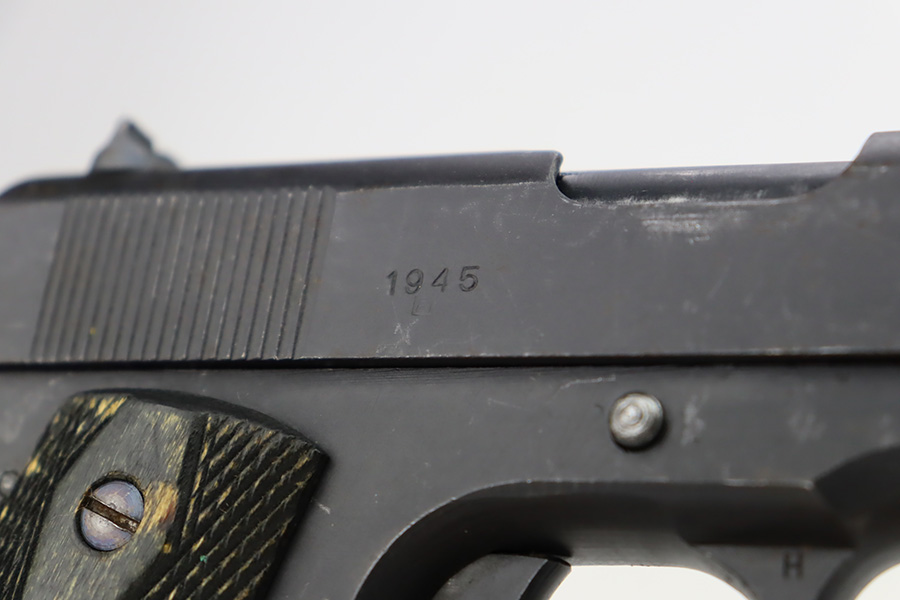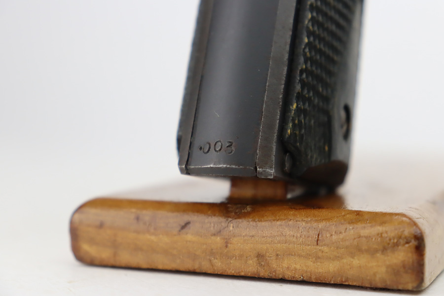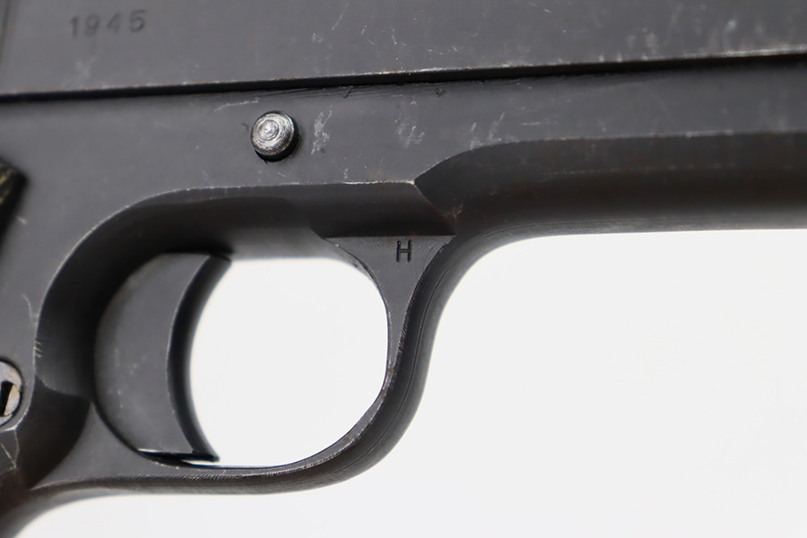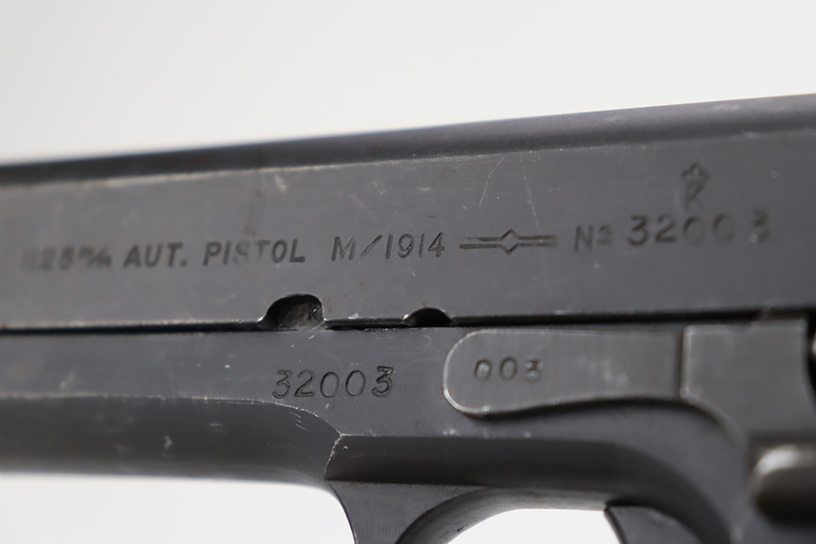 9/27/23 – This is an excellent example of a rare Kongsberg M1914 from 1945. This variation was assembled after the end of the war from the parts on hand, one of 1,800 produced. This one is all original, with all matching numbers. As these were assembled from the leftovers, these are very hard to find in all matching configuration. The original finish is in excellent condition with minor wear on either side of the muzzle and a little on the front strap. Mint bore. Excellent stained birch grips with no cracks.