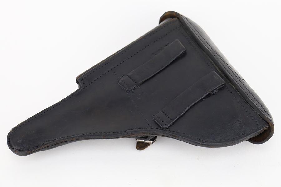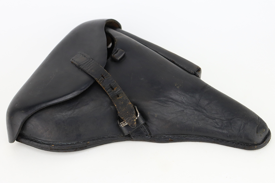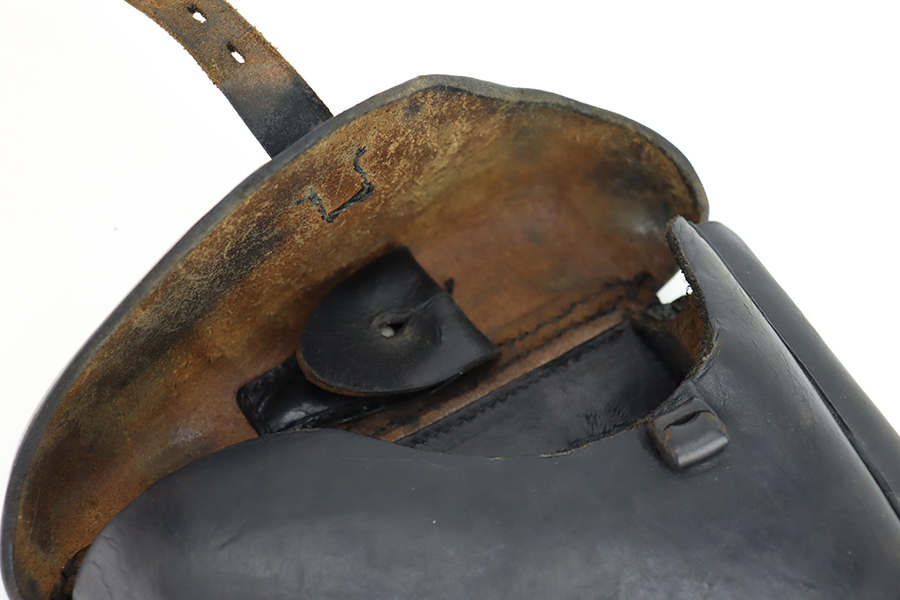 2/1/24 – This is an original, desirable variation Krieghoff Luger holster from WW2. The interior leather is fairly clean and shows a distinct Krieghoff eagle/2 proof stamp. Generally, the leather is soft and workable. The top stitches on the belt loops look replaced. The rest of the stitching is good. There is a rectangular adhesive stain on the top flap, probably from an old piece of tape.