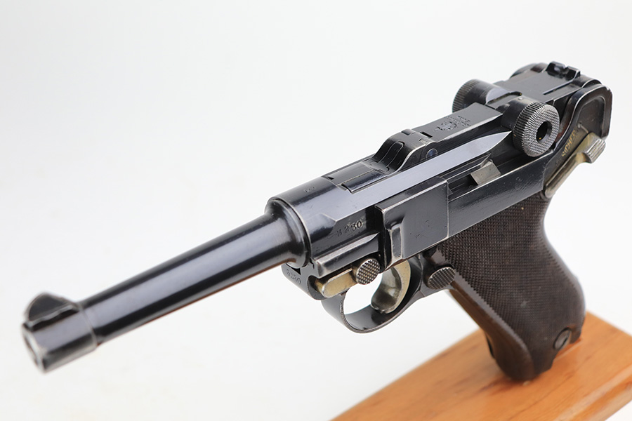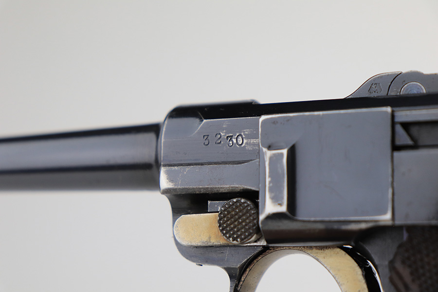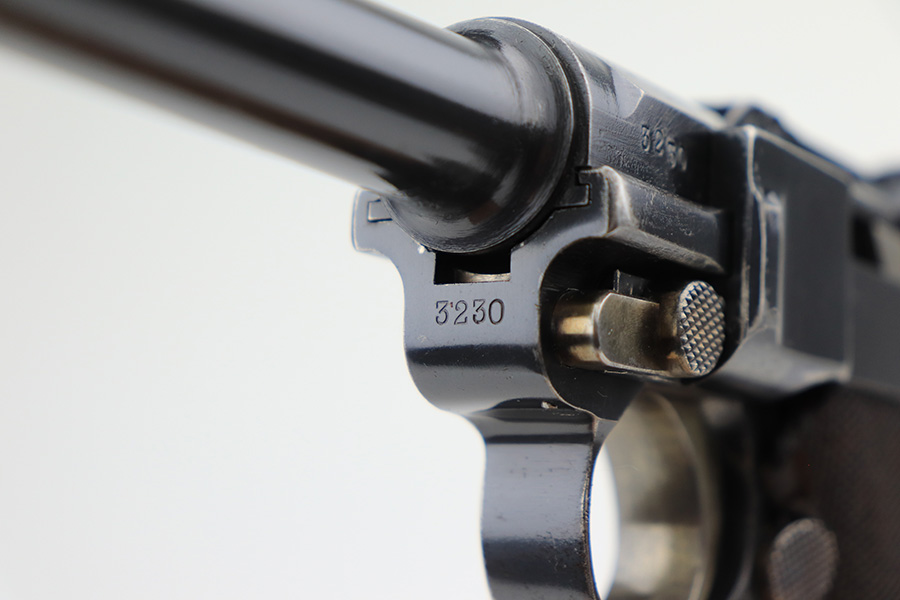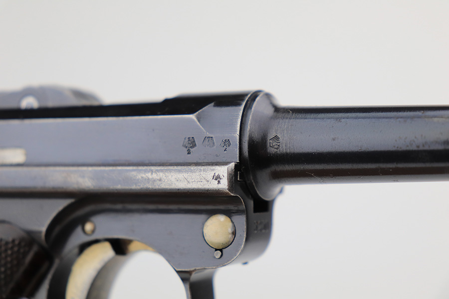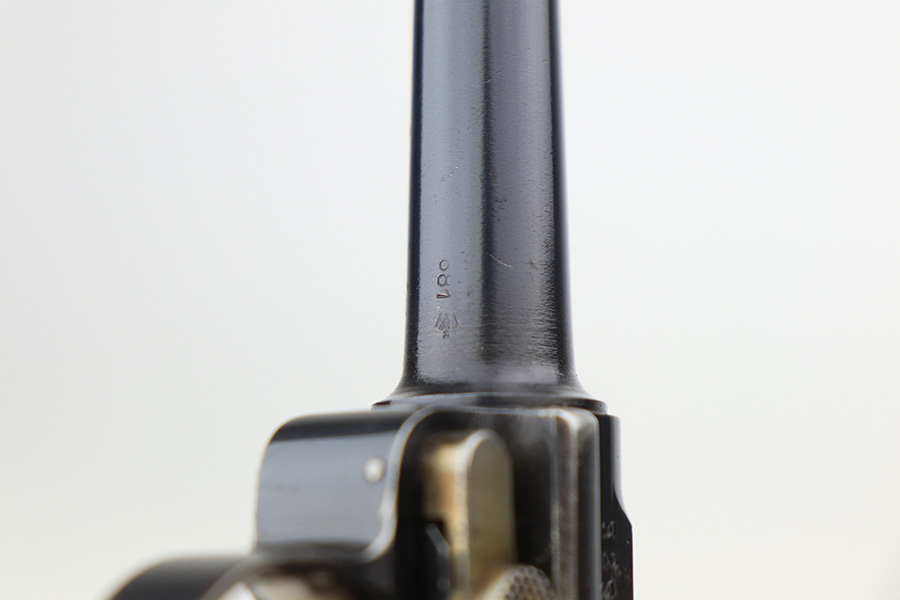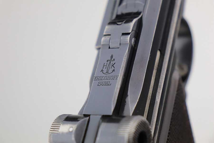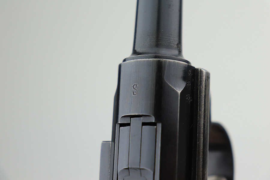 3/3/22 – This is a rare Krieghoff Luger from 1936 with an S Code on the receiver. There were only about 3,600 of this variation produced. This one is all matching and has the proper Krieghoff “Eagle L 2” Luftwaffe acceptance proofs. It has retained roughly 85-90% of its original finish. There’s mild finish loss on the sideplate, muzzle and right side rail. There’s also some wear on the bottom of the front strap, but both straps show patina and oxidation. Excellent straw on the small parts. Original Krieghoff grips with handling wear on both panels, and a chip in the upper corner of the left panel. WW2-era Nazi magazine but Mauser-made. Strong, shiny bore.
