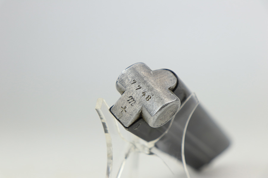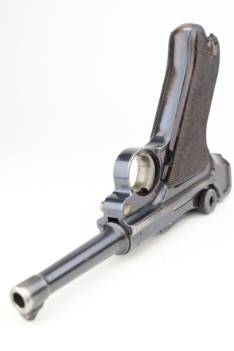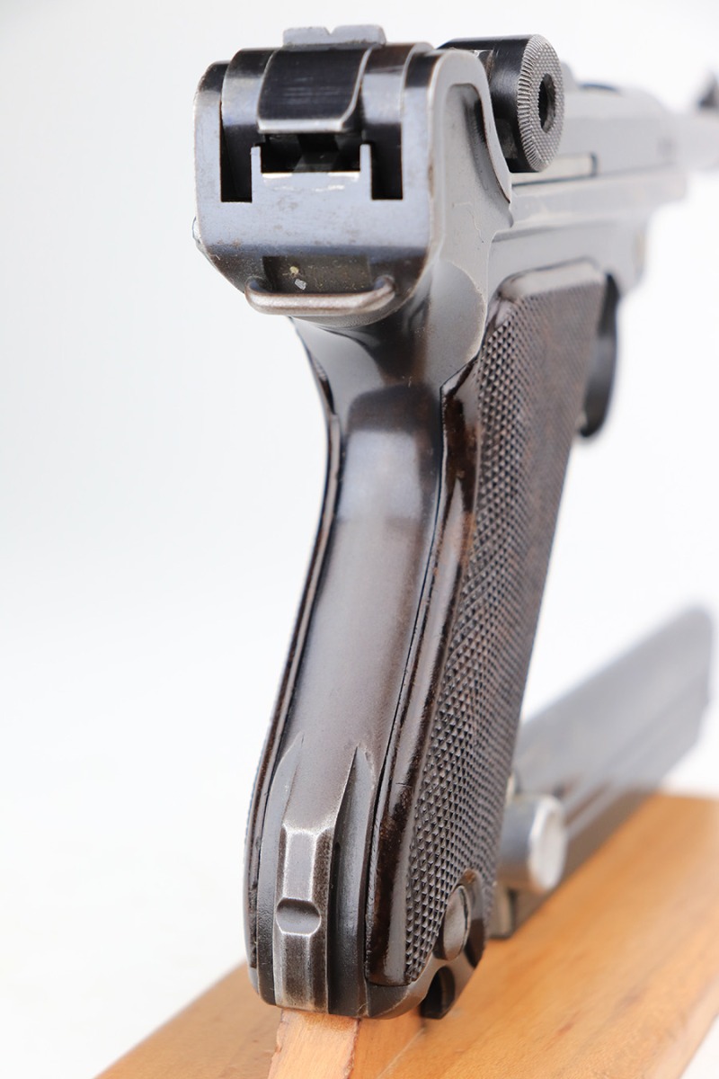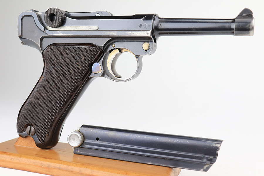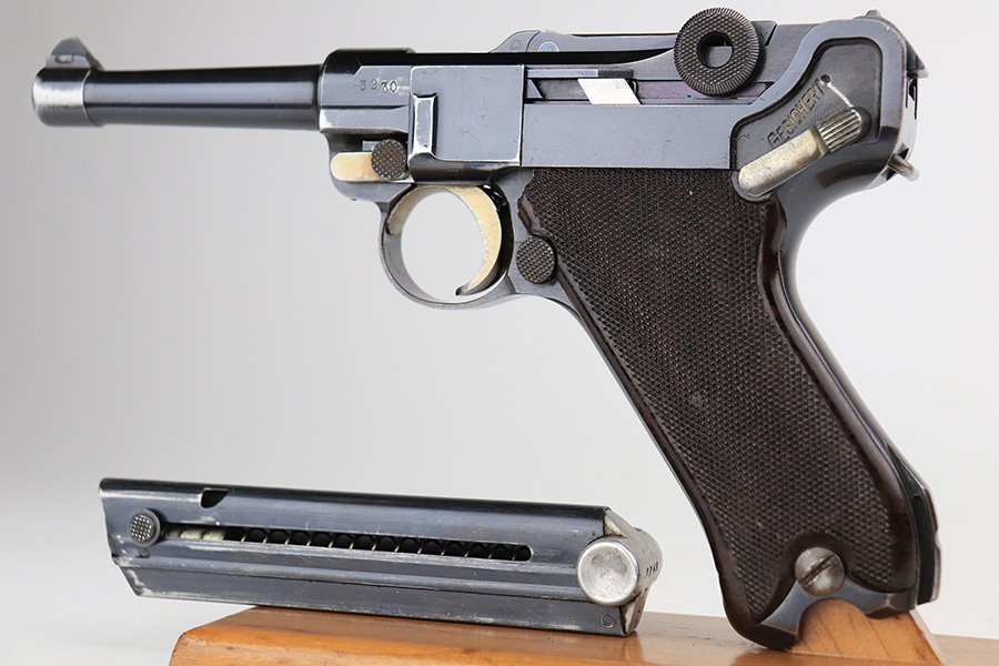 3/3/22 – This is a rare Krieghoff Luger from 1936 with an S Code on the receiver. There were only about 3,600 of this variation produced. This one is all matching and has the proper Krieghoff “Eagle L 2” Luftwaffe acceptance proofs. It has retained roughly 85-90% of its original finish. There’s mild finish loss on the sideplate, muzzle and right side rail. There’s also some wear on the bottom of the front strap, but both straps show patina and oxidation. Excellent straw on the small parts. Original Krieghoff grips with handling wear on both panels, and a chip in the upper corner of the left panel. WW2-era Nazi magazine but Mauser-made. Strong, shiny bore.