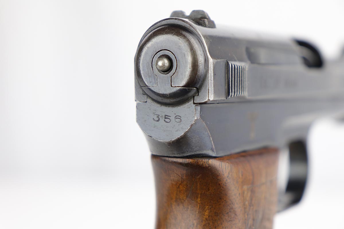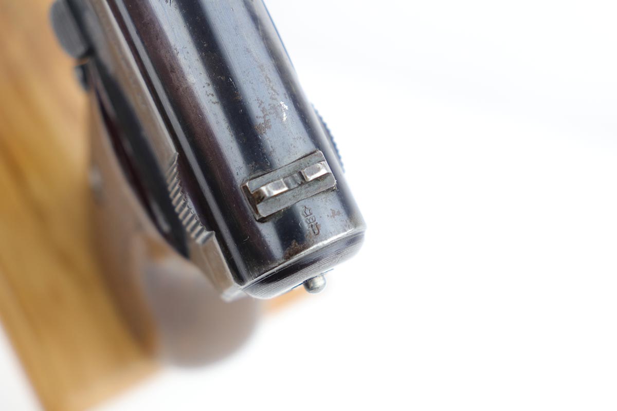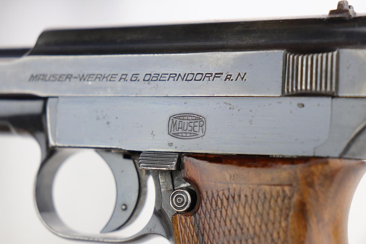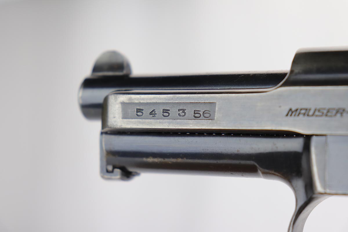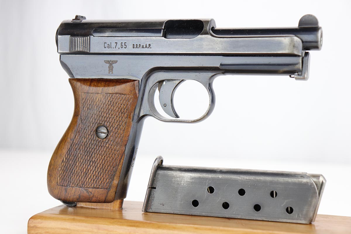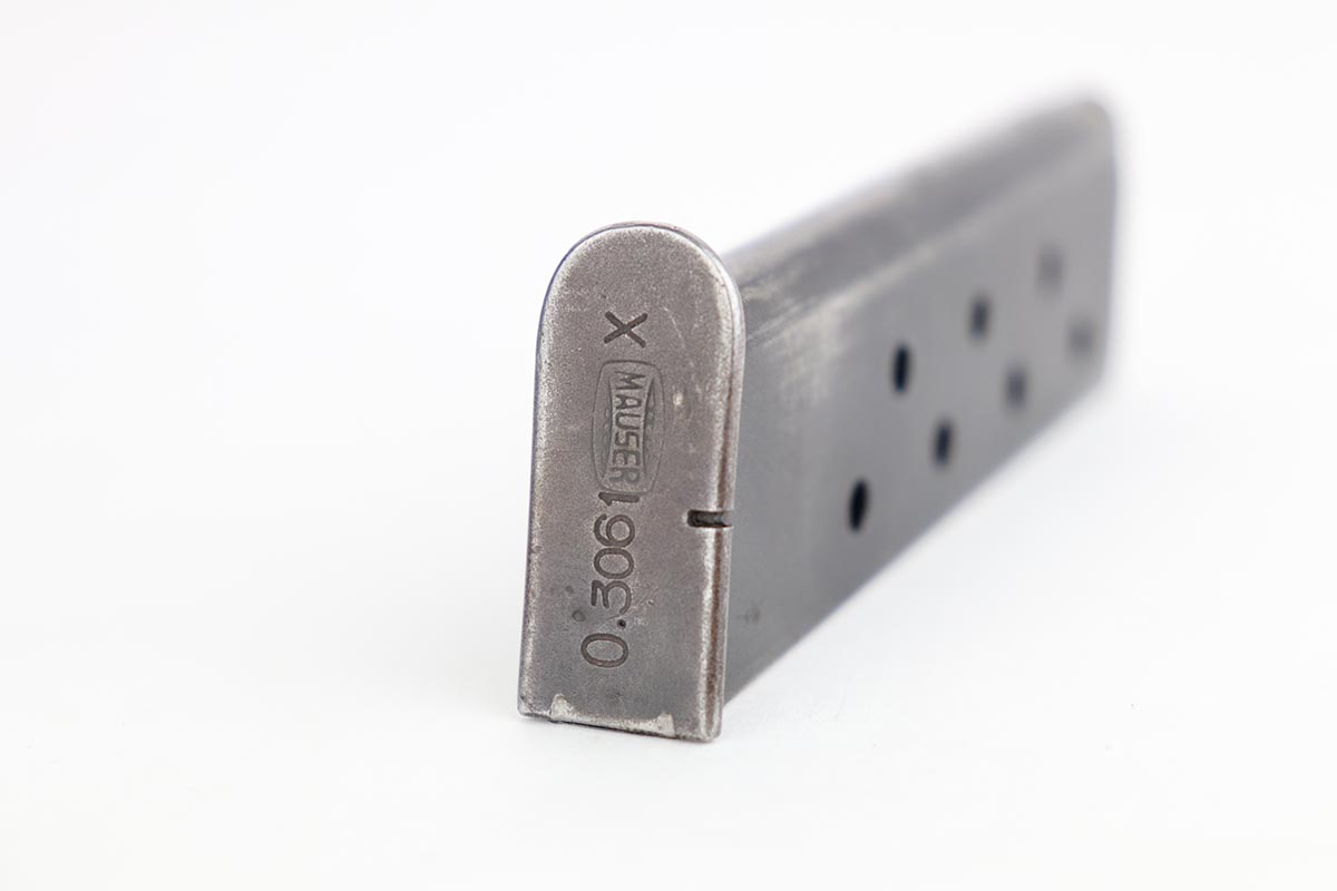 1/16/20 – This is a rare Mauser M1934 that was issued to the German Kriegsmarine. It’s a second variation pistol, one of only 3,000 produced with Navy eagle over M marking on right side of frame, and Ostmark property mark on front strap. This rare piece also comes with the original, matching magazine! The blue rates at about 80-85% with areas of thinning or patina on the front strap, trigger guard, both side rails and the top of the slide. Excellent bore. Crown over U proof and serial date this one to mid-late 1930s. Grip has a minor chip on right side in the upper corner.