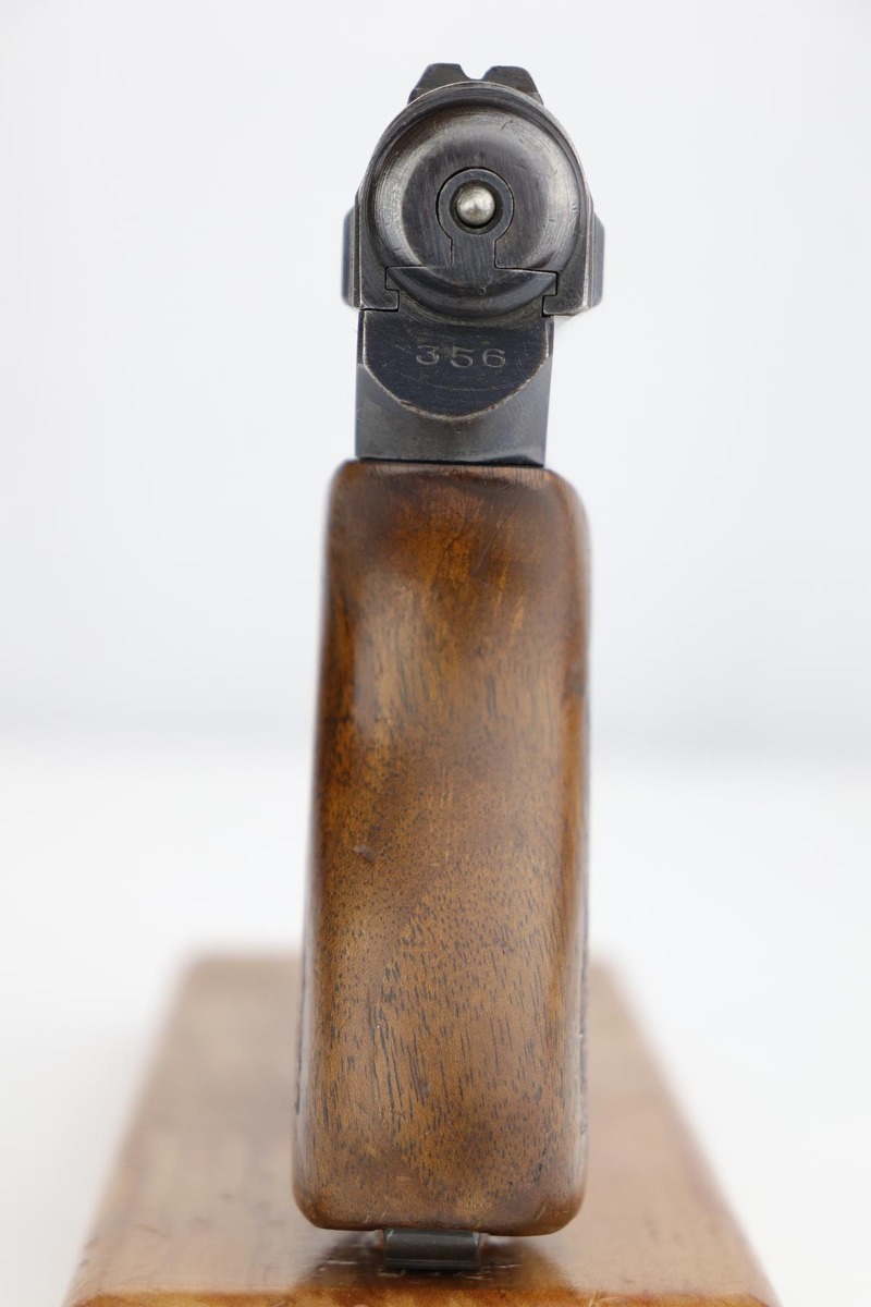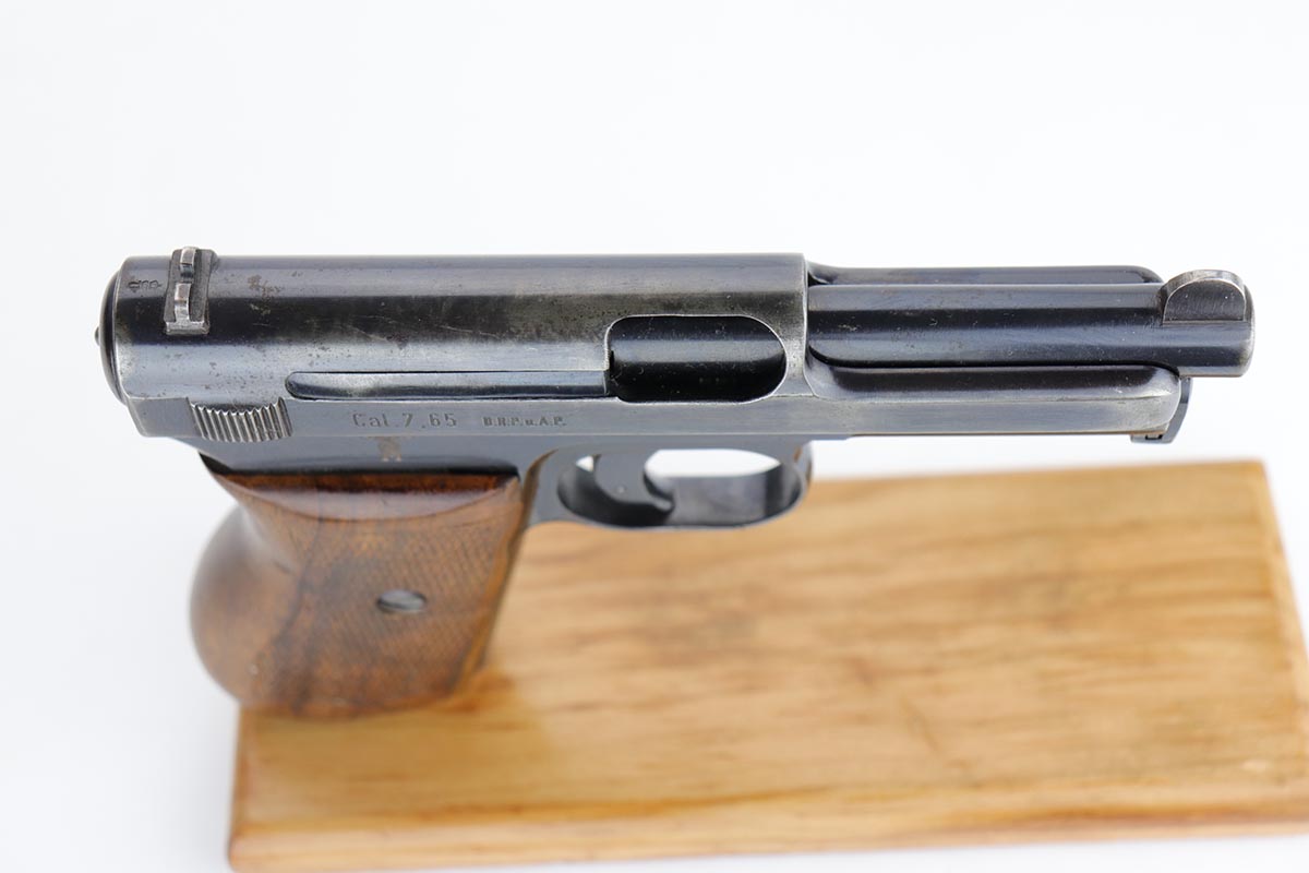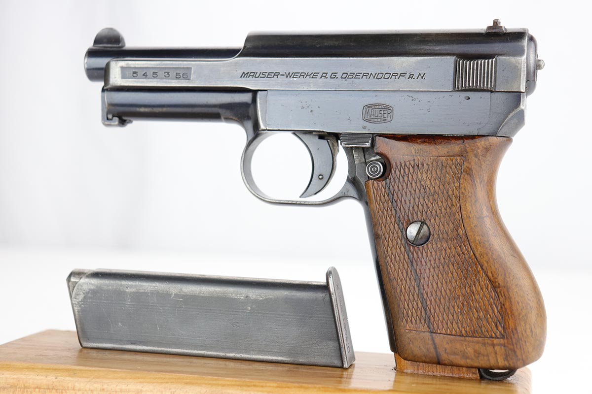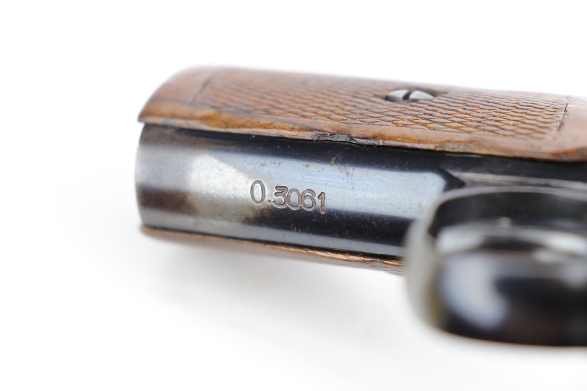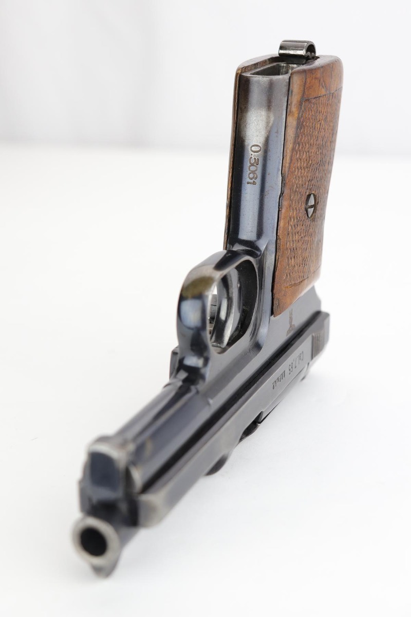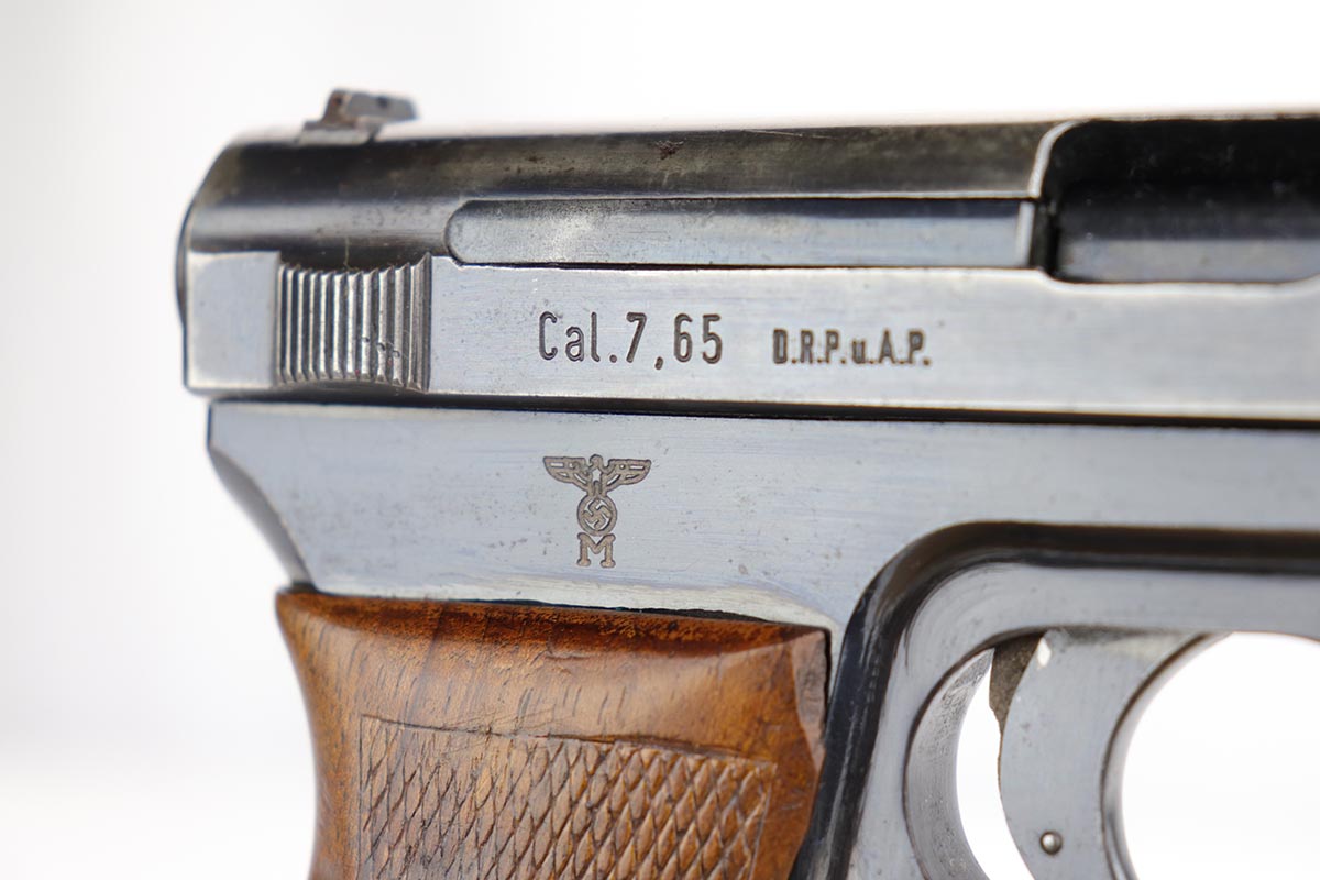 1/16/20 – This is a rare Mauser M1934 that was issued to the German Kriegsmarine. It’s a second variation pistol, one of only 3,000 produced with Navy eagle over M marking on right side of frame, and Ostmark property mark on front strap. This rare piece also comes with the original, matching magazine! The blue rates at about 80-85% with areas of thinning or patina on the front strap, trigger guard, both side rails and the top of the slide. Excellent bore. Crown over U proof and serial date this one to mid-late 1930s. Grip has a minor chip on right side in the upper corner.