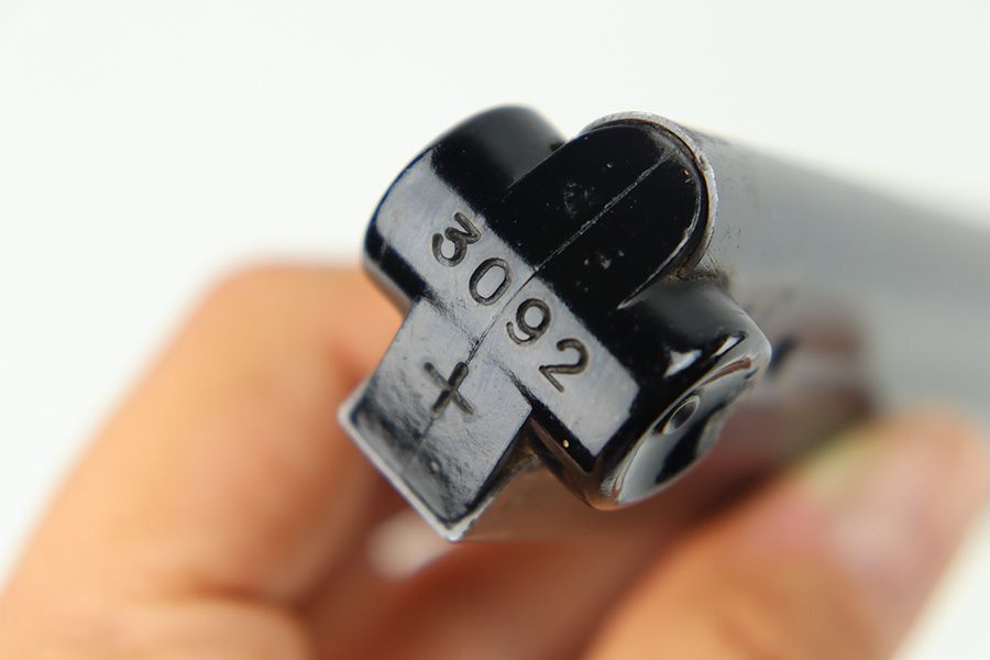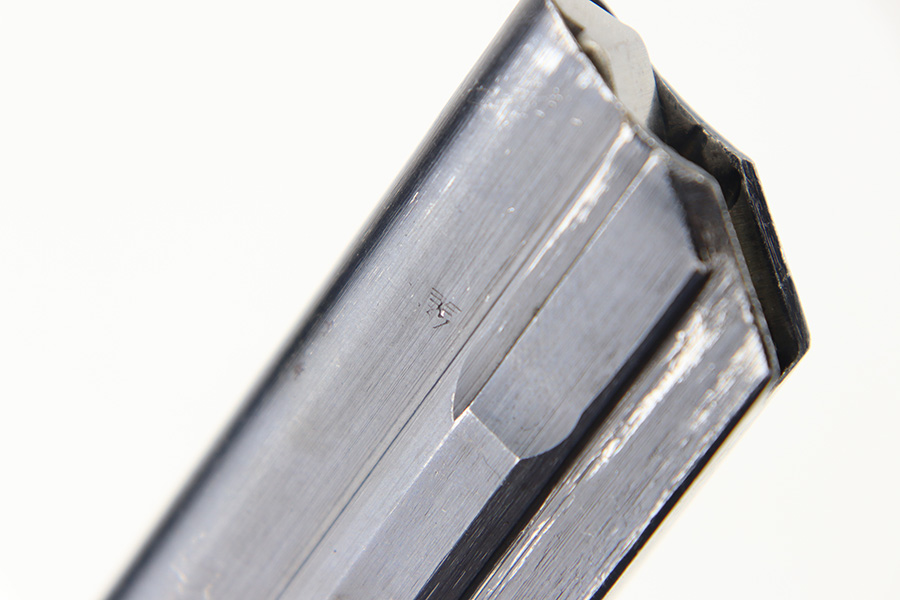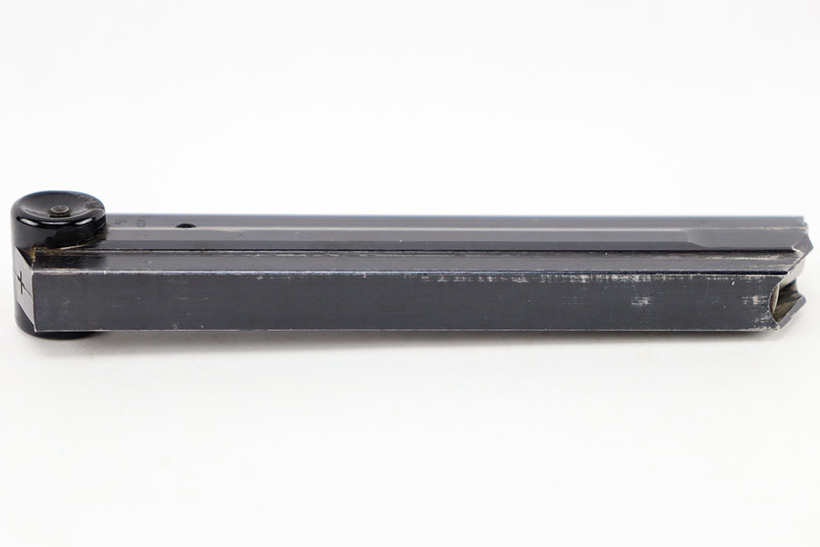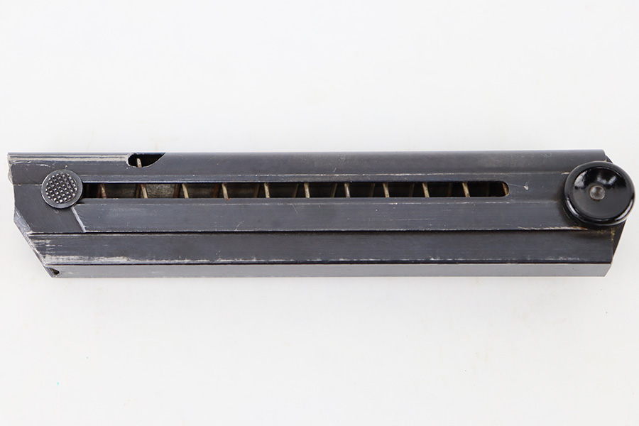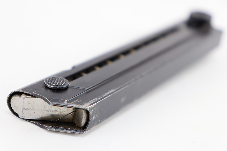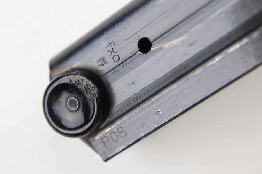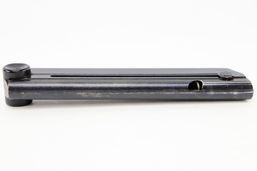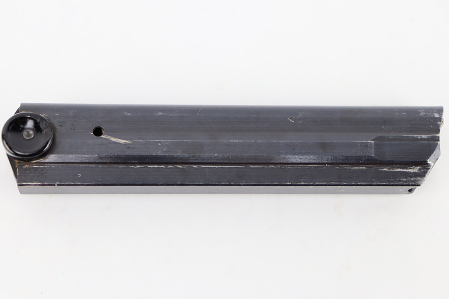 8/31/23 – This is an original, rare variation Luger magazine for a Ku Luger pistol. The magazine is similar to a Black Widow magazine, with a blued tube that’s stamped “fxo” and “P.08” with two eagle/37 proof stamps. The base is black bakelite as well, except a major difference being the base is serial numbered. This example is numbered 3092 with a plus sign. The font is large and correct. There is a small chip in the left “ear” of the base, but otherwise this magazine is excellent with a fully functional spring.