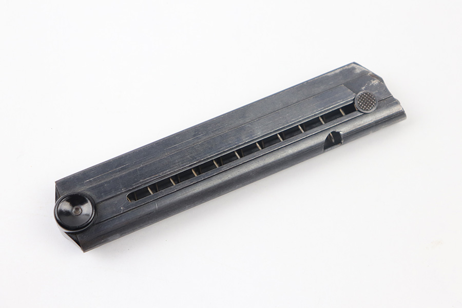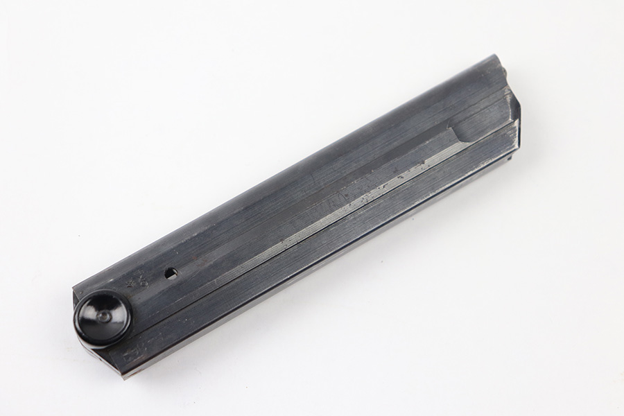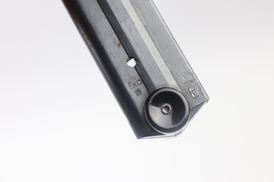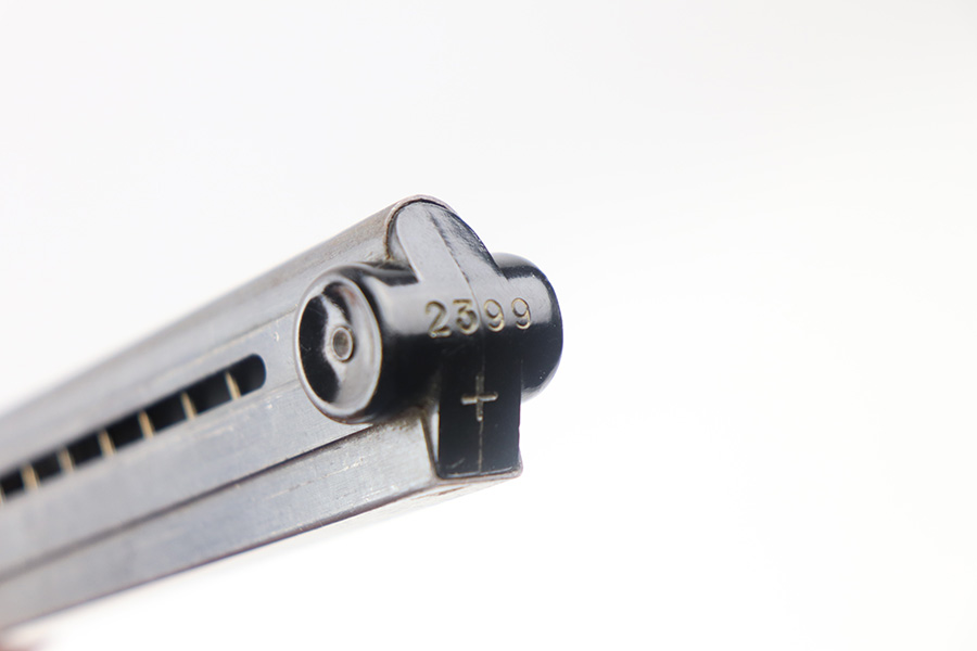 5/24/21 – This is a rare KU numbered Black Widow P.08 magazine. The black Bakelite base is typical of a black widow Luger, the serialized base indicates a KU Luger variation. The tube of this magazine is maker marked “FXO” and stamped with two Eagle 37 Waffen proofs. The black Bakelite base is serialized “2399”.