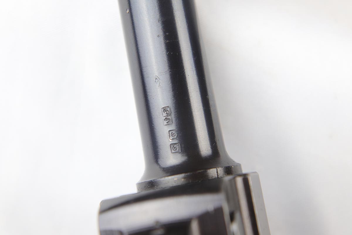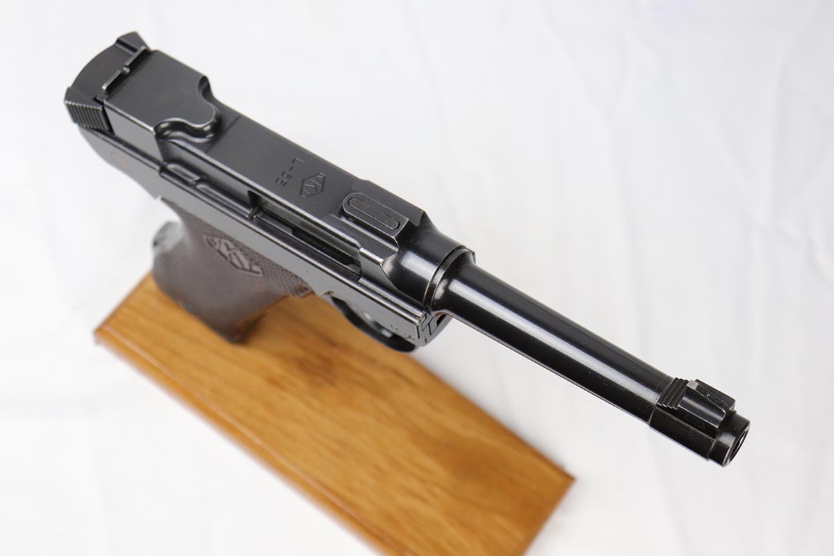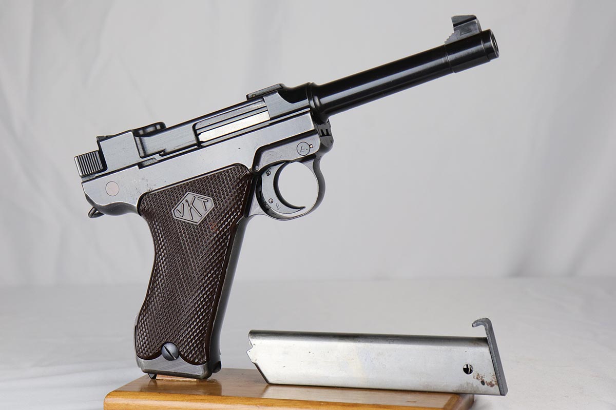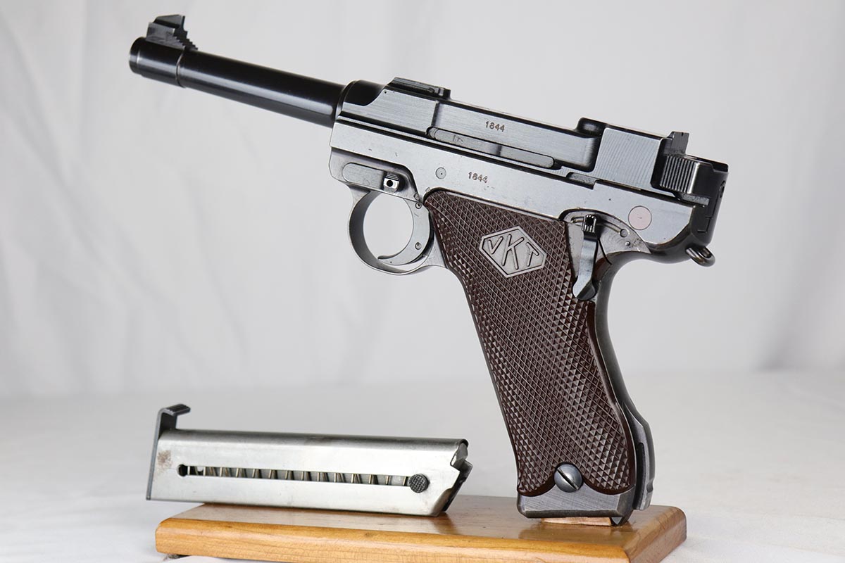 6/12/18 – This is, by far, the rarest of all Lahti pistols. The first variation Finnish military guns are practically non-existent in US, as only about 1500 were made before the Winter War and many were lost in battle with the surviving guns either captured by Russians or still remaining in Finnish Arsenals. This particular pistol is all original and matching, retaining 90-95% of its blue, with a beautiful profile but some thinning to the straps. These guns were different from the later variations in its contour of the top of the slide, in addition to having a shoulder stock lug. This gun is correctly proofed, with small parts properly serialized. These early guns were not SA marked, as that directive came after they were distributed to the troops. Excellent VKT marked grips without defects. Excellent bore. The L-35 Lahti was built like a tank with an accelerator installed to assist in returning the slide to battery in frigid winter weather. One of the rarest military guns to find in this country, it can be a centerpiece of any WWII collection.