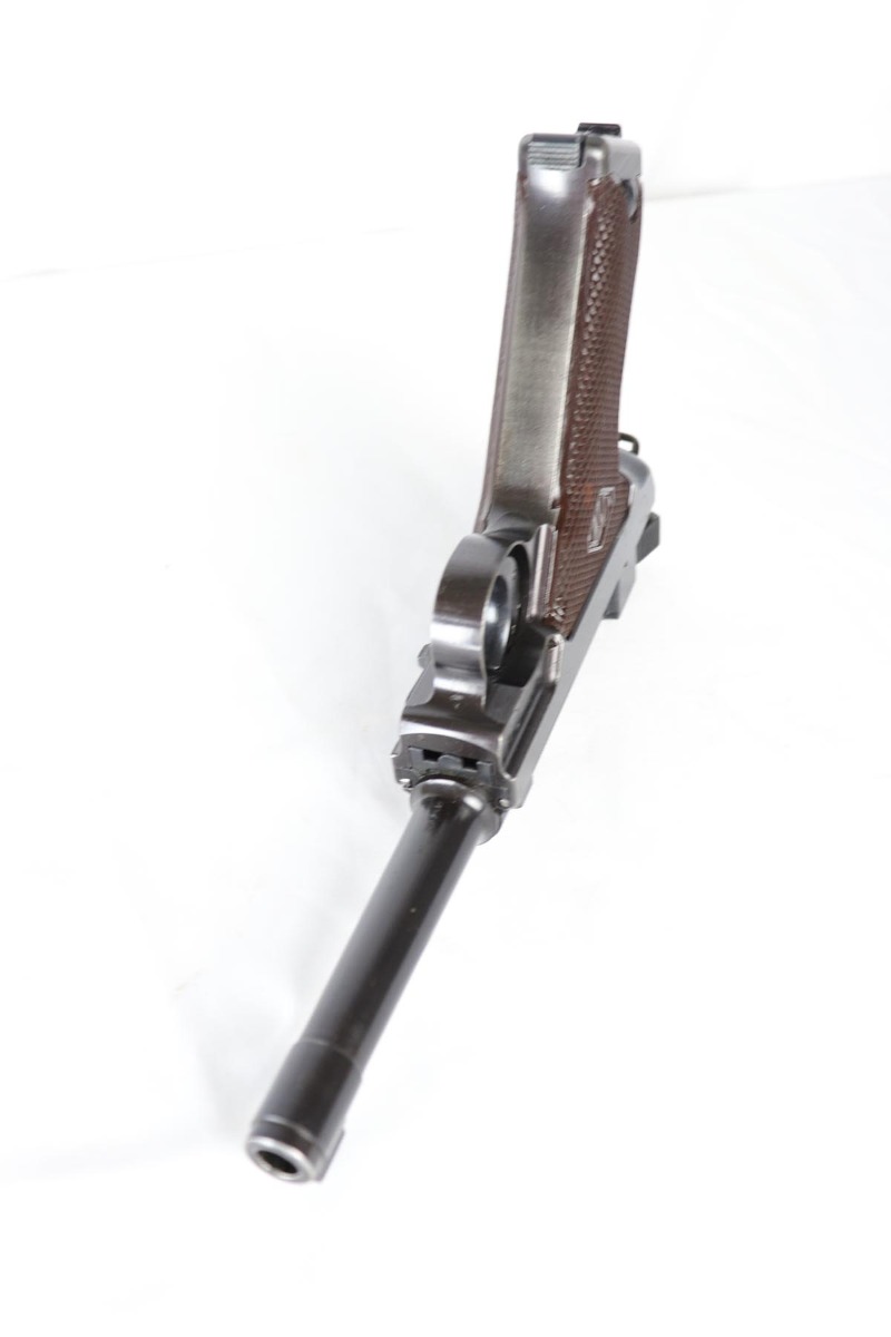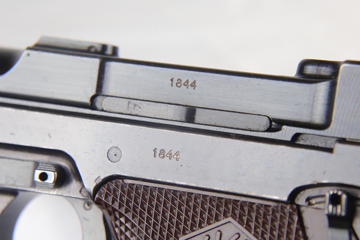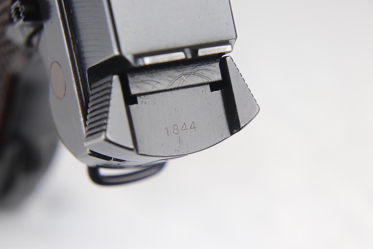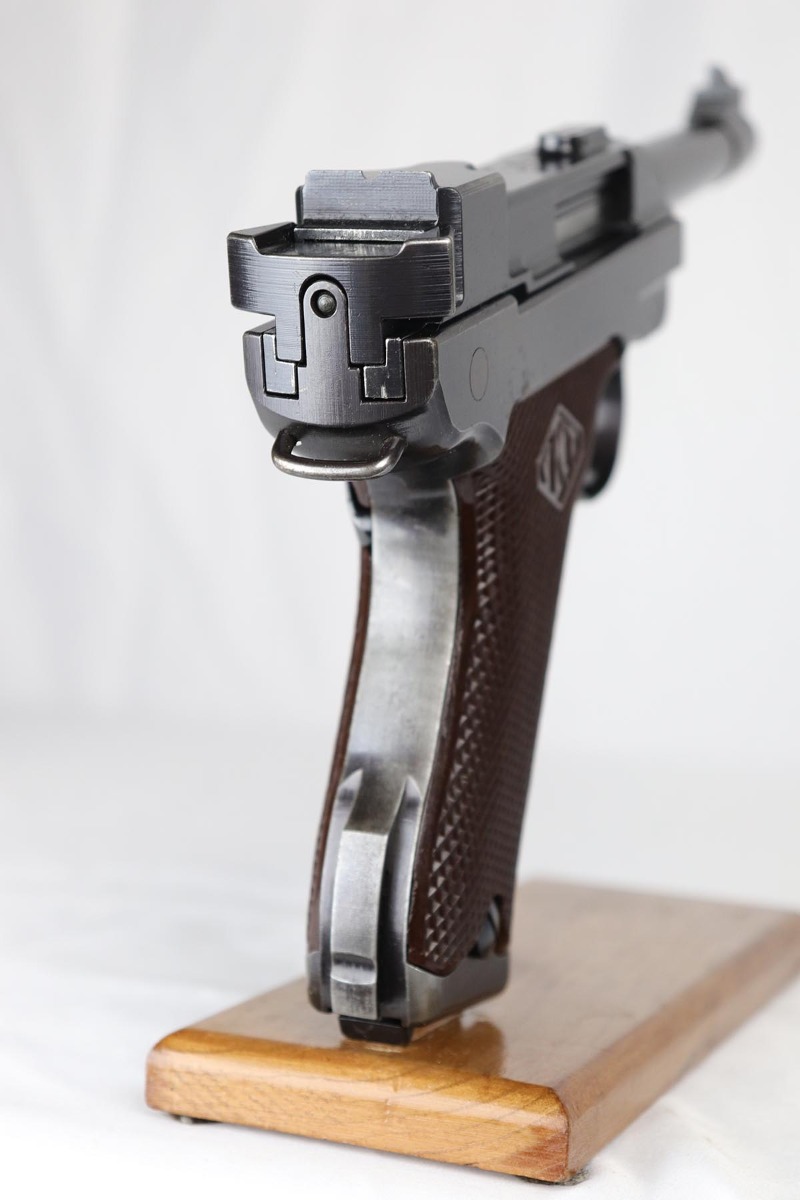 6/12/18 – This is, by far, the rarest of all Lahti pistols. The first variation Finnish military guns are practically non-existent in US, as only about 1500 were made before the Winter War and many were lost in battle with the surviving guns either captured by Russians or still remaining in Finnish Arsenals. This particular pistol is all original and matching, retaining 90-95% of its blue, with a beautiful profile but some thinning to the straps. These guns were different from the later variations in its contour of the top of the slide, in addition to having a shoulder stock lug. This gun is correctly proofed, with small parts properly serialized. These early guns were not SA marked, as that directive came after they were distributed to the troops. Excellent VKT marked grips without defects. Excellent bore. The L-35 Lahti was built like a tank with an accelerator installed to assist in returning the slide to battery in frigid winter weather. One of the rarest military guns to find in this country, it can be a centerpiece of any WWII collection.