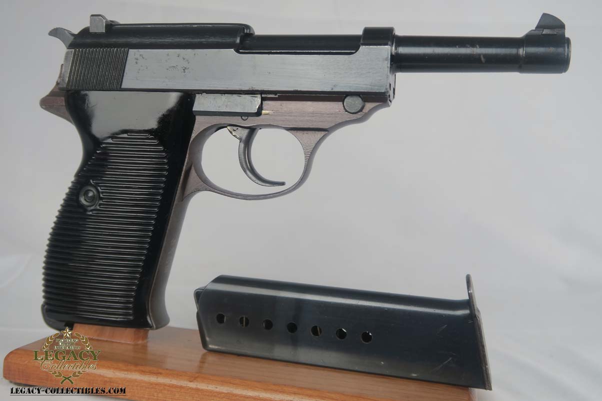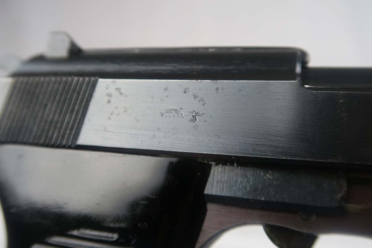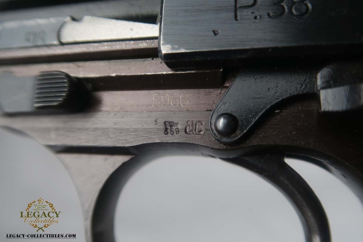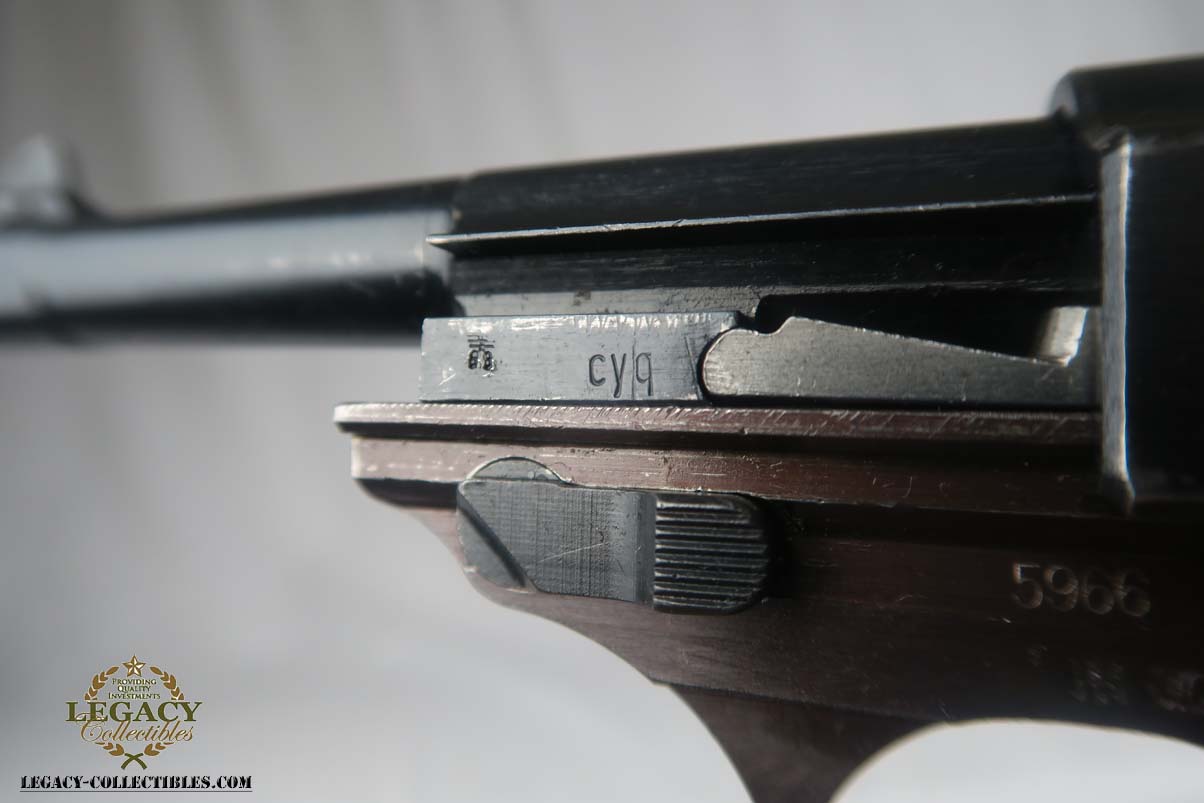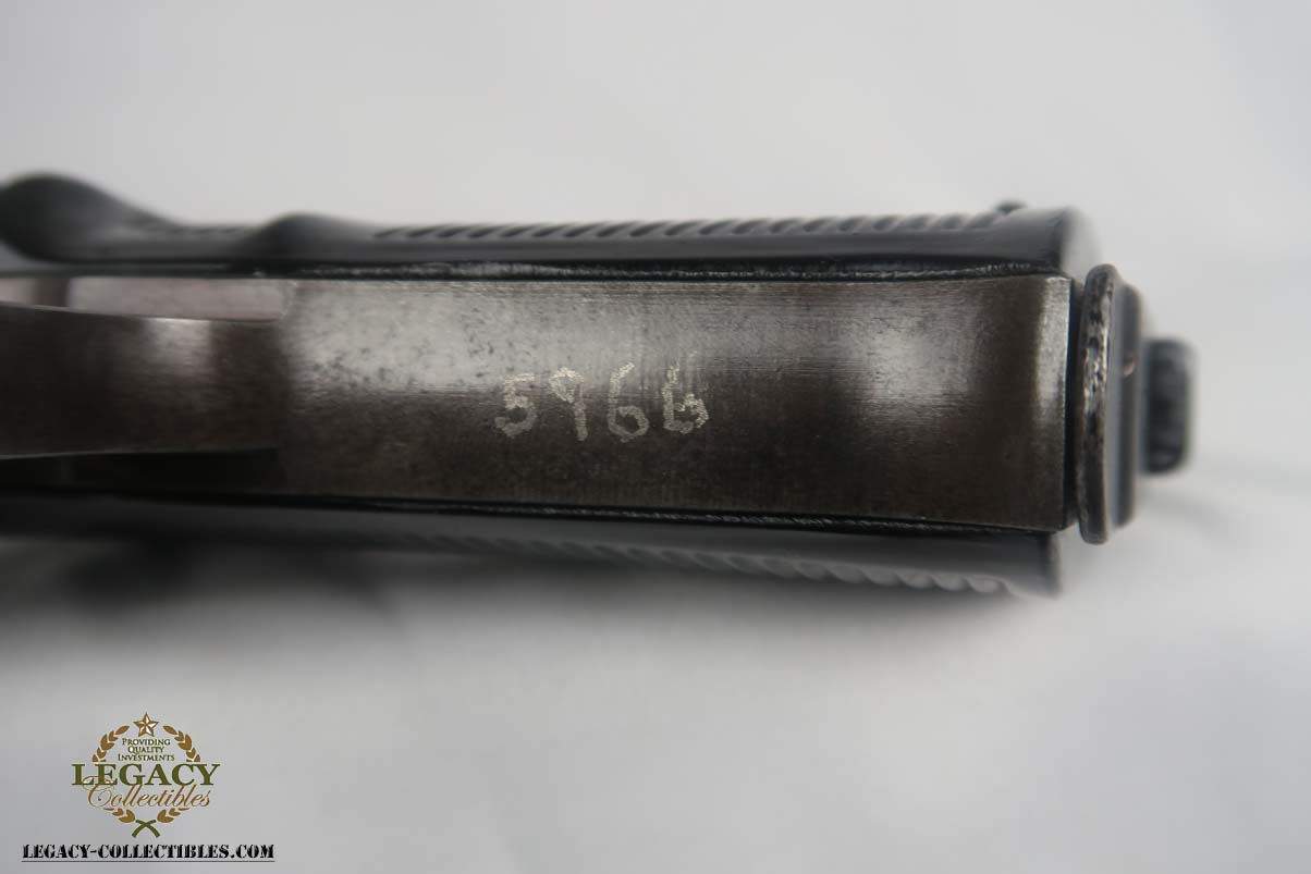 3/23/17 – Wonder how many of you have seen a gun like this?  These are extremely rare, “odd ball” guns, and I will share what I think is true but open to others who might know more. These are often referred to as AC frame guns, due to the AC on the frame.  I assume these were Walther “armorers replacement” frames that were used as field replacements for damaged guns. I also assume the Mauser factory had some in the factory to rebuild damaged guns.   At the end of the war, these “parts” were put together to make guns.  This gun has no “original” serial numbers. The frame, slide, barrel and locking block are not numbered.  However, there is a newer electro- penciled number on the parts most likely done by European or American authorities.   So for example:  if a soldier brought it home and decided to register it at some point (to be legal) many states would require a serial be put on it.  I would guess that is what happened here. The grips are the typical late war Mauser style.   The barrel is CYQ and Eagle 88 marked.   The slide is WaA359 marked and the frame is 359 marked.   YES, this gun hits the TRIFECTA!  The magazine is Eagle 135 proofed and the magazine also has some dings on the spine.  The bore is MIRROR.  When will you find one like this again?