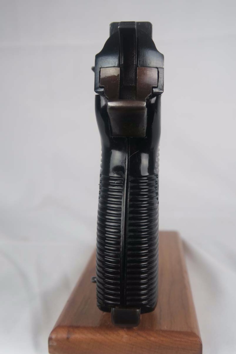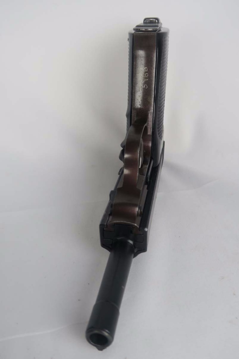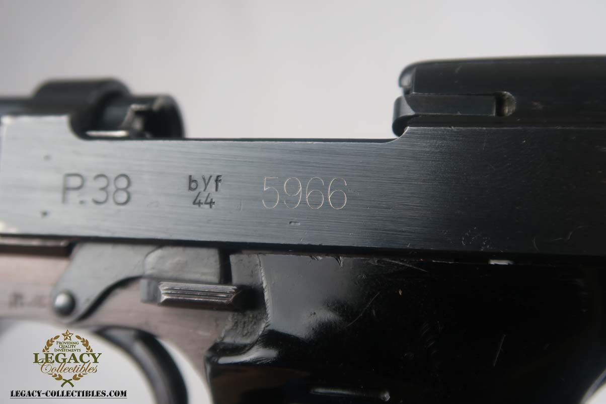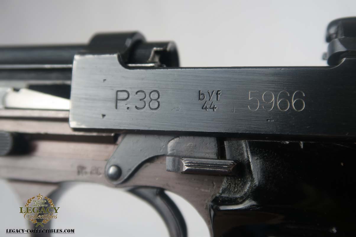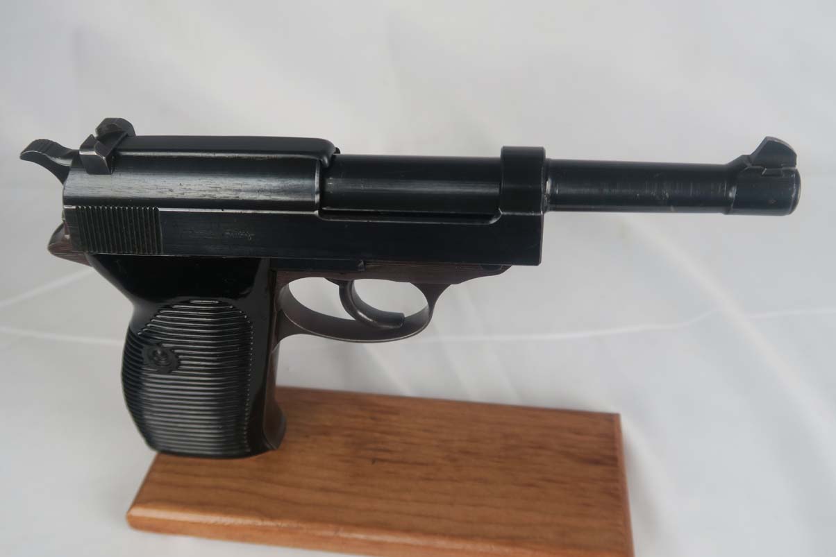 3/23/17 – Wonder how many of you have seen a gun like this?  These are extremely rare, “odd ball” guns, and I will share what I think is true but open to others who might know more. These are often referred to as AC frame guns, due to the AC on the frame.  I assume these were Walther “armorers replacement” frames that were used as field replacements for damaged guns. I also assume the Mauser factory had some in the factory to rebuild damaged guns.   At the end of the war, these “parts” were put together to make guns.  This gun has no “original” serial numbers. The frame, slide, barrel and locking block are not numbered.  However, there is a newer electro- penciled number on the parts most likely done by European or American authorities.   So for example:  if a soldier brought it home and decided to register it at some point (to be legal) many states would require a serial be put on it.  I would guess that is what happened here. The grips are the typical late war Mauser style.   The barrel is CYQ and Eagle 88 marked.   The slide is WaA359 marked and the frame is 359 marked.   YES, this gun hits the TRIFECTA!  The magazine is Eagle 135 proofed and the magazine also has some dings on the spine.  The bore is MIRROR.  When will you find one like this again?