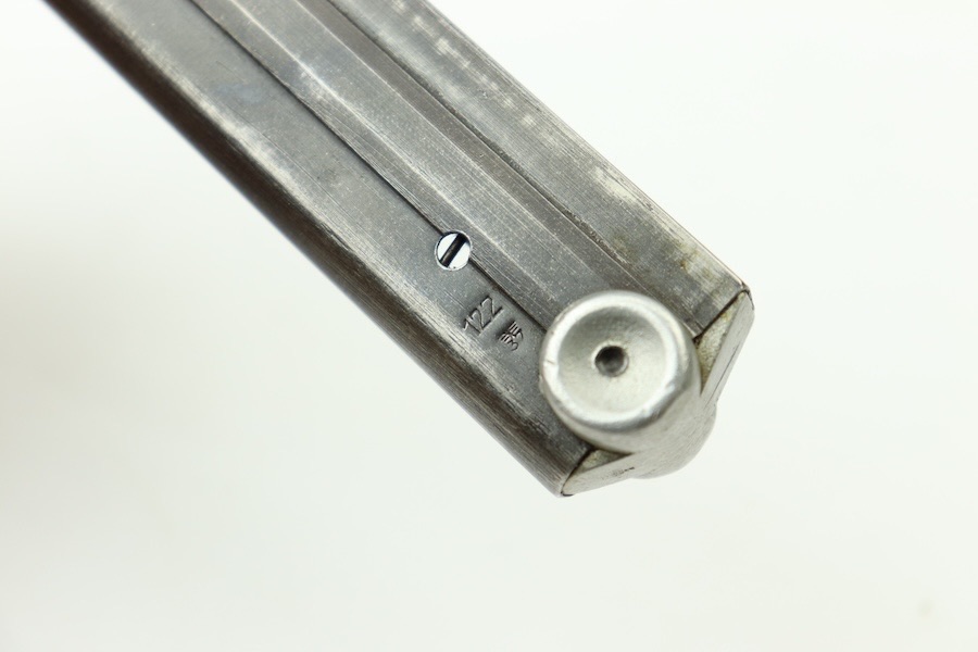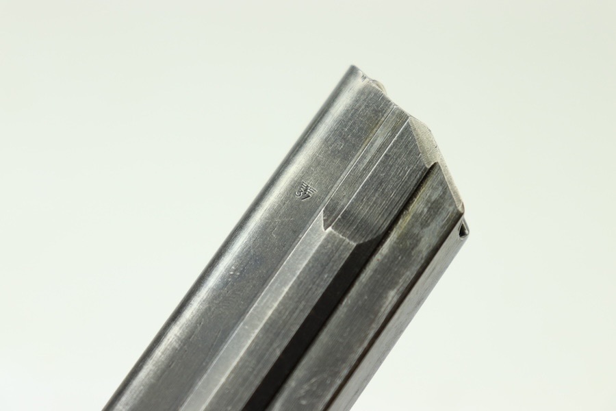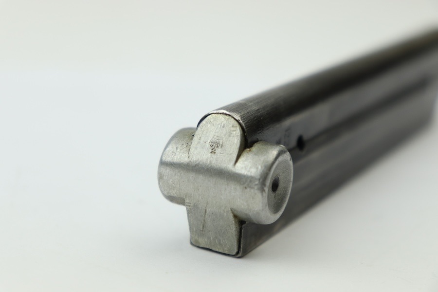 11/9/23 – This is a rare, late Luftwaffe Luger Magazine with a blued tube. The body retains roughly 70% of its original bluing finish, with the majority of the finish loss on the spine and belly. Spring is strong, smooth and functional. Stamped in the lower portion of the body on the left side is a code “122” with an eagle 37. The same Eagle 37 stamp is on the top portion of the body on the left side. The aluminum base plate is stamped “Eagle L2”. There is no serial number, but it does not look ground. So this is likely an armorers replacement.