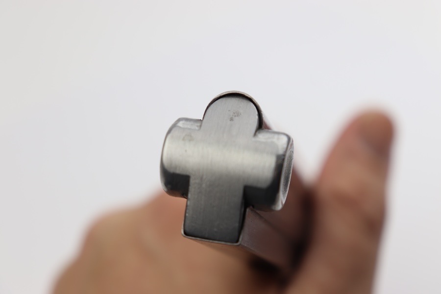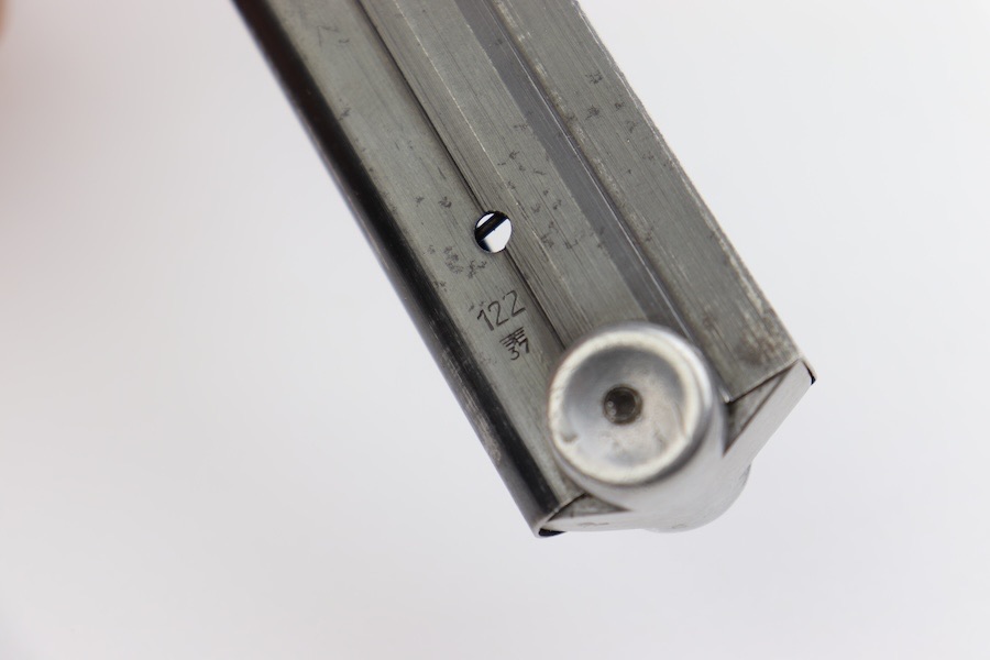 1/9/24 – This is a rare, late Luftwaffe Krieghoff Luger Magazine with a blued tube. The body retains roughly 80 to 85% of its original bluing finish, with the majority of the finish loss on the spine and belly. Spring is strong, smooth and functional. Stamped in the lower portion of the body on the left side is a code “122” with an eagle 37. The same Eagle 37 stamp is on the top portion of the body on the left side. The aluminum base plate is stamped with an eagle. There is no serial number, but it does not look ground. So this is likely an armorers replacement.