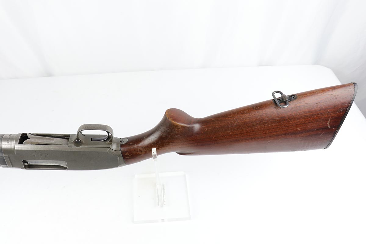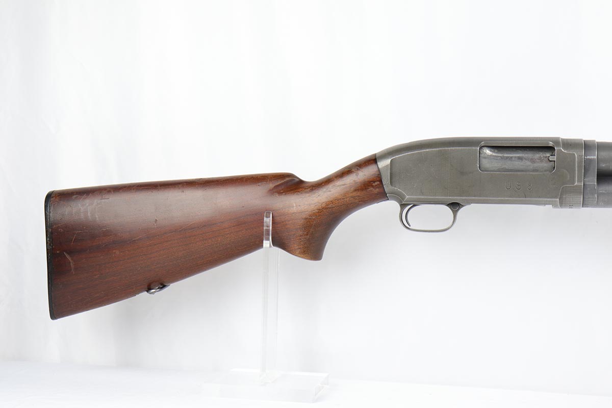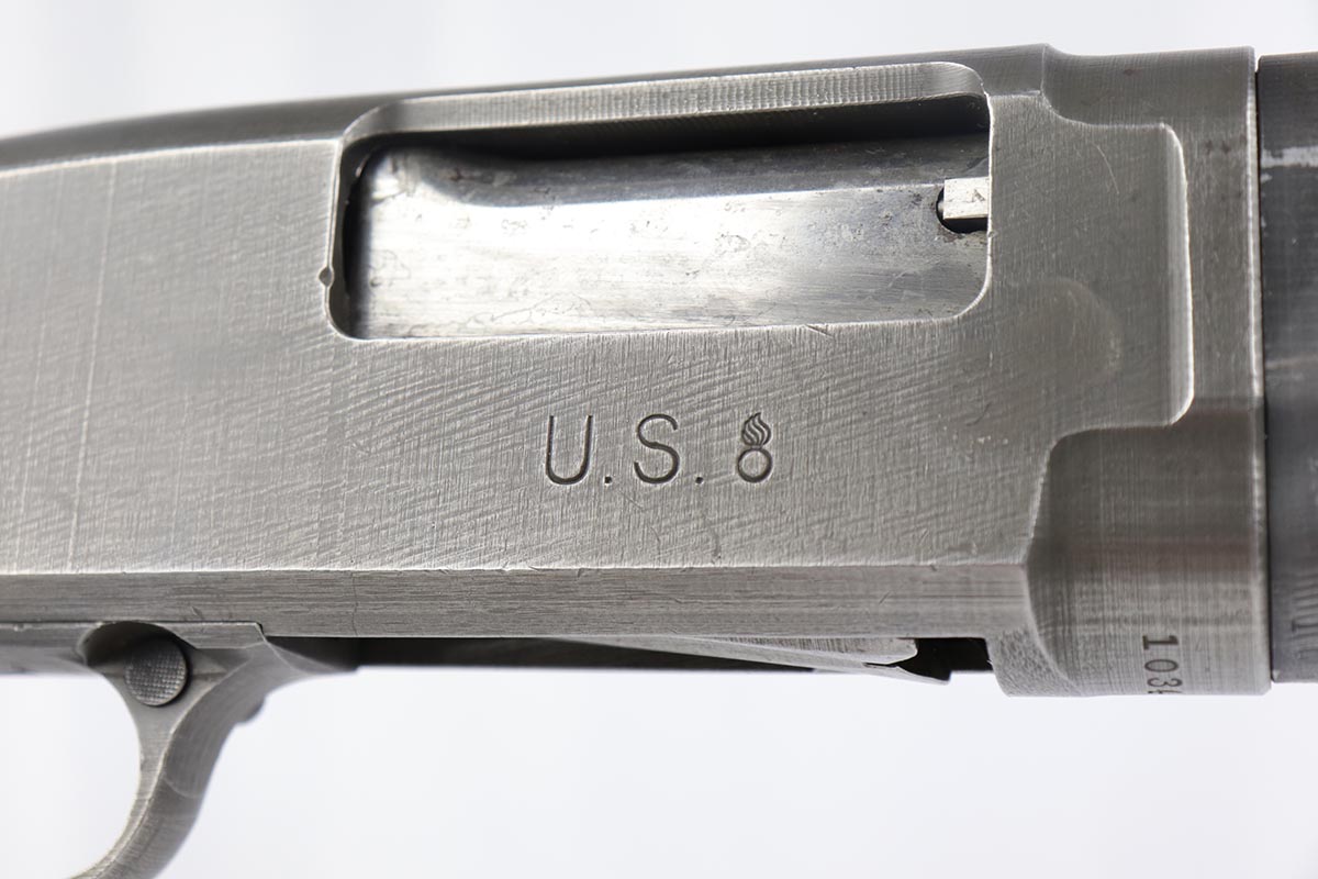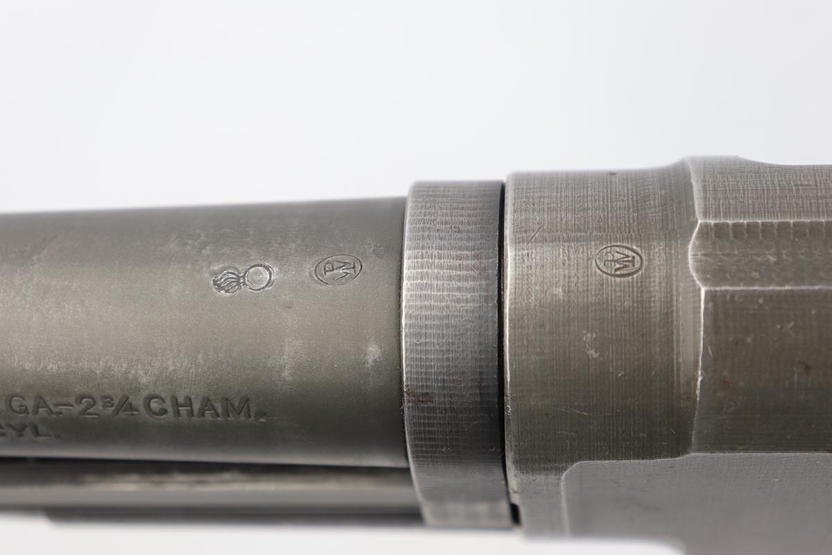 2/28/19 – This is the most sought after and extremely desirable variation of US military Model 12 shotgun – a late war, factory parkerized, trench gun. Very few of these guns were made in 1944-1945 and all cluster around the same serial range of 1031xxx to 1035xxx serial range and this one falls smack in the middle. These guns were very different from the early and mid war Winchester trench shotguns that were made from the existing stock of commercial shotguns and sported a high polish commercial blue finish. In the end of the war, Winchester decided to forego the aesthetics in the name of expediency, and produced guns that had visible file and machine marks, a thin parkerized finish, and appeared to be cobbled up from any parts Winchester had on hand – as a result all of these guns had a part or two that were actually blued. This particular example has all of the above characteristics, including a blued magazine tube, a thinly blued barrel extension and a plain channel on top of the receiver. The remainder of the parts are factory parkerized. All the cartouches are present in all the right places and are original. The wood and metal are in great shape but show some wear that you would expect from a late war gun. All in all, a great example of a scarce trench shotgun with US property markings and WWII history. One can search for many years before finding another one like it.