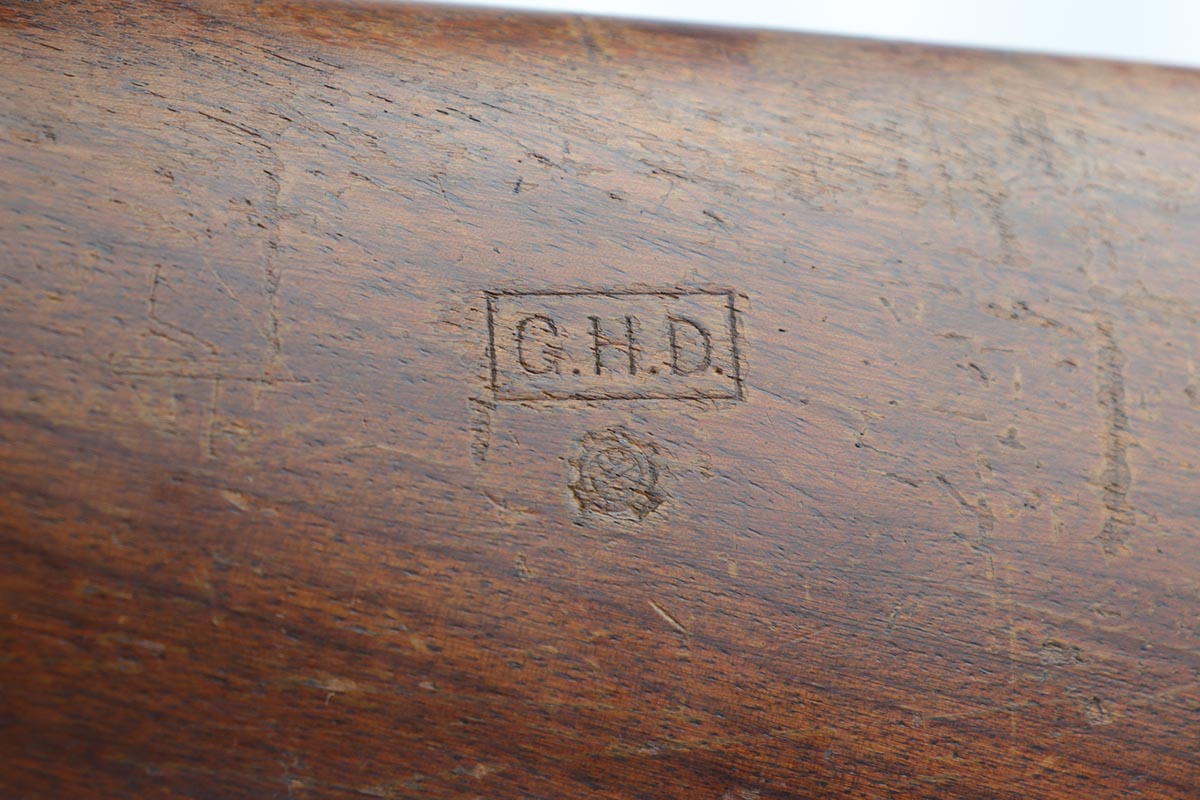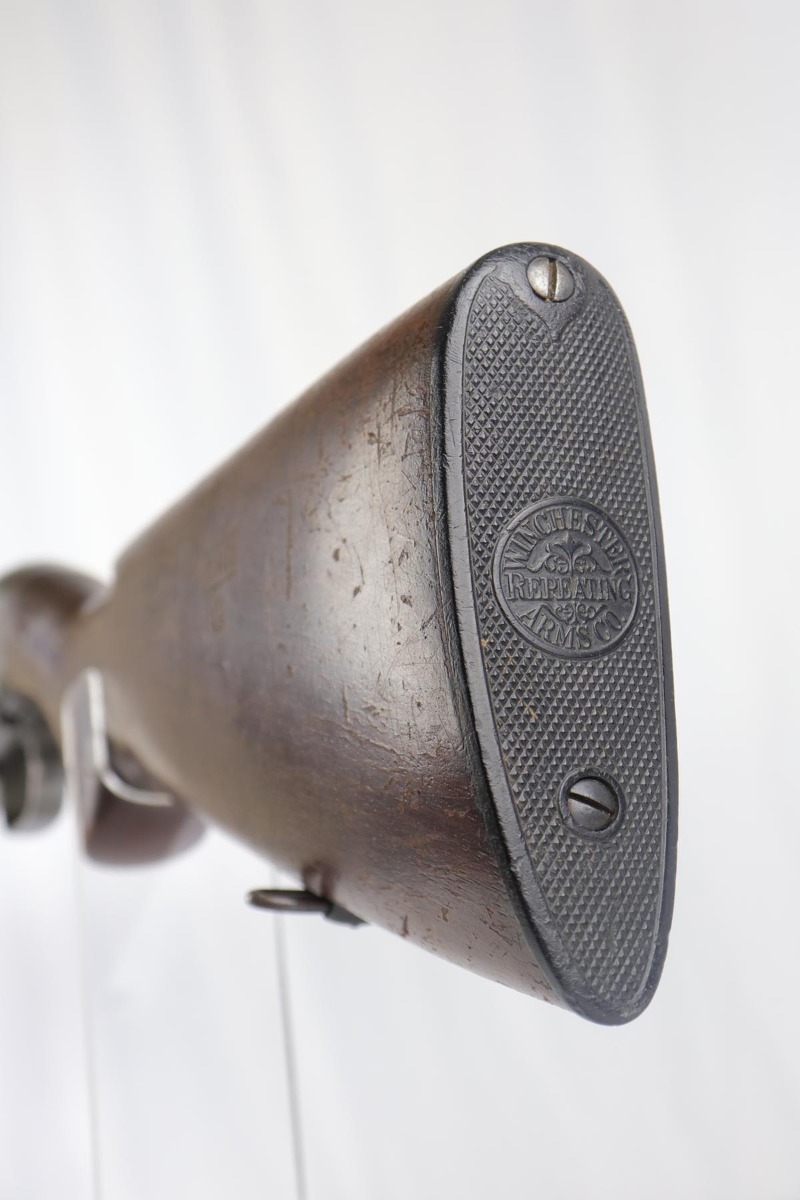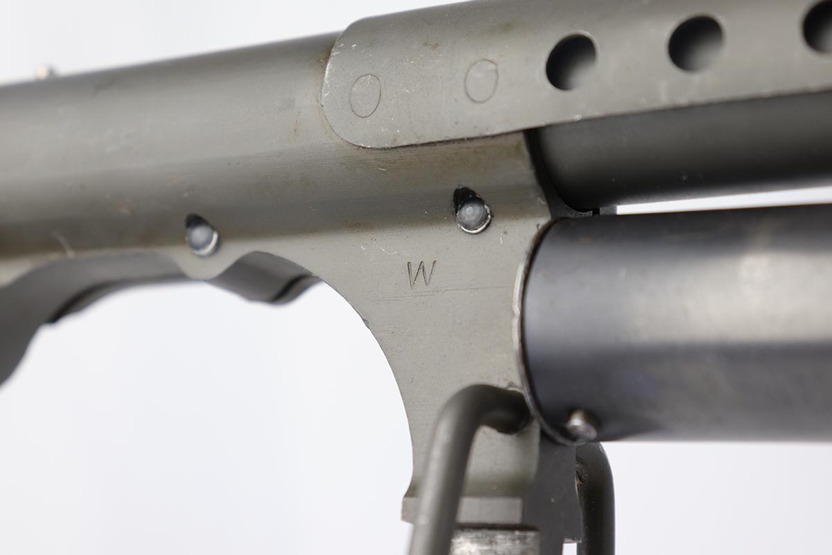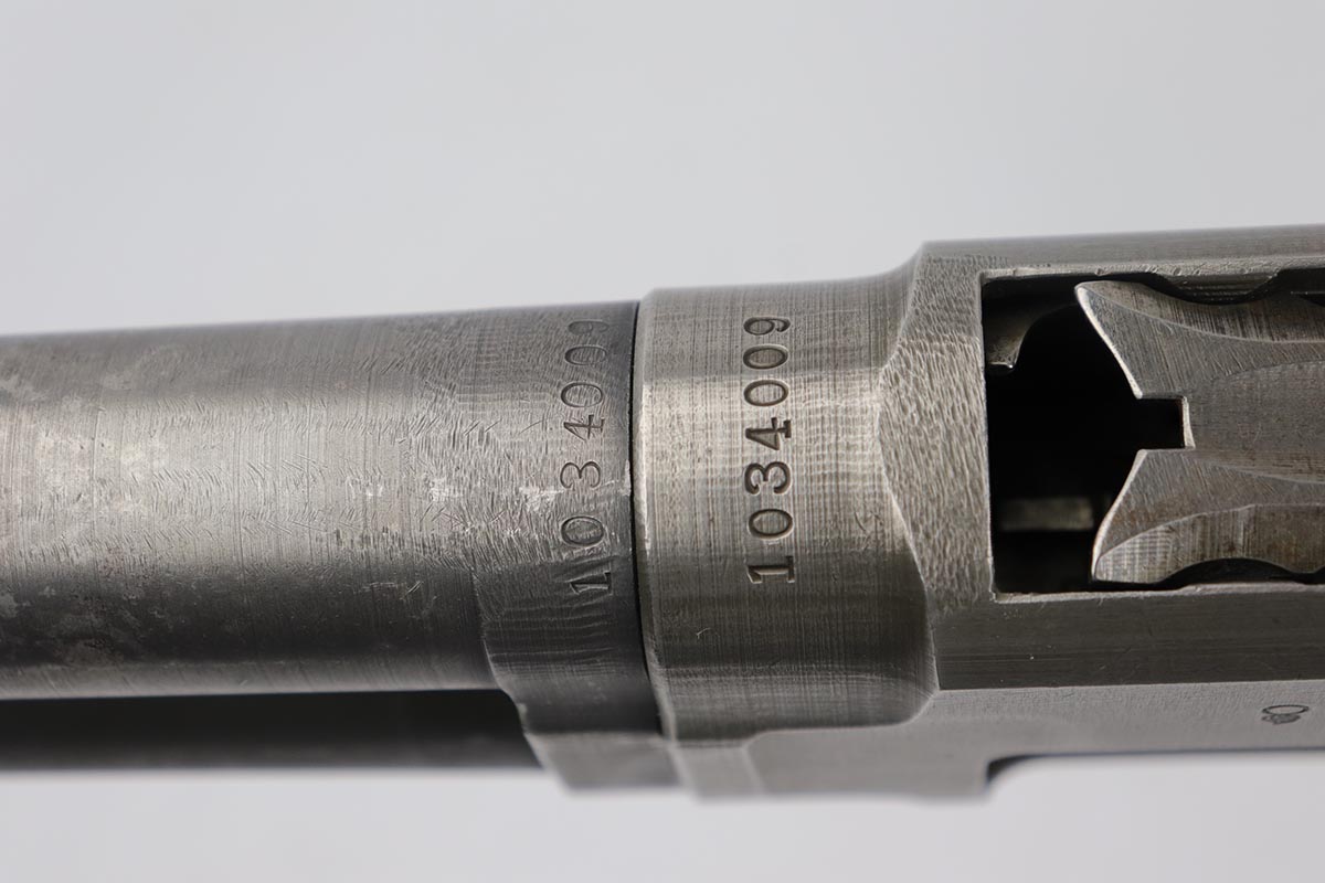 2/28/19 – This is the most sought after and extremely desirable variation of US military Model 12 shotgun – a late war, factory parkerized, trench gun. Very few of these guns were made in 1944-1945 and all cluster around the same serial range of 1031xxx to 1035xxx serial range and this one falls smack in the middle. These guns were very different from the early and mid war Winchester trench shotguns that were made from the existing stock of commercial shotguns and sported a high polish commercial blue finish. In the end of the war, Winchester decided to forego the aesthetics in the name of expediency, and produced guns that had visible file and machine marks, a thin parkerized finish, and appeared to be cobbled up from any parts Winchester had on hand – as a result all of these guns had a part or two that were actually blued. This particular example has all of the above characteristics, including a blued magazine tube, a thinly blued barrel extension and a plain channel on top of the receiver. The remainder of the parts are factory parkerized. All the cartouches are present in all the right places and are original. The wood and metal are in great shape but show some wear that you would expect from a late war gun. All in all, a great example of a scarce trench shotgun with US property markings and WWII history. One can search for many years before finding another one like it.