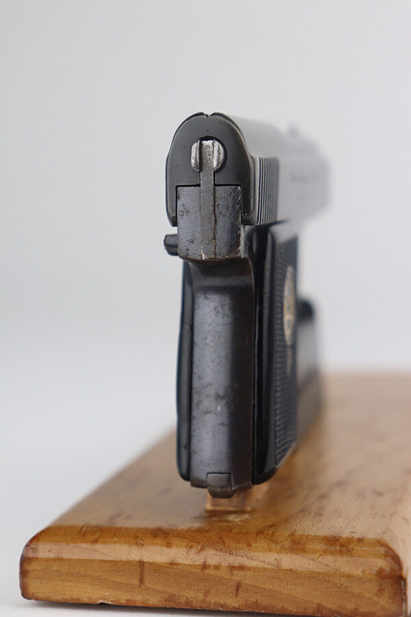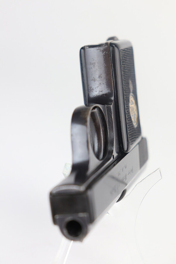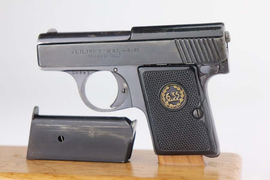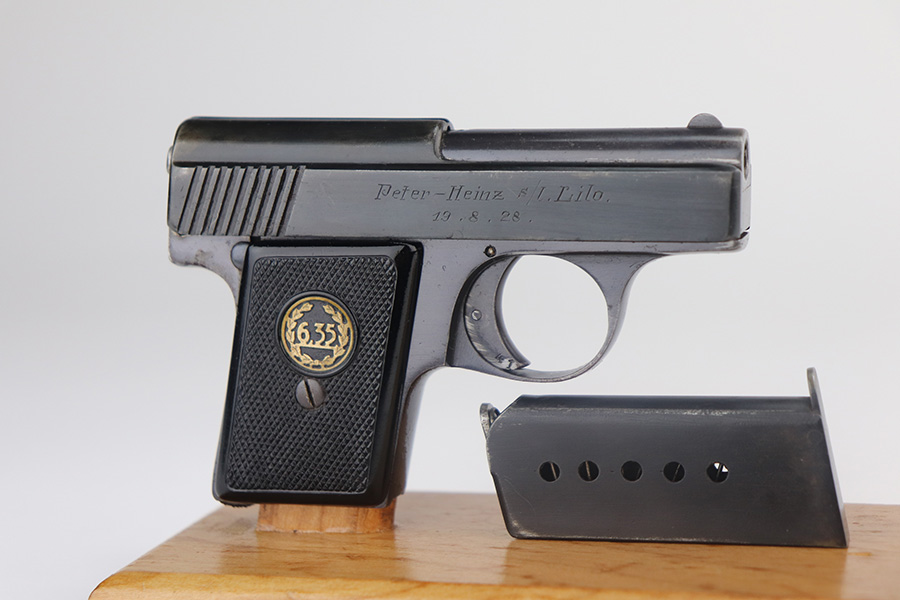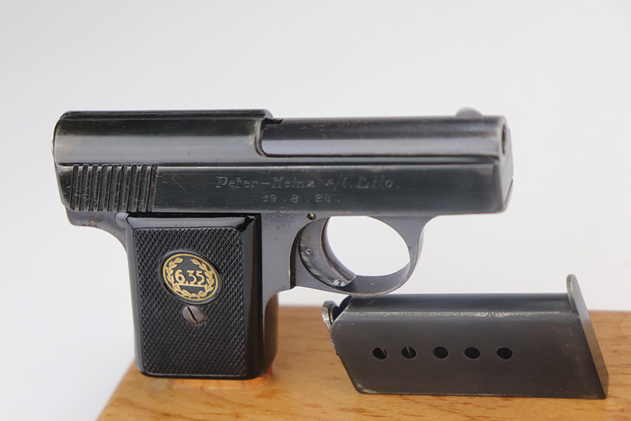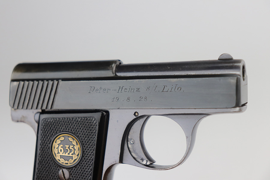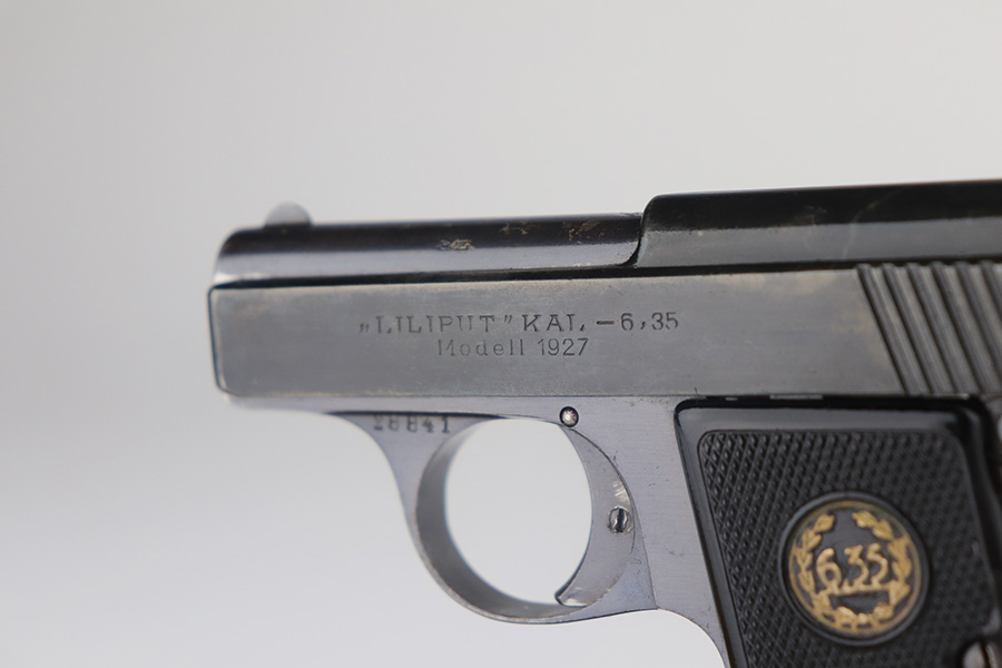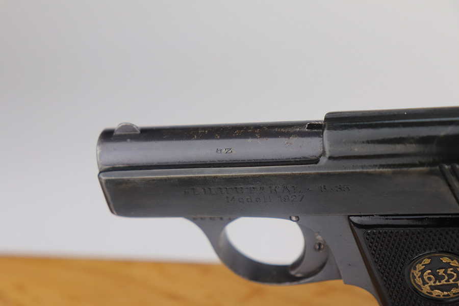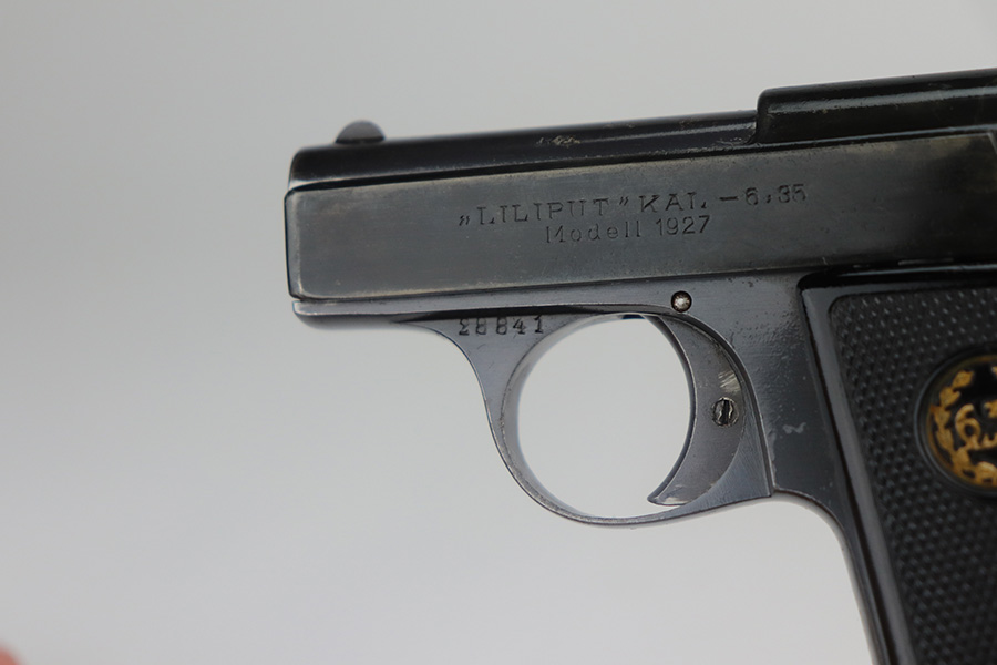 5/20/21 – This is an excellent example of a rare Liliput Model 1927 pistol, chambered in 6.35mm. It is matching and has the proper “Crown N” proofs. This one was presented to someone as a gift in 1928. There is an engraving on the right side of the slide “Peter-Heinz S/L Lilo. 19.8.28”. The gun has retained about 95% of its bluing. There is minor wear on the high edges of the slide, spotty wear on the barrel, and spotty oxidation throughout, especially on the straps. Comes with nice original grips – small crack in the left panel. Comes with a proper magazine. The bore has strong rifling with a few very small pits near the muzzle.