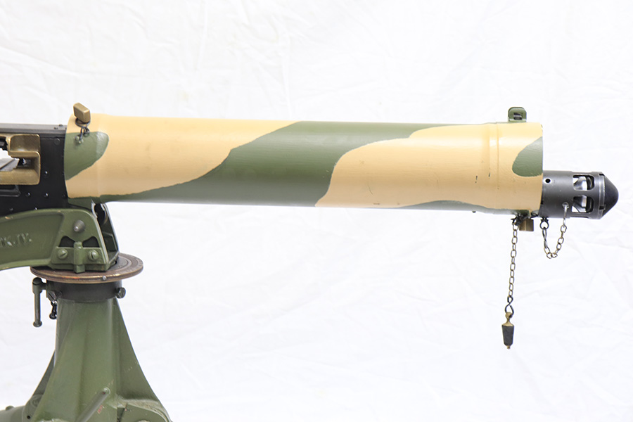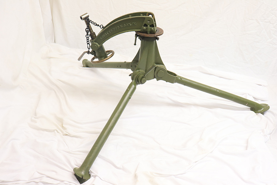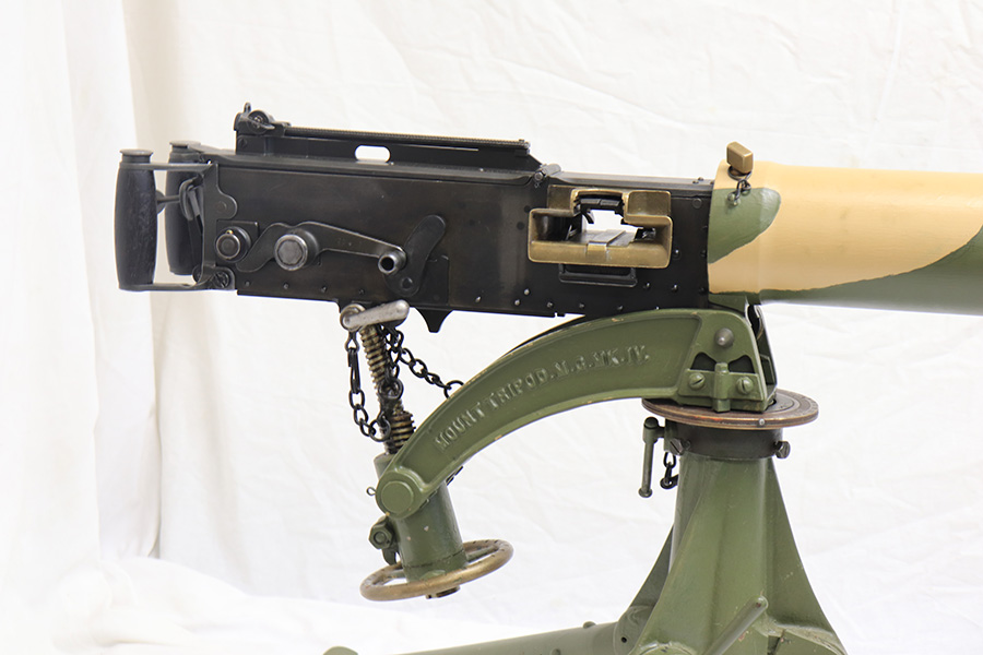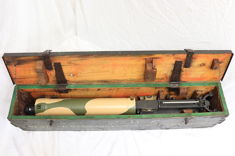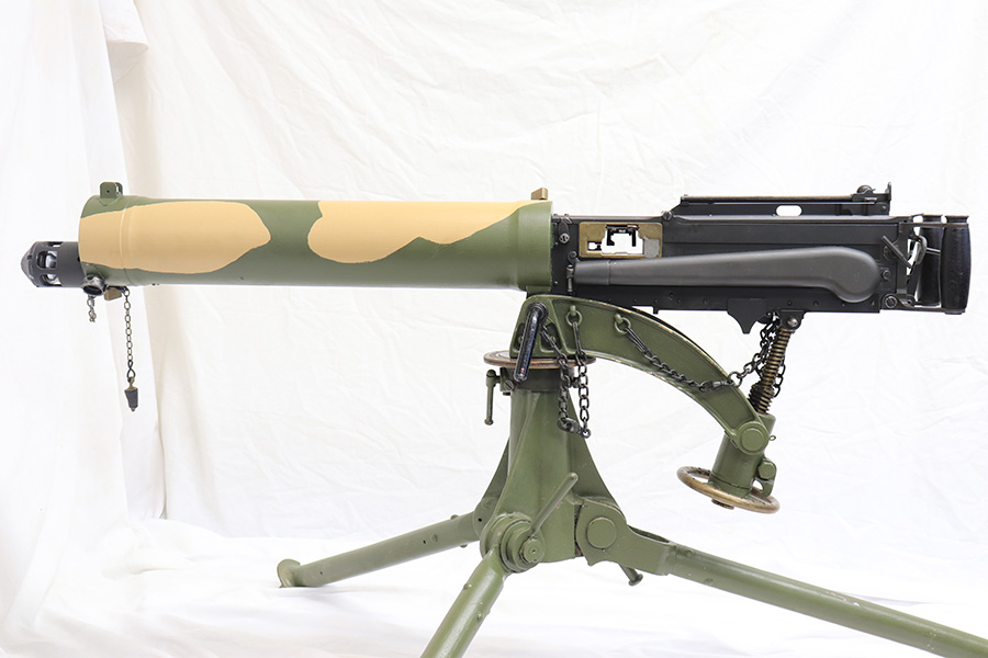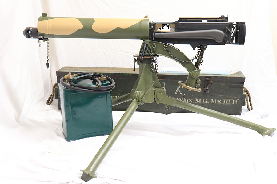 4/13/22 – This is a rare and super cool Lithgow Vickers Mark I that was rebuilt in semi-automatic. This Vickers resembles their full-automatic counterparts but is built to a semi-automatic specification approved by the Bureau of Alcohol, Tobacco and Firearms (BATF) that prevents installing full-auto fire control parts. The listing comes with the BATF approval document. The semi-auto Mark I Vickers is in .303 cal and was assembled using a Lithgow parts kit in 2006. The conversion of the recoil plates, lock, and sear were done by one of the better known early Vickers builders, Lonnie Ingram. Being an early build, the dimensions of the installed right side plate are not as true as the current commercial available semi-auto right side plates. Therefore, another semi-automatic right side plate, cam, and denial island made by Midwest Metal Creations of Lisbon, Iowa is included. The serial number on this additional right side plate matches the Vickers trunnion. The tripod’s legs and socket are British and dated 1942. The tripod socket is steel. The cross head is marked RT (Randwick Tramways, Sydney) and is dated 1942. Likewise, included are a broad arrow marked water can, water hose, and transit chest. The rifle is in excellent condition and our consignor has fired it himself without issue. FFL required.