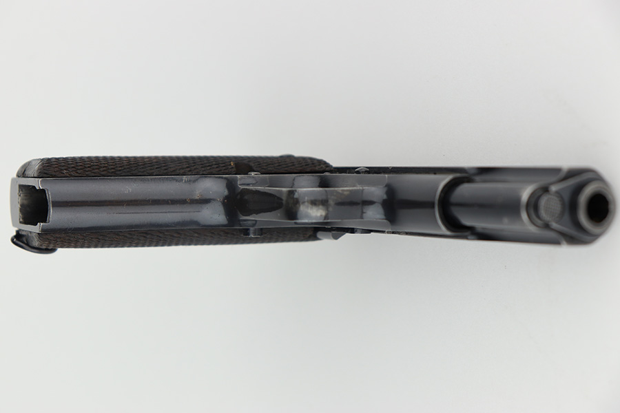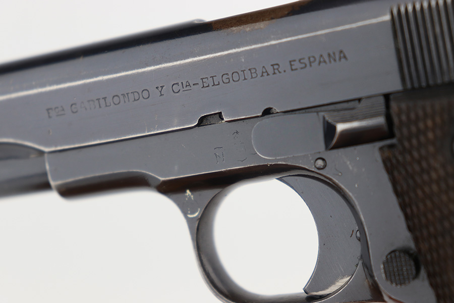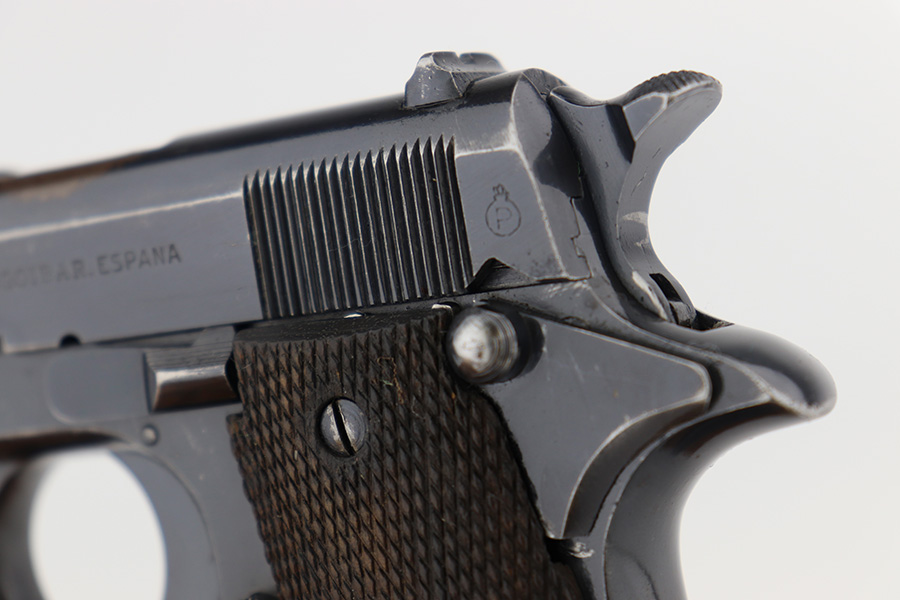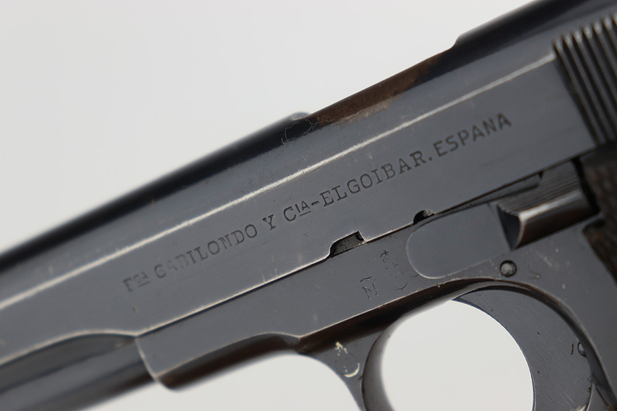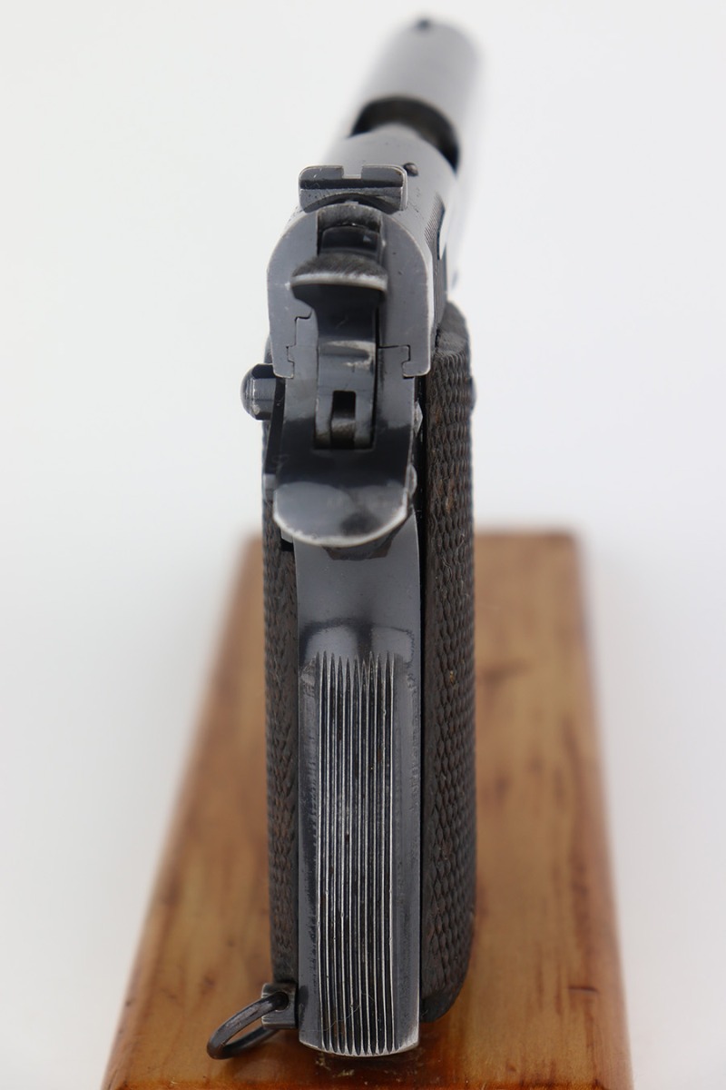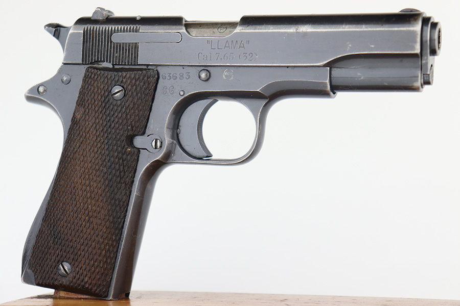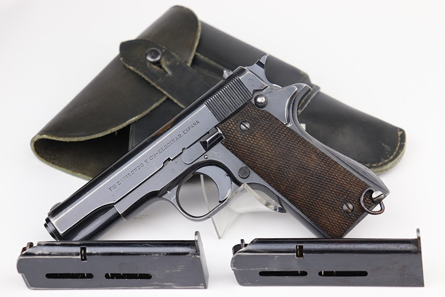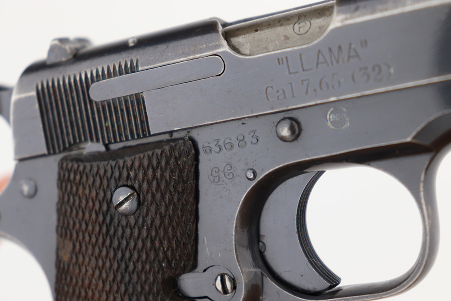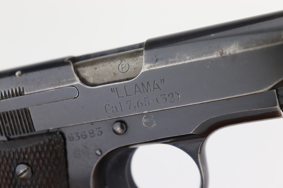 12/1/22 – This is a rare Spanish Llama Model 1 that was imported by Geco into Germany in 1943. Whittington’s book on German pistol estimates only about 1,000 were sold in Germany! What makes this pistol particularly interesting is the “Geco” trademark stamped on the right side of the frame. This indicates that the pistol was marketed in Germany by Gustav Genschow & Co., Hamburg. Like most commercial pistols available in Germany during the war, this pistol would have been sold to a member of the German armed forces or one of the few “approved” German civilians or Nazi Party members. The GC proof on the right side indicates it was originally made for the Spanish Civil Guard, or ‘Guardia Civil’. The pistol is all original with 93% blue remaining. The majority of the wear is around the muzzle and around the high edges of the slide. Some very light spotty wear on the front strap and underside of the trigger. One noticeable spot of discoloration around the ejection port. Fitted with very nice wood grips. The gun comes as a rig with a WW2-era green leather Beretta holster (fits the gun well) and two proper magazines. Minty bore.