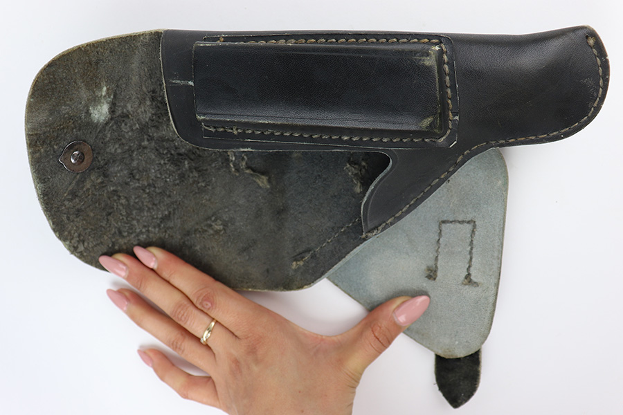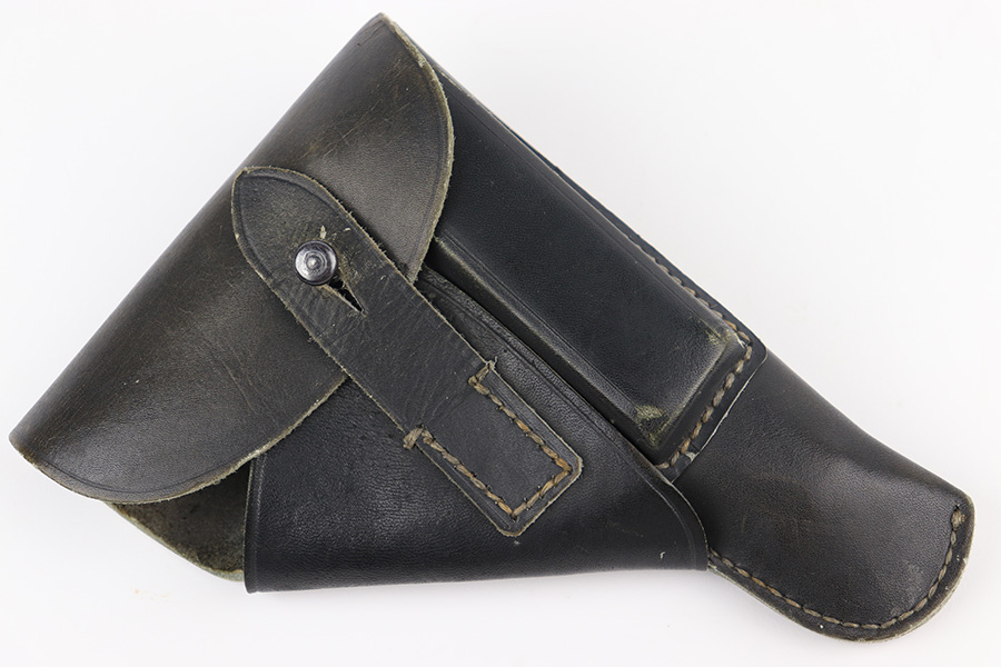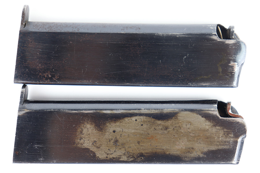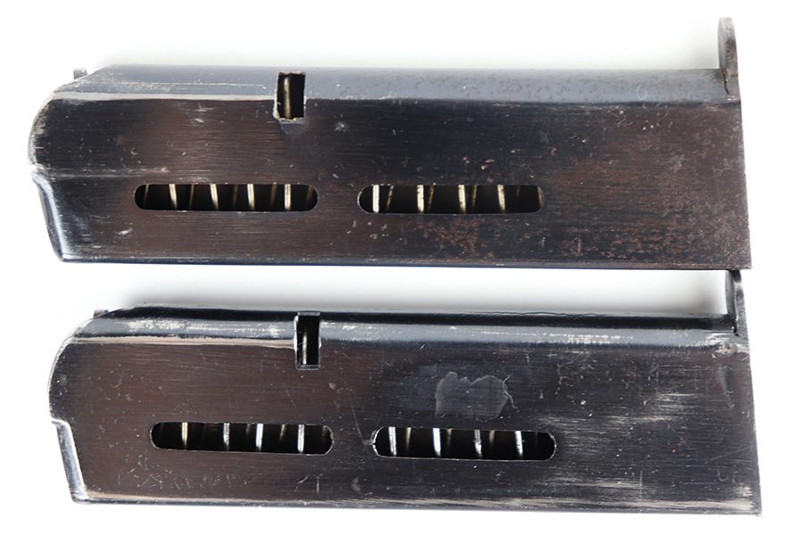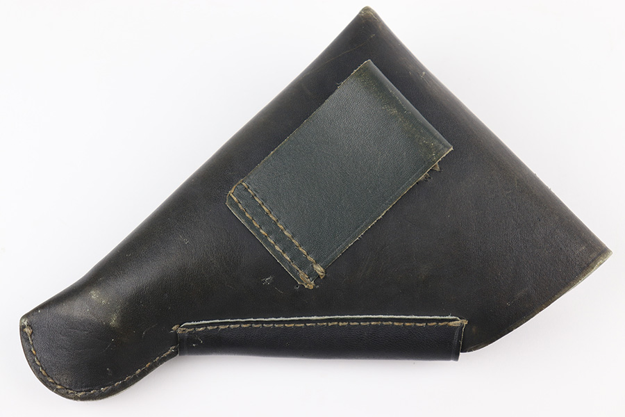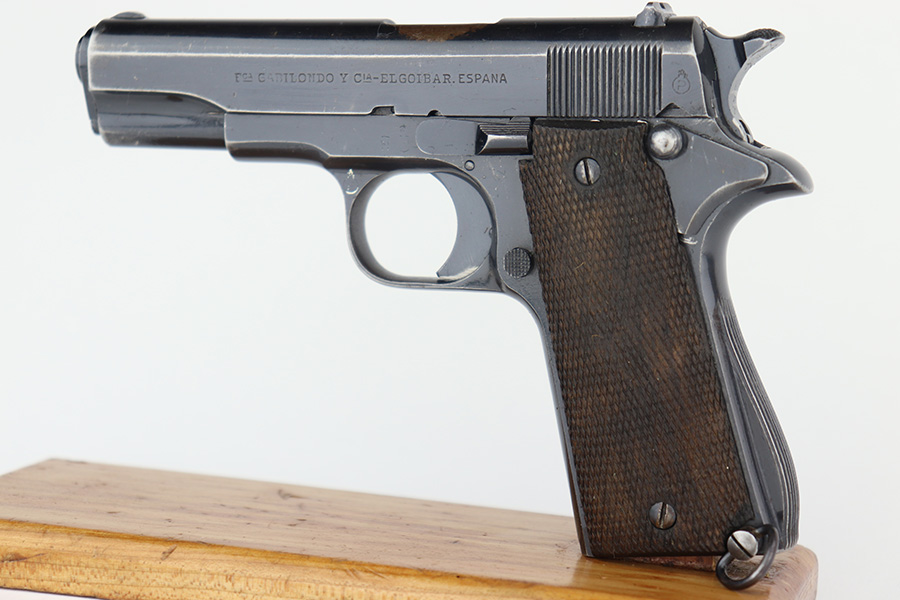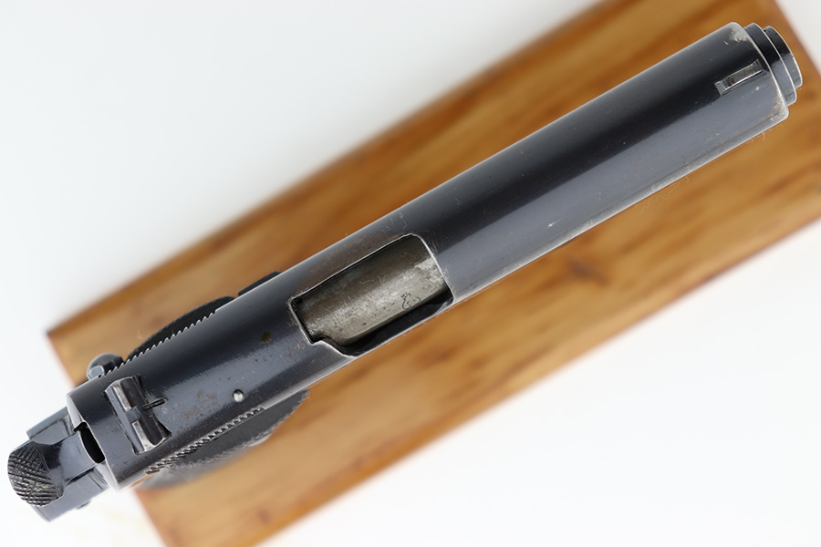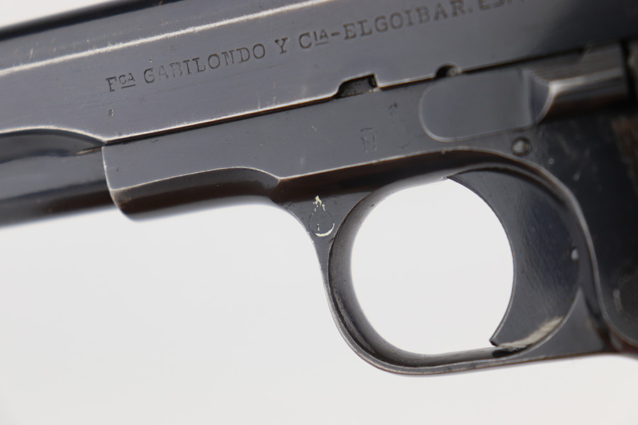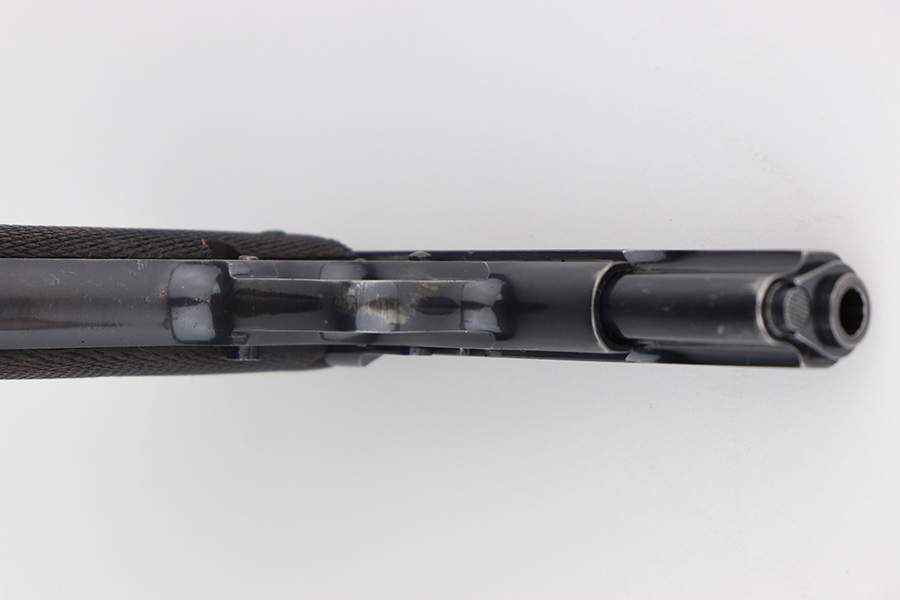 12/1/22 – This is a rare Spanish Llama Model 1 that was imported by Geco into Germany in 1943. Whittington’s book on German pistol estimates only about 1,000 were sold in Germany! What makes this pistol particularly interesting is the “Geco” trademark stamped on the right side of the frame. This indicates that the pistol was marketed in Germany by Gustav Genschow & Co., Hamburg. Like most commercial pistols available in Germany during the war, this pistol would have been sold to a member of the German armed forces or one of the few “approved” German civilians or Nazi Party members. The GC proof on the right side indicates it was originally made for the Spanish Civil Guard, or ‘Guardia Civil’. The pistol is all original with 93% blue remaining. The majority of the wear is around the muzzle and around the high edges of the slide. Some very light spotty wear on the front strap and underside of the trigger. One noticeable spot of discoloration around the ejection port. Fitted with very nice wood grips. The gun comes as a rig with a WW2-era green leather Beretta holster (fits the gun well) and two proper magazines. Minty bore.