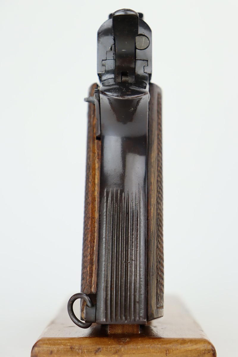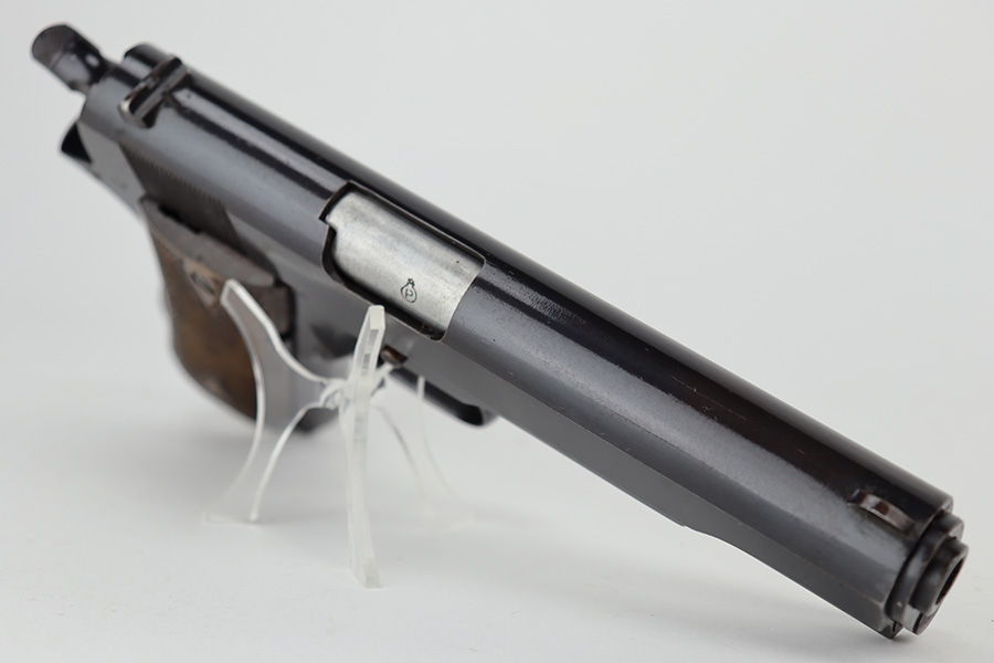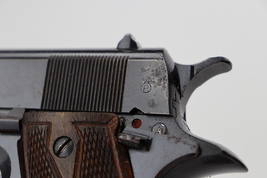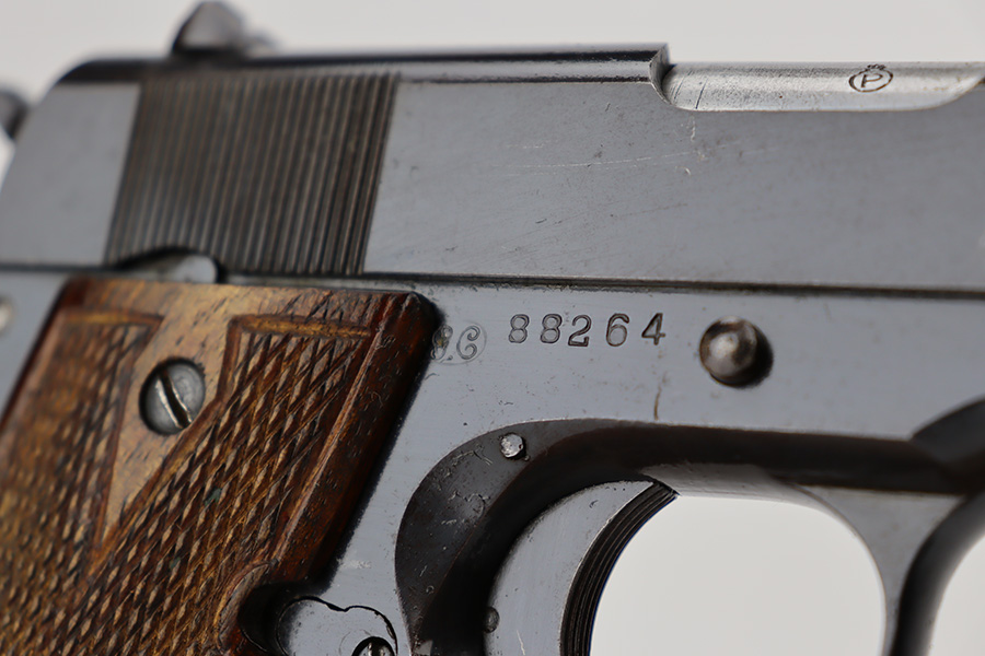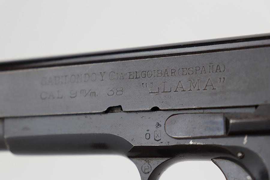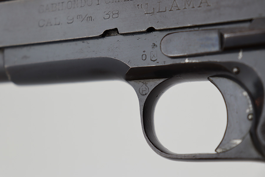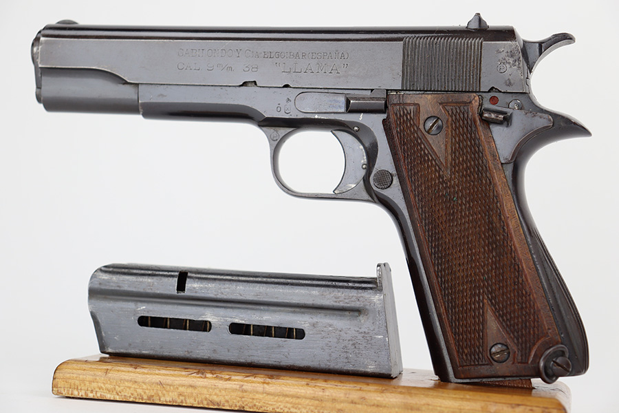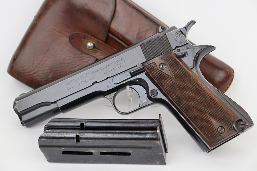 6/20/23 – This is a rare Llama Model IV pistol rig from 1944. Production of this gun started in 1932 and was an exact copy of the Colt 1911 except it has no grip safety and has a barrel 5 1/2″ long, with a 228mm overall length. This was the first of the Llama pistols made and for some reason was later given the designation of model IV. These were not produced for the American market and are not readily found in the USA. The pistol is all original with minimal bluing loss overall, mainly on the high edges from rubbing inside a holster. There is also a patch of wear and freckling on the rear left slide, and some patina on the grip straps. Terrific bore and excellent wood grips. Listing includes an original spare magazine, and also comes with a 1942 dated High Power holster. The holster is ‘epf’ maker marked with sharp waffenamt. It’s in good condition with minor cracking on the mag pouch and a few scratches but no major defects.