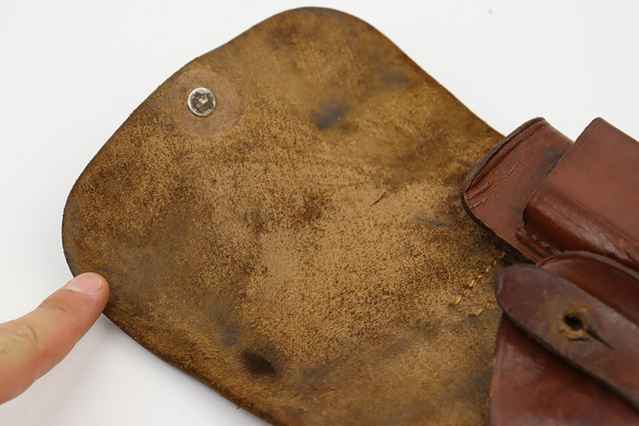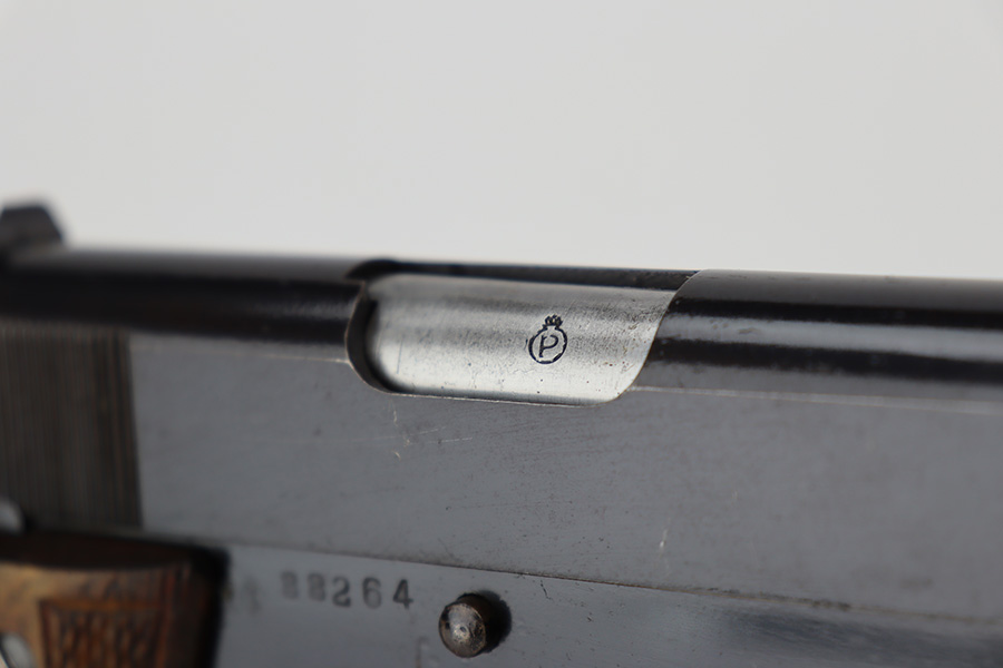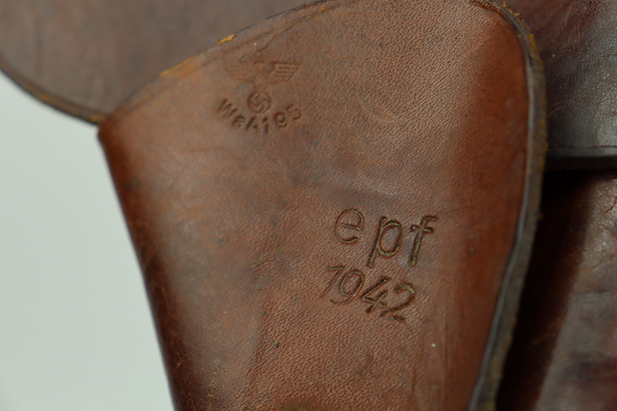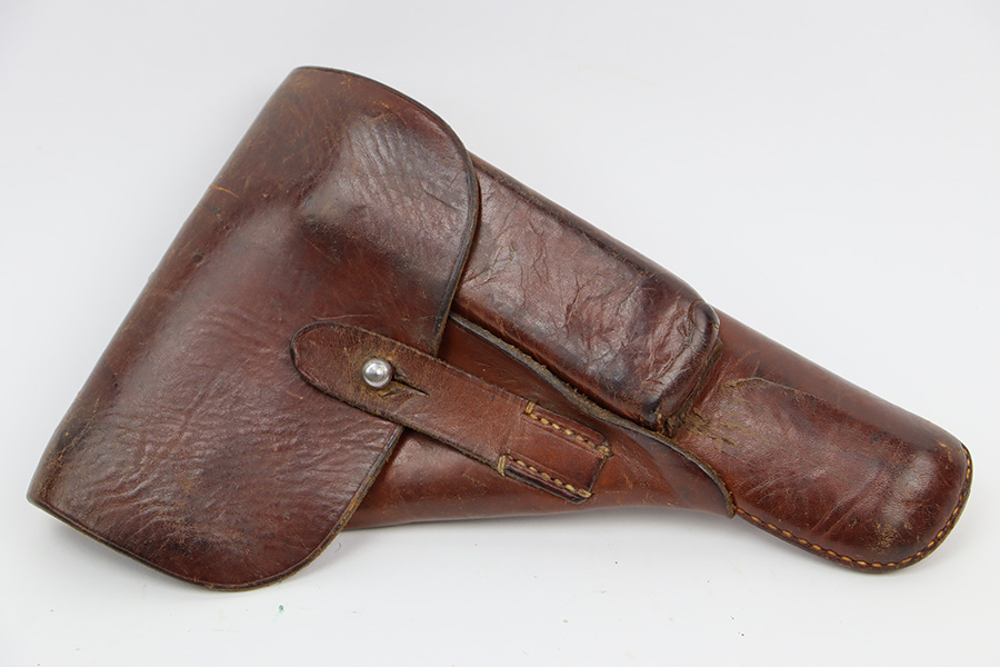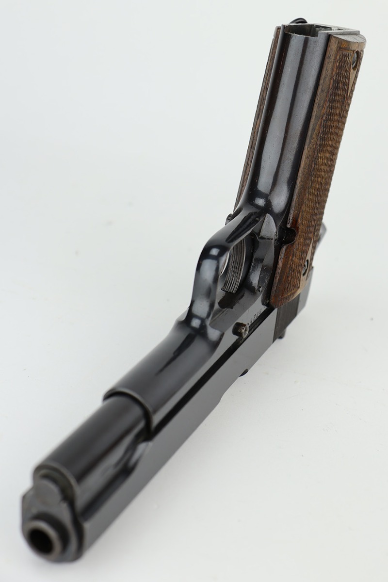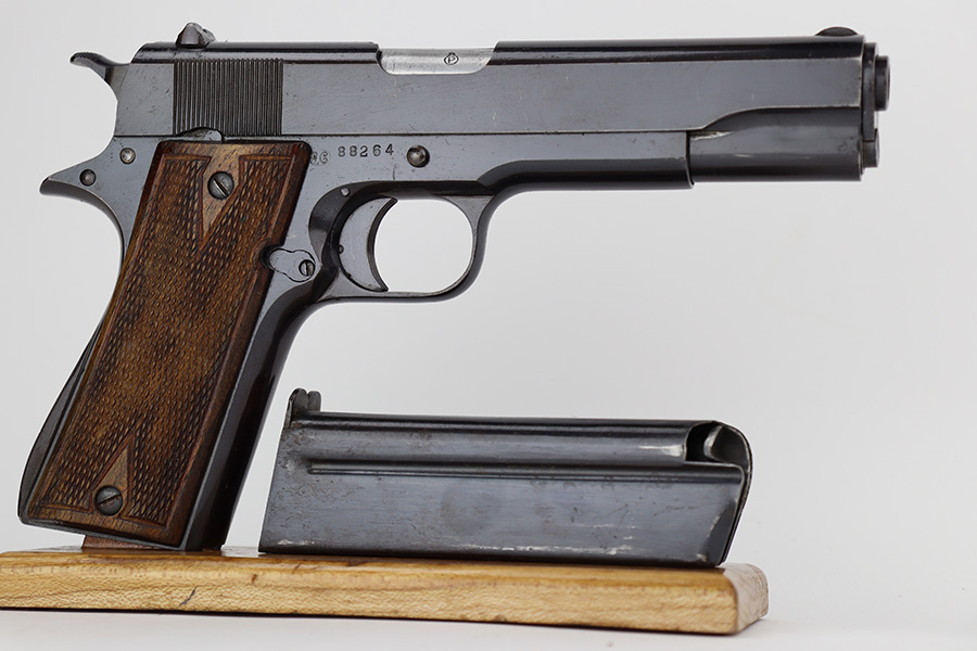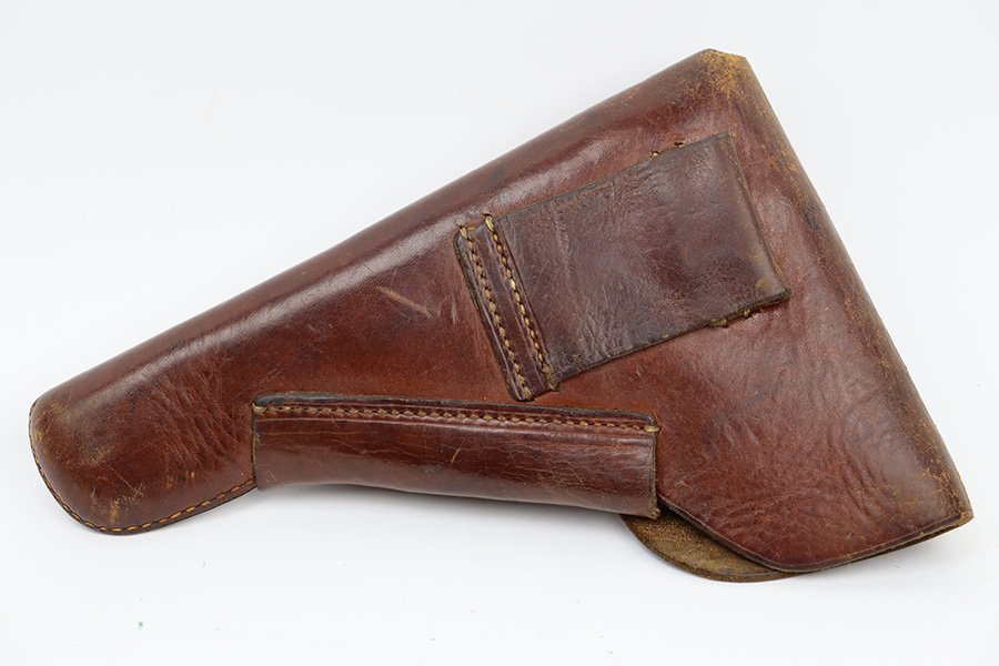 6/20/23 – This is a rare Llama Model IV pistol rig from 1944. Production of this gun started in 1932 and was an exact copy of the Colt 1911 except it has no grip safety and has a barrel 5 1/2″ long, with a 228mm overall length. This was the first of the Llama pistols made and for some reason was later given the designation of model IV. These were not produced for the American market and are not readily found in the USA. The pistol is all original with minimal bluing loss overall, mainly on the high edges from rubbing inside a holster. There is also a patch of wear and freckling on the rear left slide, and some patina on the grip straps. Terrific bore and excellent wood grips. Listing includes an original spare magazine, and also comes with a 1942 dated High Power holster. The holster is ‘epf’ maker marked with sharp waffenamt. It’s in good condition with minor cracking on the mag pouch and a few scratches but no major defects.