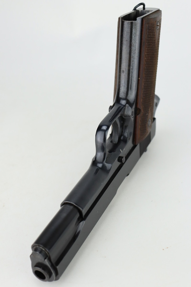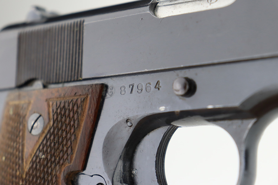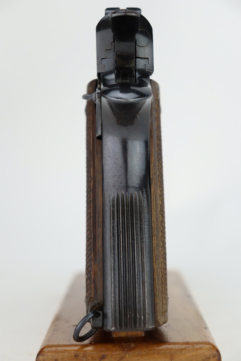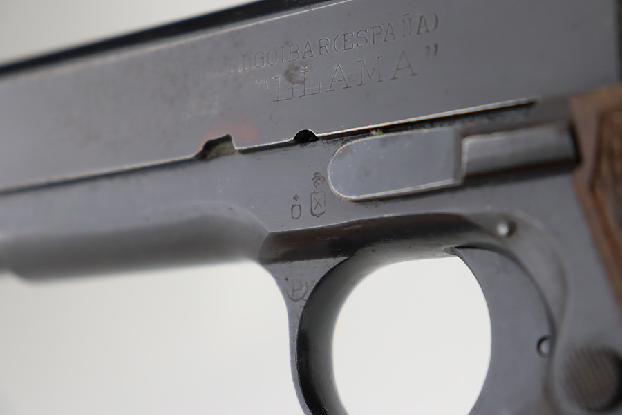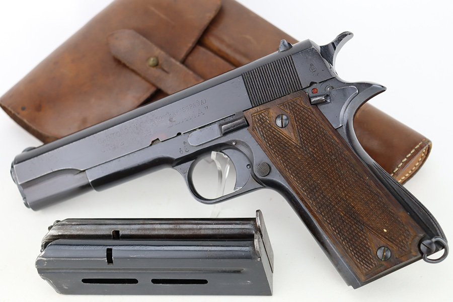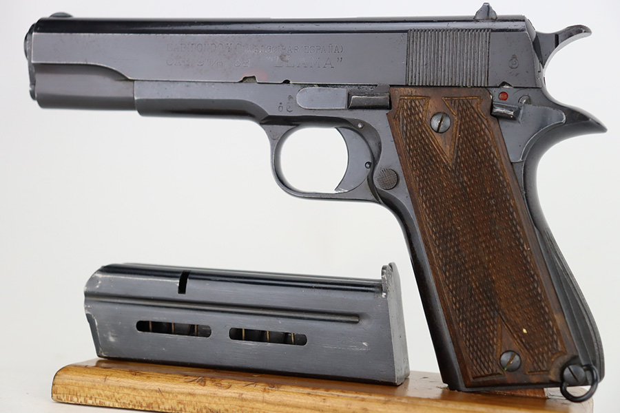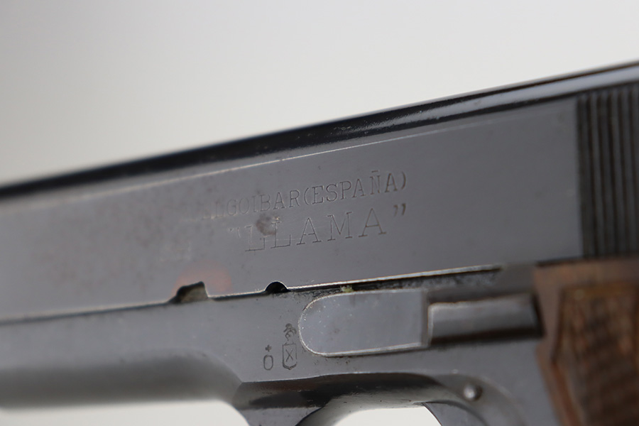 1/1/24 – This is an excellent example of a rare Llama Model IV pistol rig from 1944. Production of this gun started in 1932 and was an exact copy of the Colt 1911 except it has no grip safety and has a barrel 5 1/2″ long, with a 228mm overall length. This was the first of the Llama pistols made, and for some reason, was later given the designation of model IV. These were not produced for the American market and are not readily found in the USA. This one is all matching and has the proper Spanish proofs. It comes as a rig with a very nice tan leather holster and two magazines. The finish rates about 97%. While there is very little actual finish loss, there is pin-pricking on the grip straps. Fitted with very nice wood grips. Minty bore.