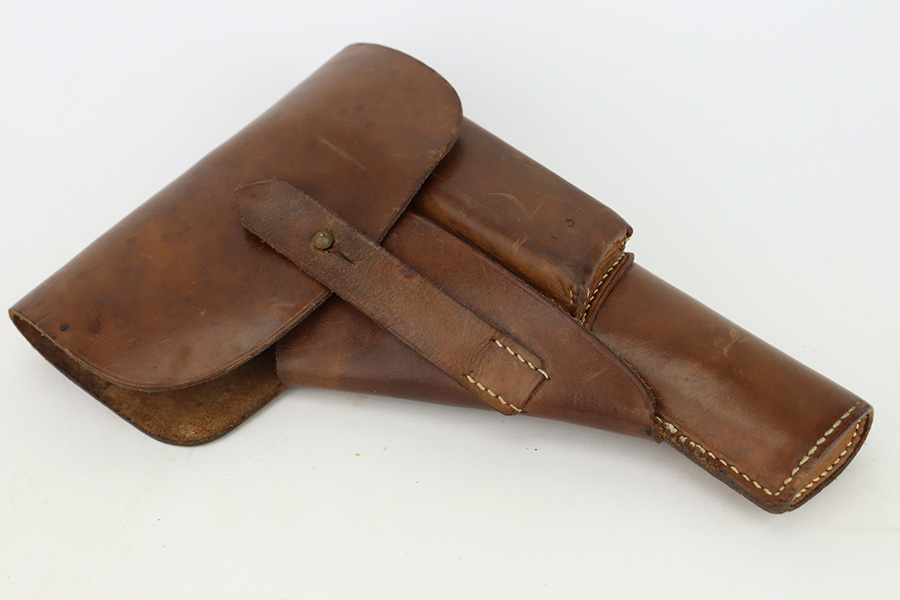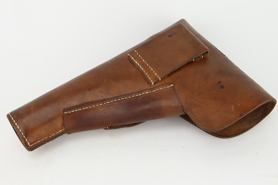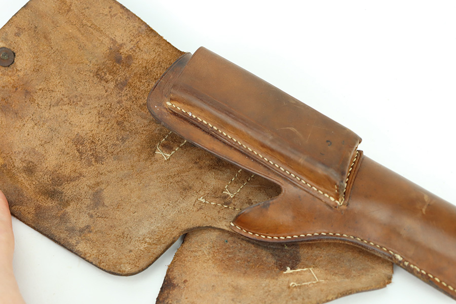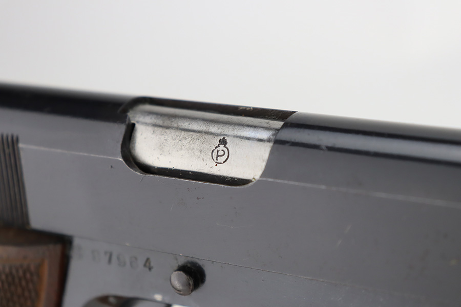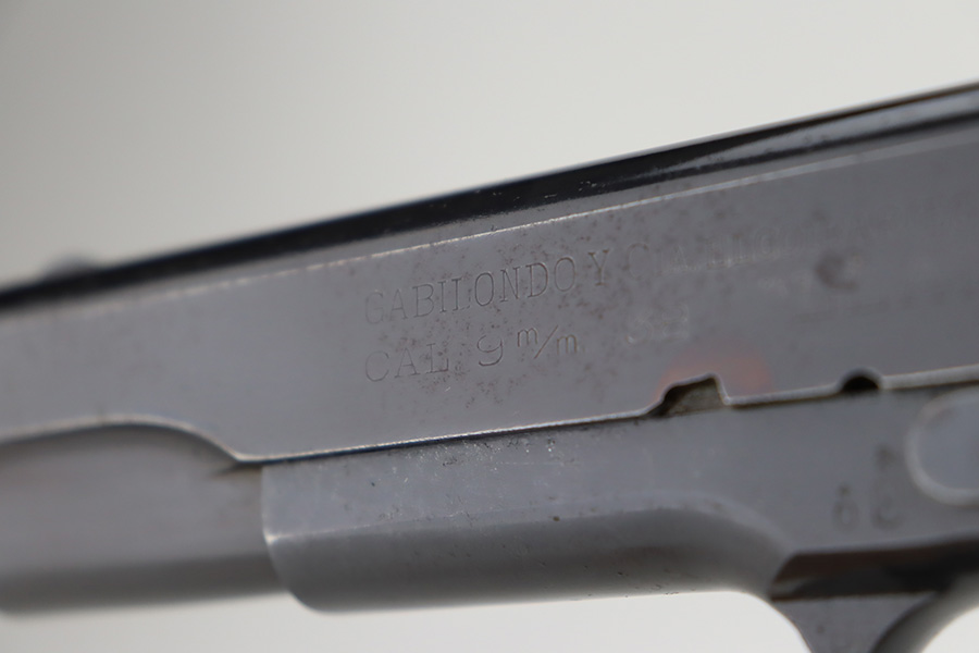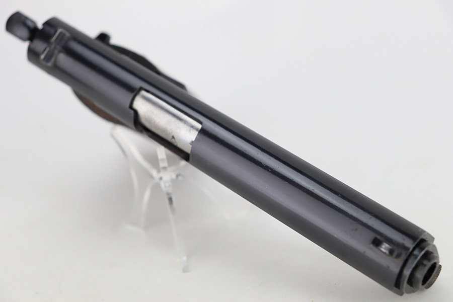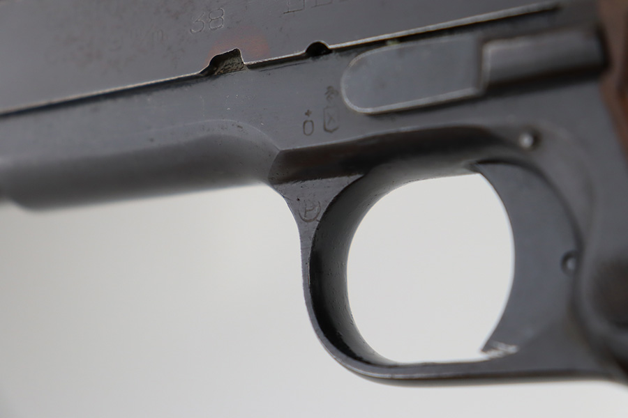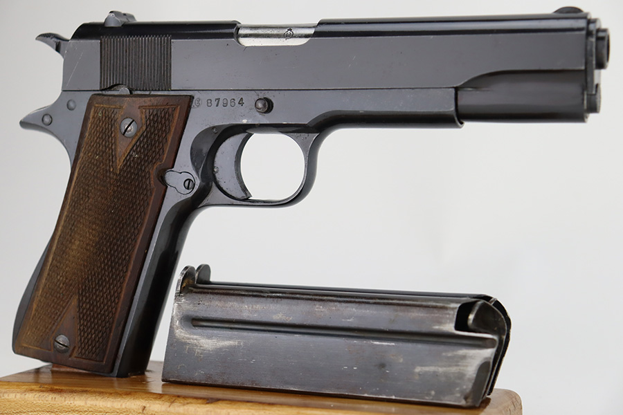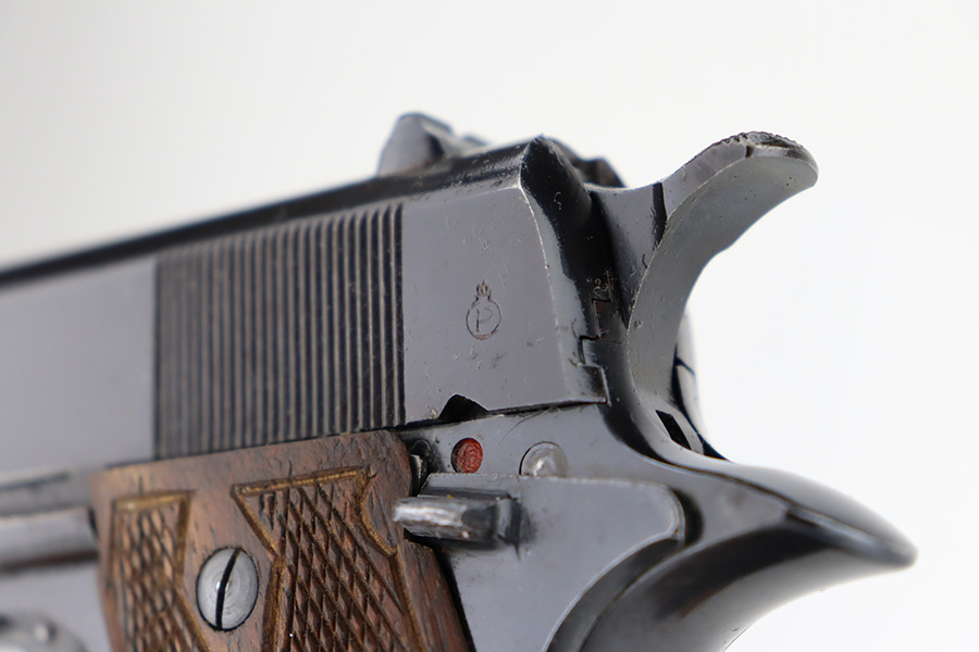 1/1/24 – This is an excellent example of a rare Llama Model IV pistol rig from 1944. Production of this gun started in 1932 and was an exact copy of the Colt 1911 except it has no grip safety and has a barrel 5 1/2″ long, with a 228mm overall length. This was the first of the Llama pistols made, and for some reason, was later given the designation of model IV. These were not produced for the American market and are not readily found in the USA. This one is all matching and has the proper Spanish proofs. It comes as a rig with a very nice tan leather holster and two magazines. The finish rates about 97%. While there is very little actual finish loss, there is pin-pricking on the grip straps. Fitted with very nice wood grips. Minty bore.